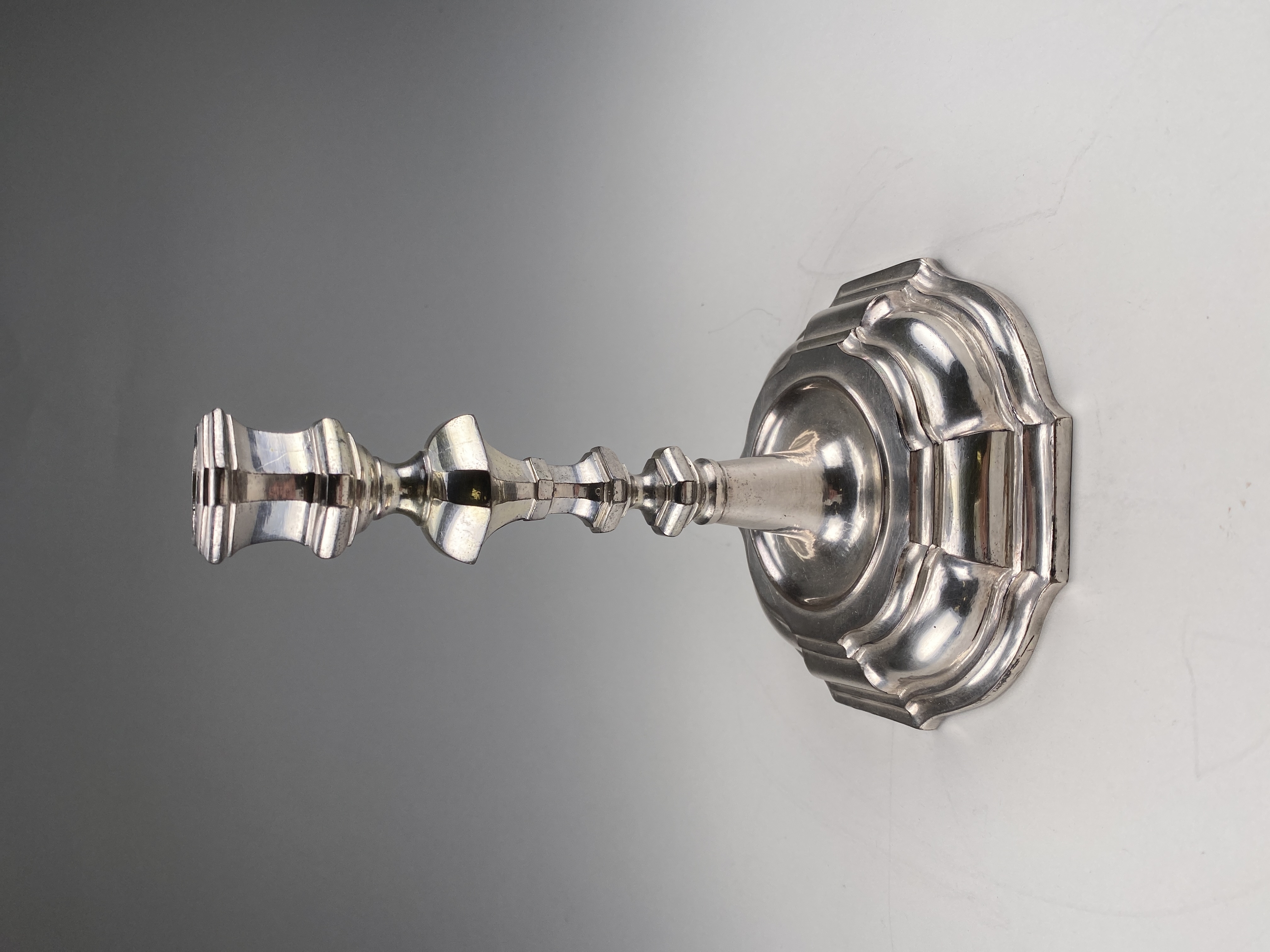 Ljusstake i silver. Åttkantig fot med varannan sida utsvängd, rikt profilerad och efter kort rund ansats övergående i åttkantigt balusterliknande skaft och åttkantig, profilerad ljuspipa. Inskrift på nedre kanten IL. Mästare Lucas van der Hagen, Stockholm 1733. Hittad i kittel A.