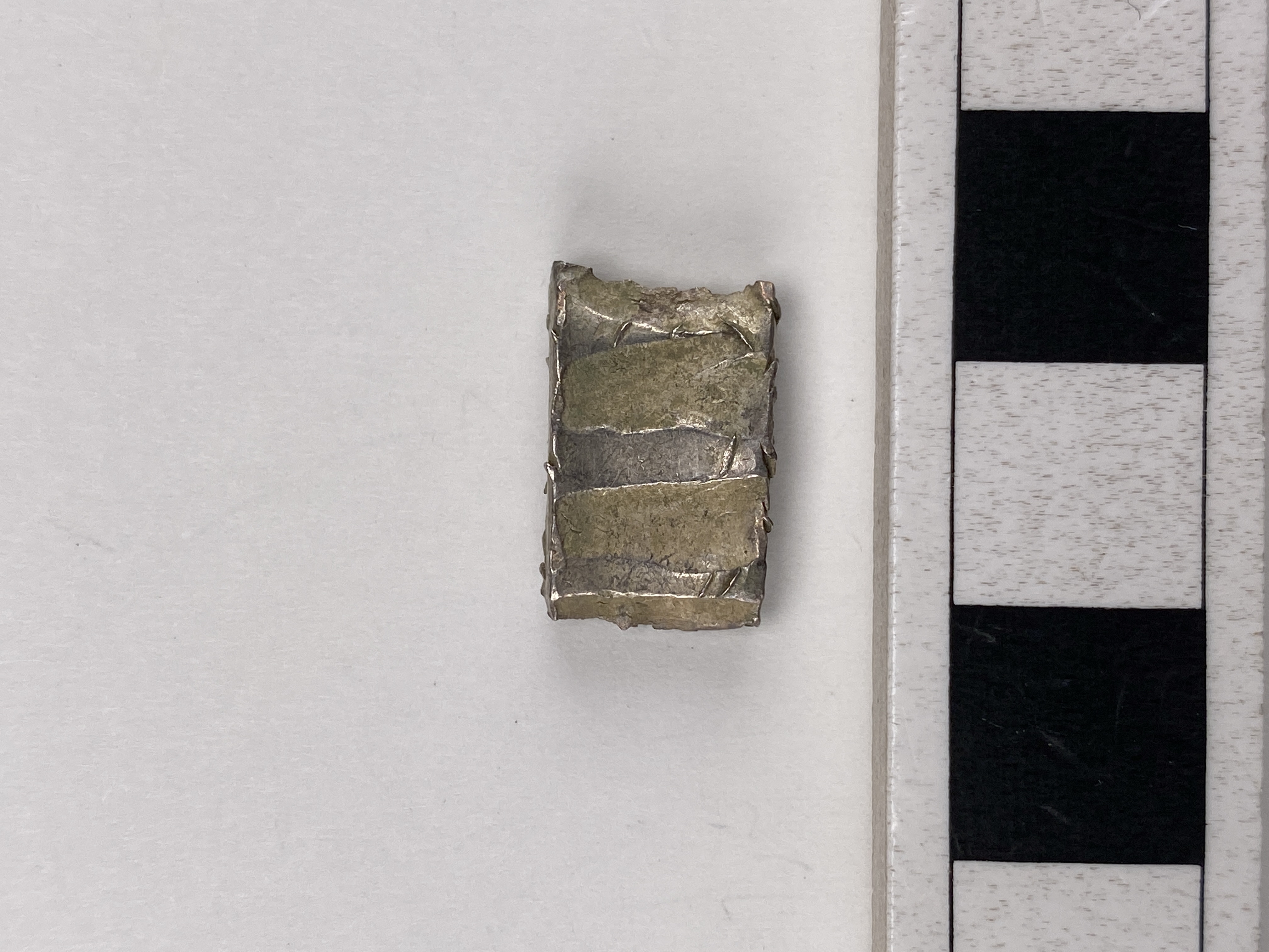 Fragment av bandformig barr. Inslagna (?) linjer tvärs över ryggen.