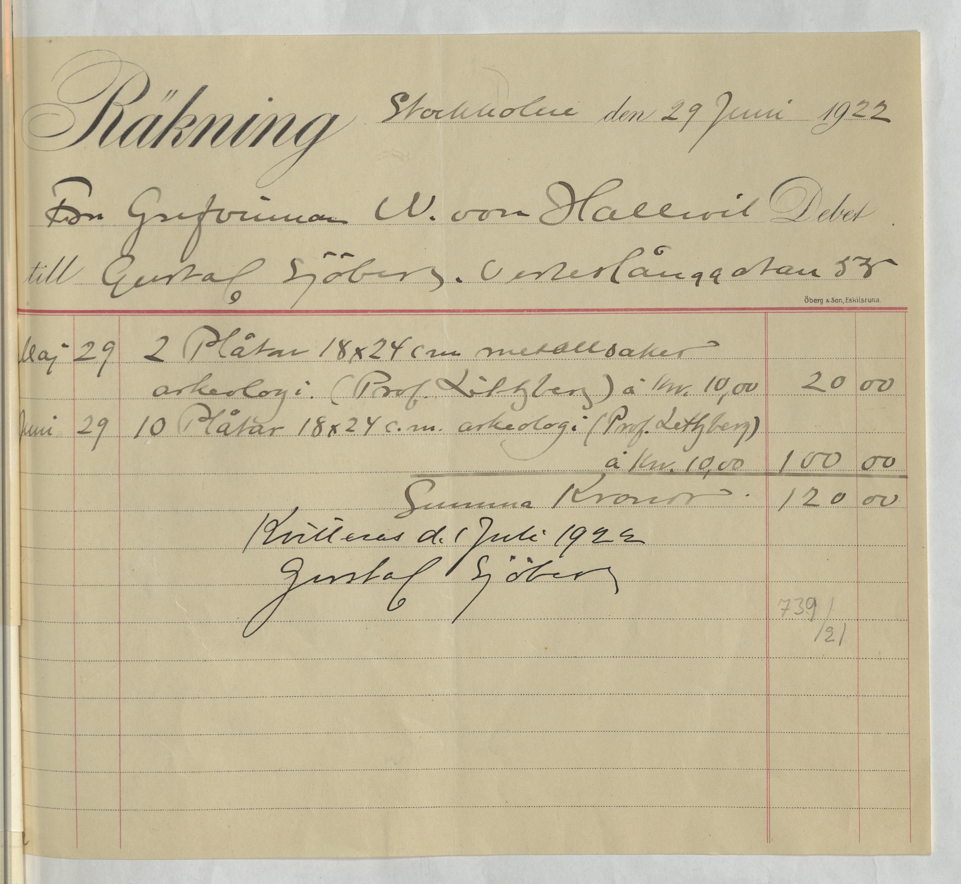 Kvitto från Gustaf Sjöberg. Gällande betalning för hans arbete med fotografering av museisamlingarna. Stockholm, 1922.