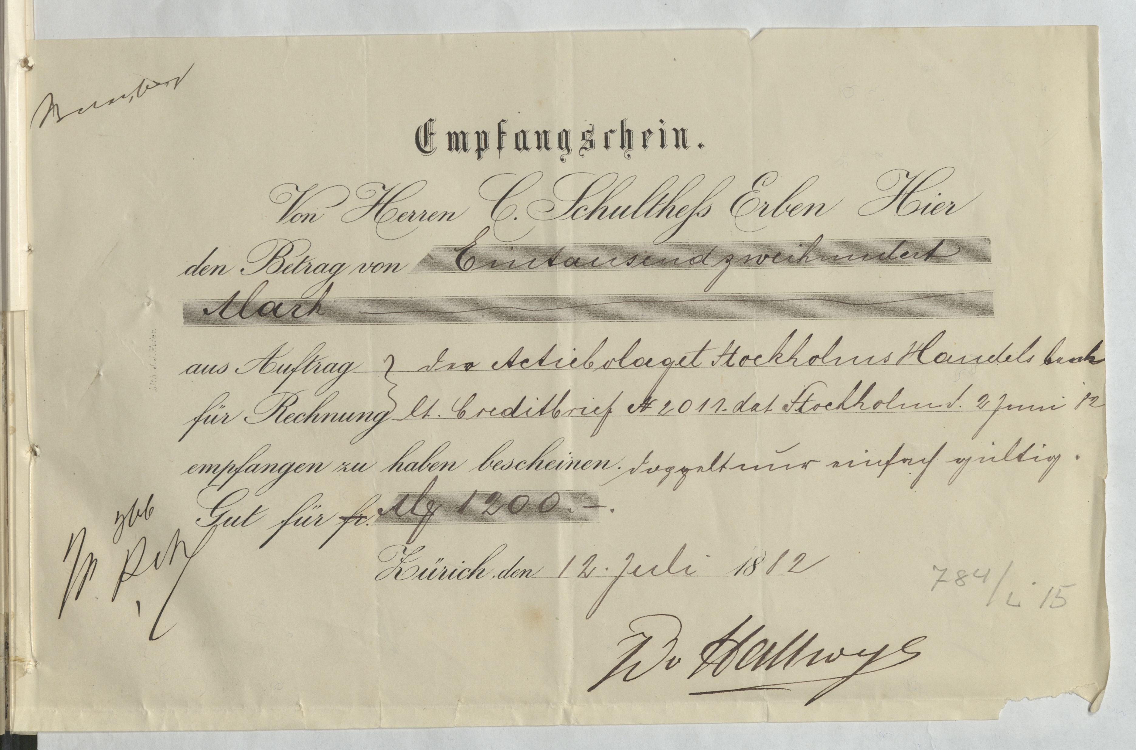 Kvitto rörande Schultess Erben, Zürich