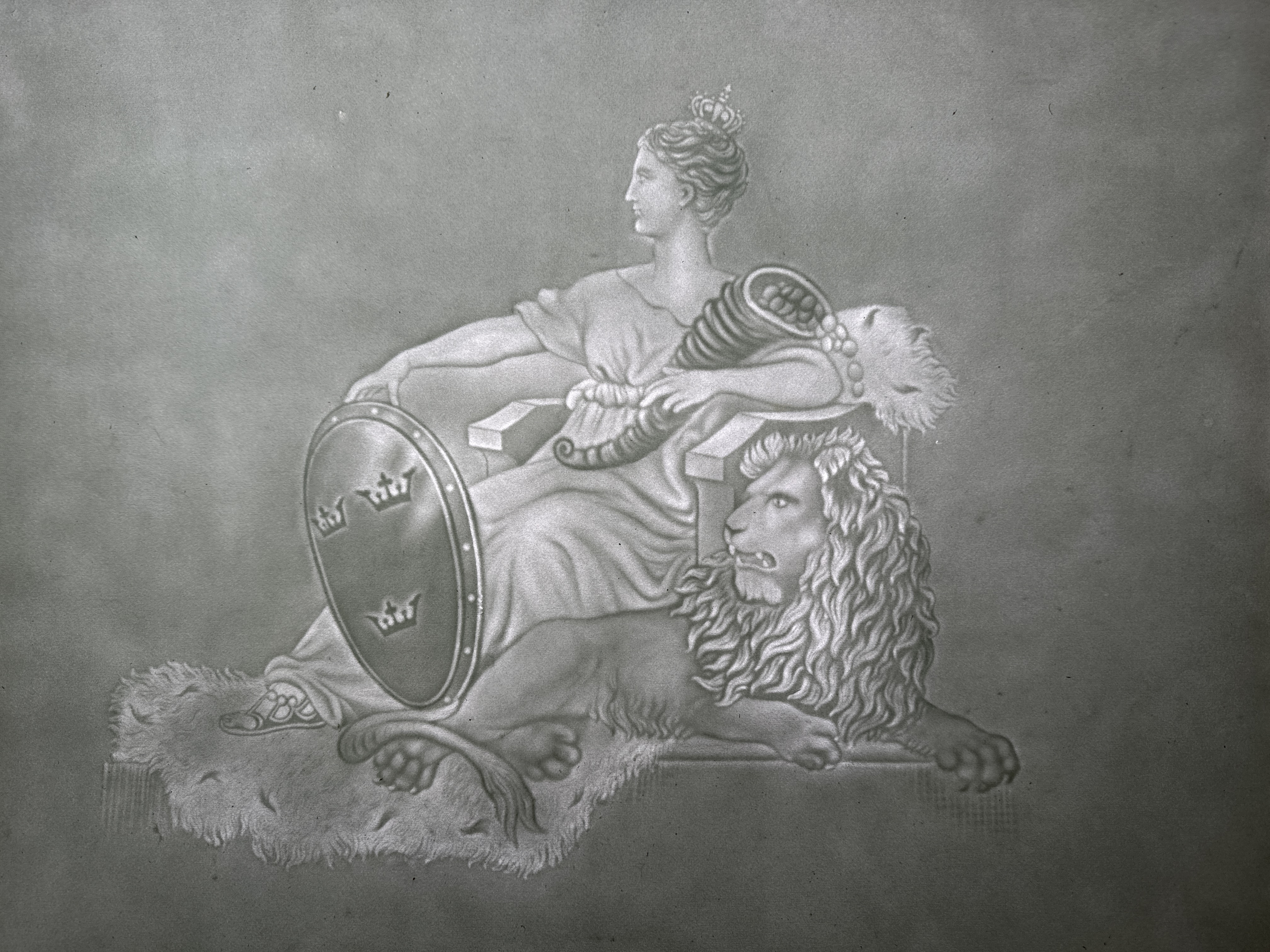 Handgjort papper med vattenmärke föreställande "Sittande Svea" (jfr. 1890 års sedelserie: Sittande Svea med baksidan "Gustav Vasa"). Stort ark.