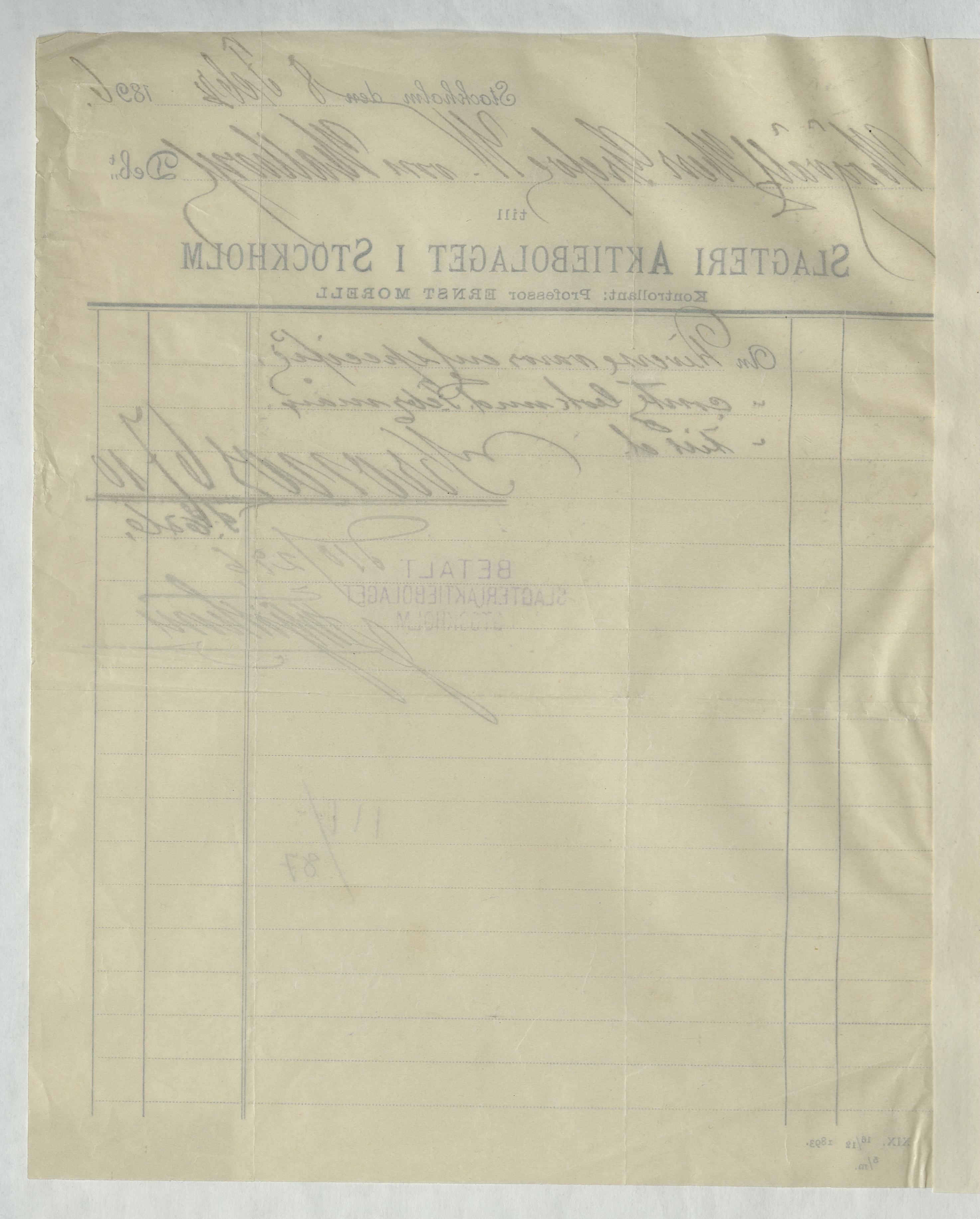 Kvitto från Slagteri Aktiebolaget i Stockholm