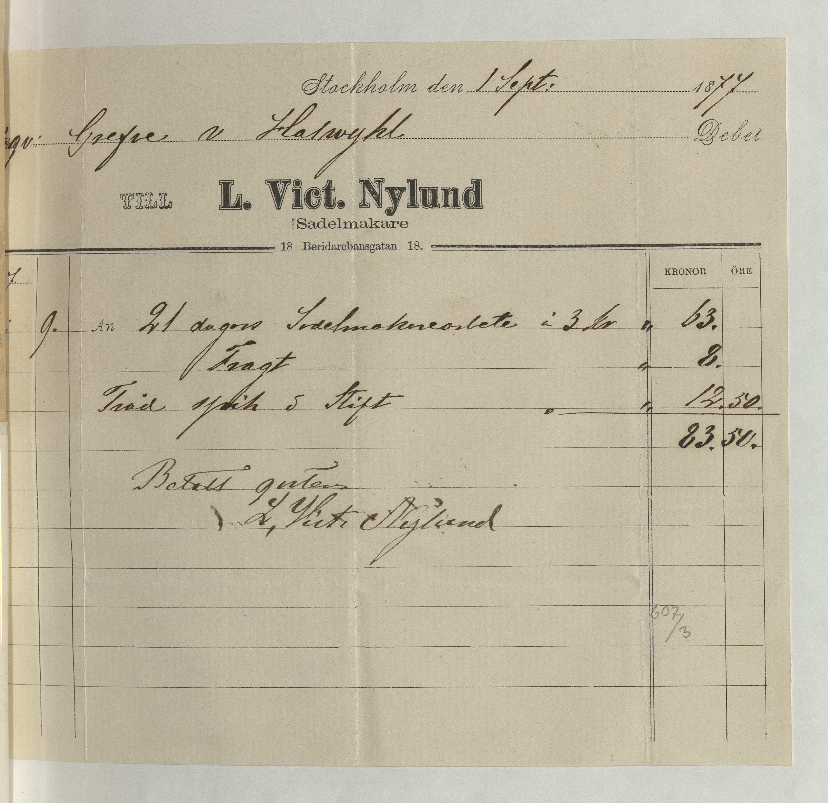 Kvitto från Victor L. Nylund, Sadelmakare, på en summa av 83:50Kr. Stockholm 1 september 1877.