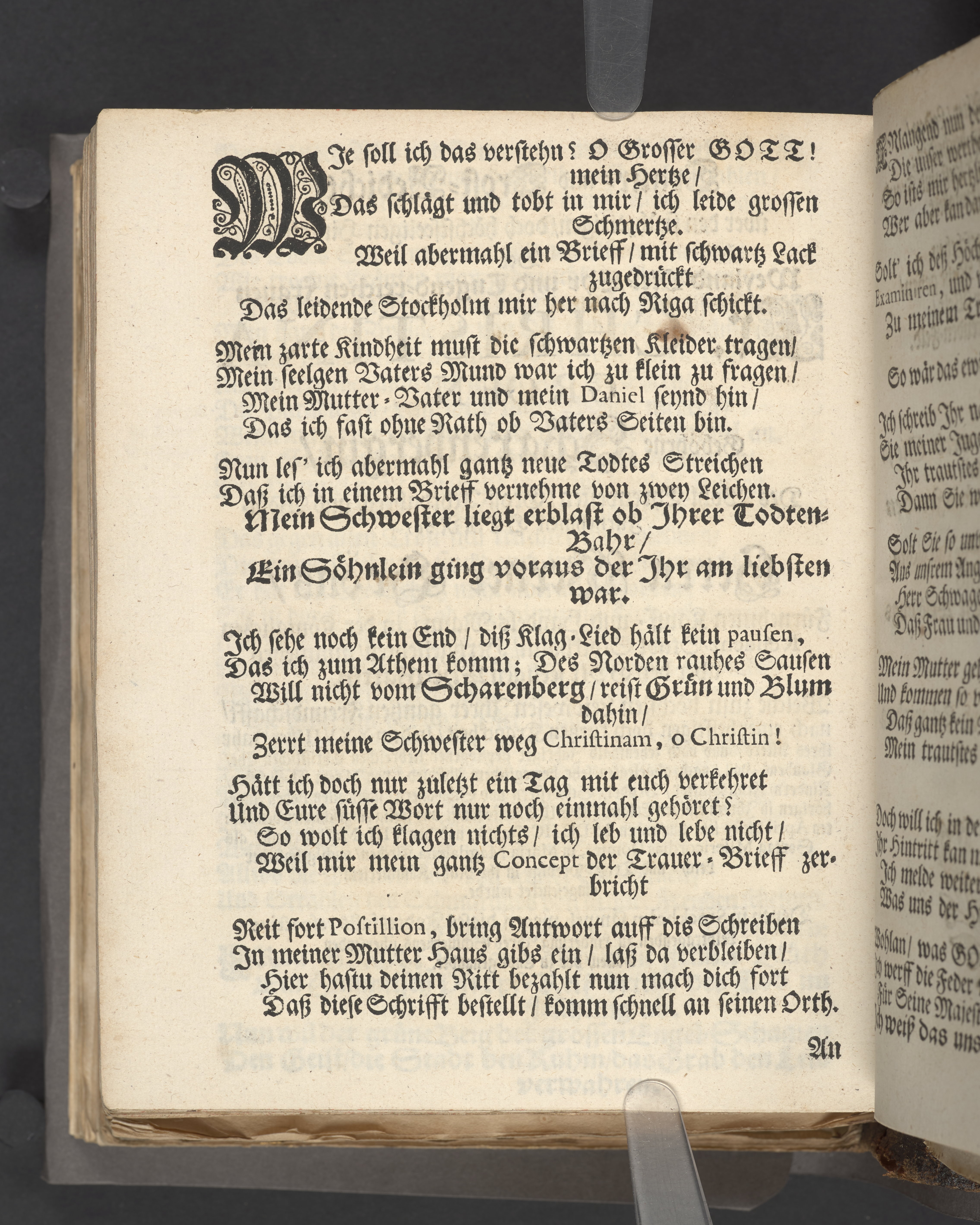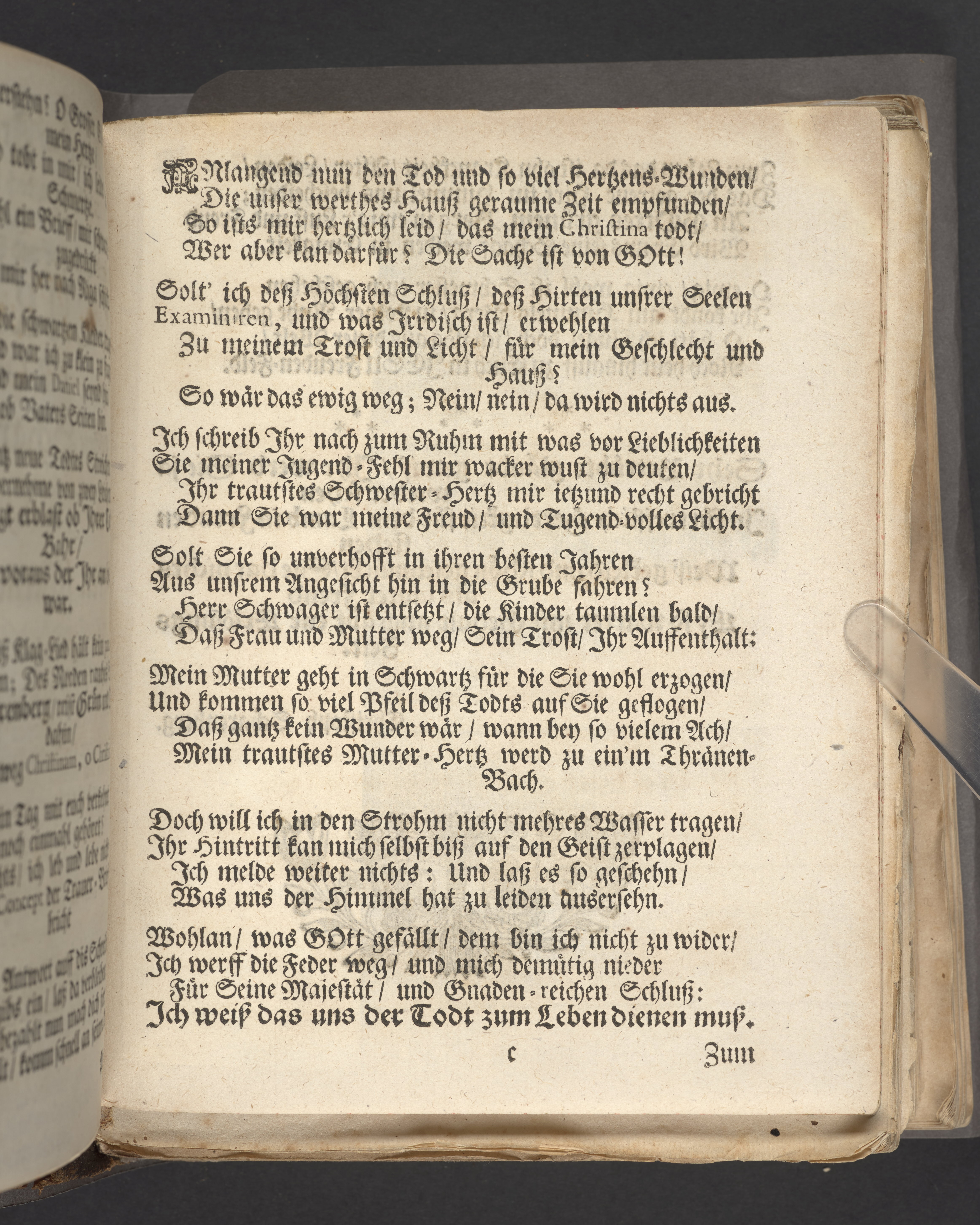Traur- und Trost-Gedicht/ über den frühzeitigen/ doch höchtsseeligen Hintritt/ der Weyland Viel- Ehr und Tugend-reichen Frauen Fr. Christina Groen gebohrne Scharenberin/ des Wohl-Ehrenfesten/ Grosz-Achtbahren/ und wohl-fürnehmen Herrn/ Herrn Werner Gröns/ fürnehmen Kauff- und Handels-Mann/ in der königlichen Residenz-Stadt Stockholm/ hertzgeliebten/ nunmehro aber bey Gott seeligen Ehe-Gattin. Welche zum höchsten Liedwesen Ihrer gantzen Freunschafft/ nach einer hefftigen doch kurtzen Krankheit/ in dem XXVIIsten Jahr ihres Alters/ und nach zehenshalb Jähriger gepflogener liebreichen Christlichen Ehe/ Glaubens-voll/ nach abgelegten sehr beweglichem Abschied/ von Ihrem Eh-Liebsten/ Kindern/ Frau Mutter/ Bruder/ Schwestern und Schwäger/ samt allen Lieben Angehörigen in Ihrem einigen Erlöser JESU Christo sanfft und seelig eingeschlaffen den IX:ten April dieses letzt lauffenden MDCIIC. Jahrs/ und den VIII. Maij hernach/ als Sontag Misericordias Domini, in Maria Magdalena Kirchen/ nach gehaltener Liech- und Trost- Predigt in ihr Ruh-Kämmerlein eingesencket wurde. Denen in Stockholm sämptl. wegen dieses Todtesfalls respective Leidtragenden zu Linderung Ihres Schmertzens übersenden wollen/ der zu Ende genandte.