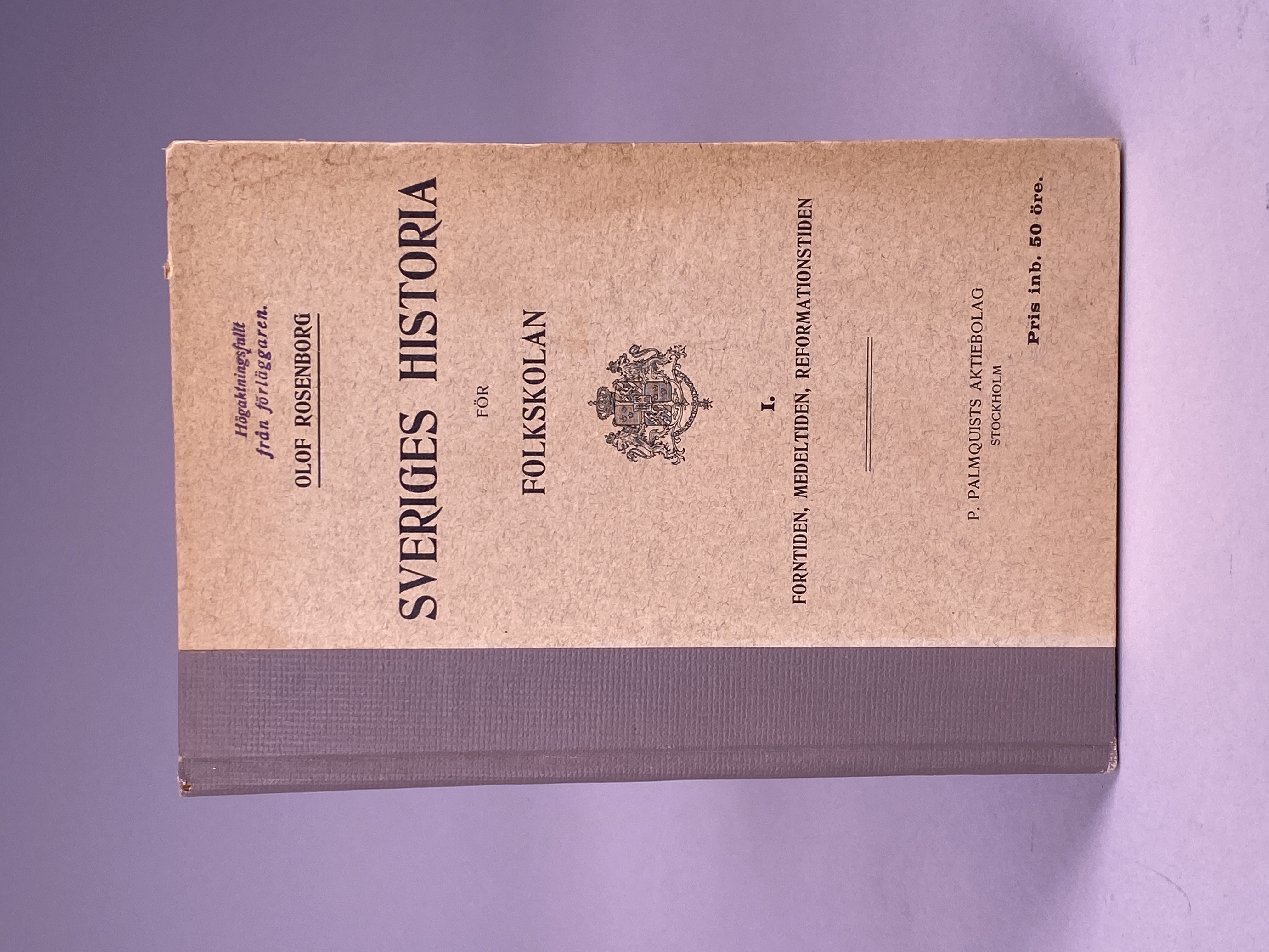 Bok. "Sveriges historia för folkskolan. Av Olof Rosenborg. I. Forntiden, medeltiden, reformationstiden". Boken med brun klotrygg och pärmar av gulbrun papp. Framsidan med titel tryckt i svart, samt med litet tryck föreställande stora riksvapnet. Pärmarnas insida klädda i papper med blå fibrer. Tryckt år 1907 av P. Palmquists Aktiebolag, i Stockholm.