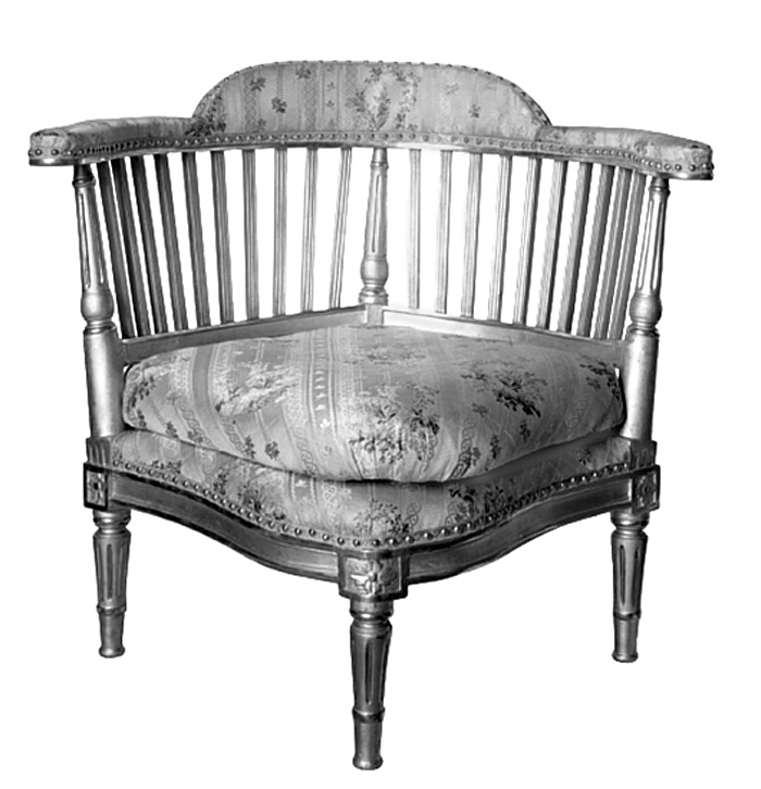 LÄNSTOL, s k puderstol. Okänd tillverkning. H 65,5 B 65 Djup 65. Snidad, svarvad samt förgylld björk. Inköpt av Wilhelmina von Hallwyl 1896 hos antikhandlare Sigrid Sundborg för 55 kr. Klädd med sidentyg, s.k. drogett, tillverkad på beställning hos firma G & R Hamot. Del av möbeluppsats VI:II:A.a.14. bestående av två taburetter, en puderstol och två stolar.