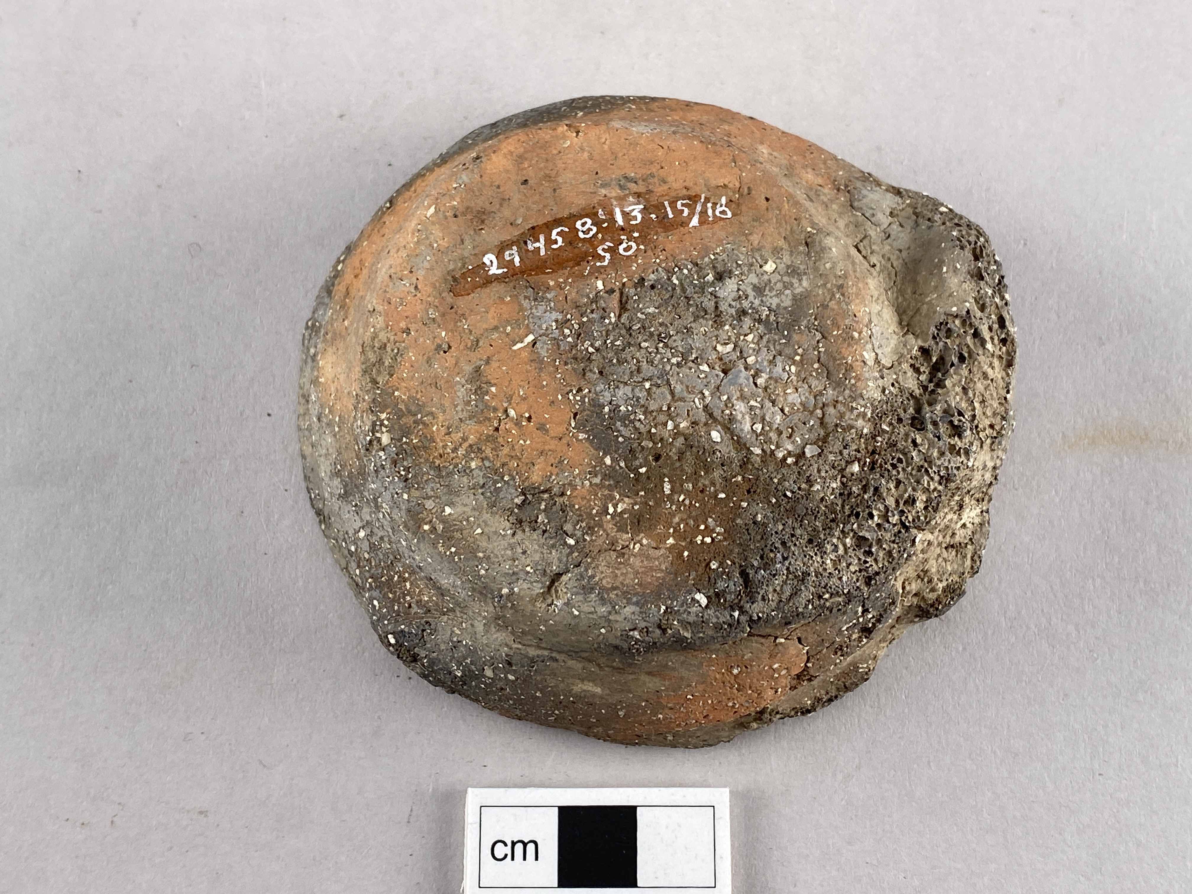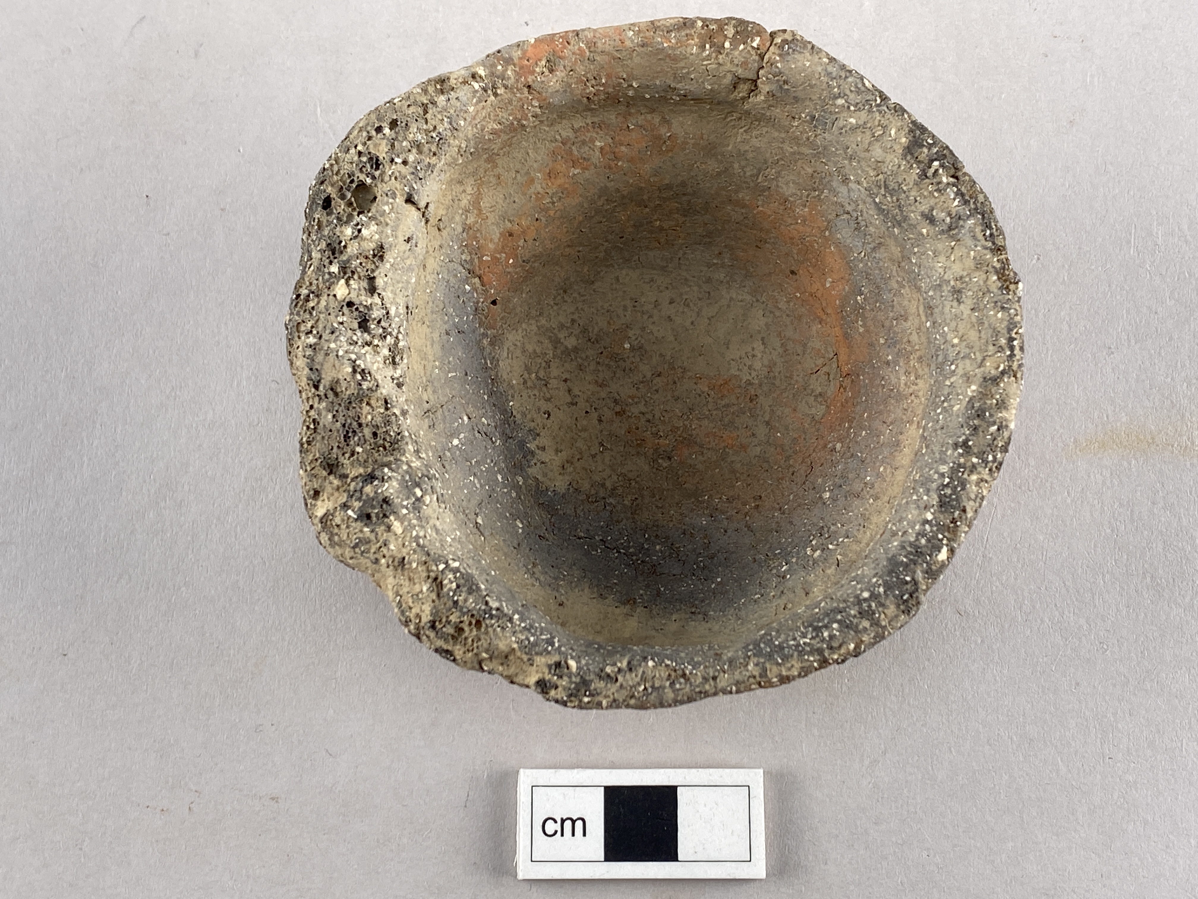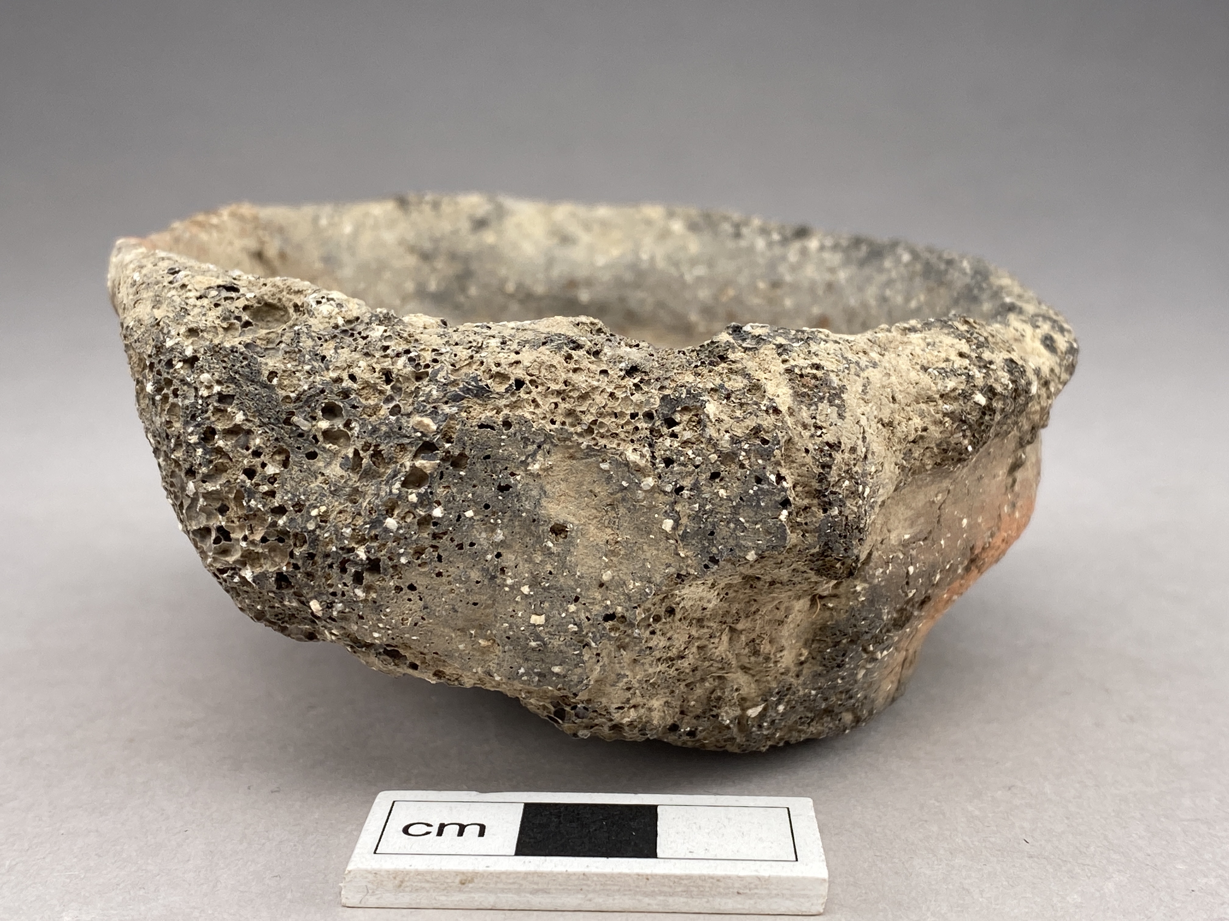 Hel liten karinerad skål. Ena sidan och mynningen är starkt förslaggad. Oxiderat bränt. glättad yta. Skålen kan eventuellt ha haft ett öra men detta är i så fall helt försmält.