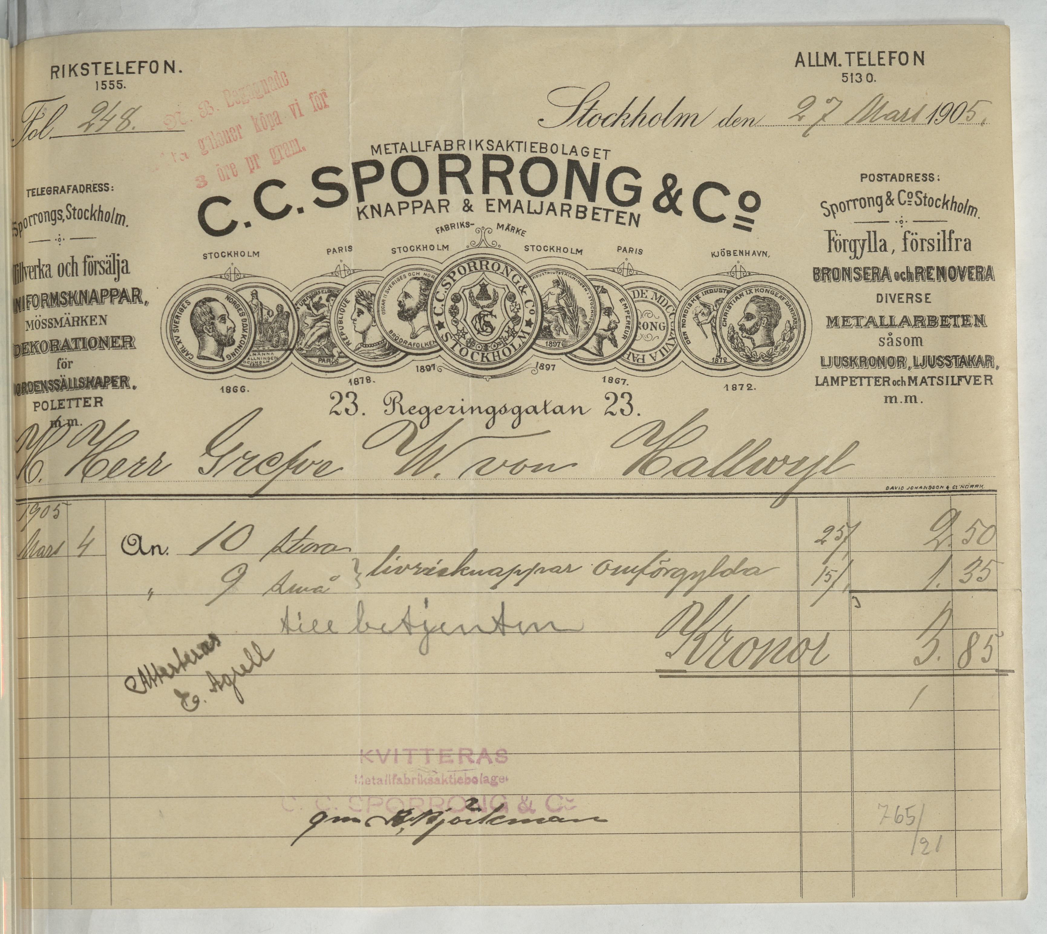 Kvitto från Metallfabriksaktiebolaget C. C. Sporrong & Co. Knappar & Emaljarbeten. Gällande omförgyllning av 10 stora och 9 små livréknappar till betjänten. Stockholm, 1905.