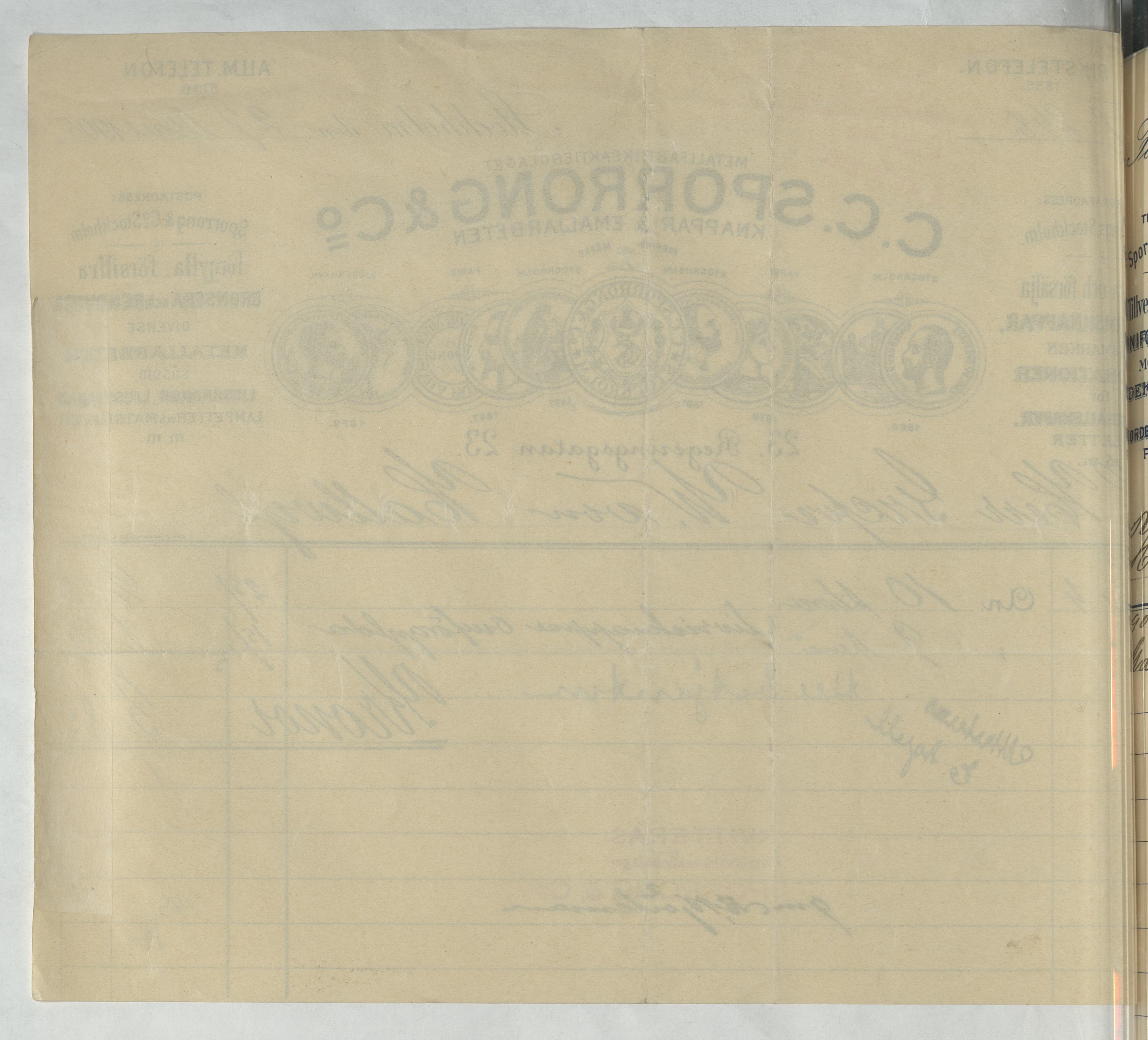 Kvitto från Metallfabriksaktiebolaget C. C. Sporrong & Co. Knappar & Emaljarbeten