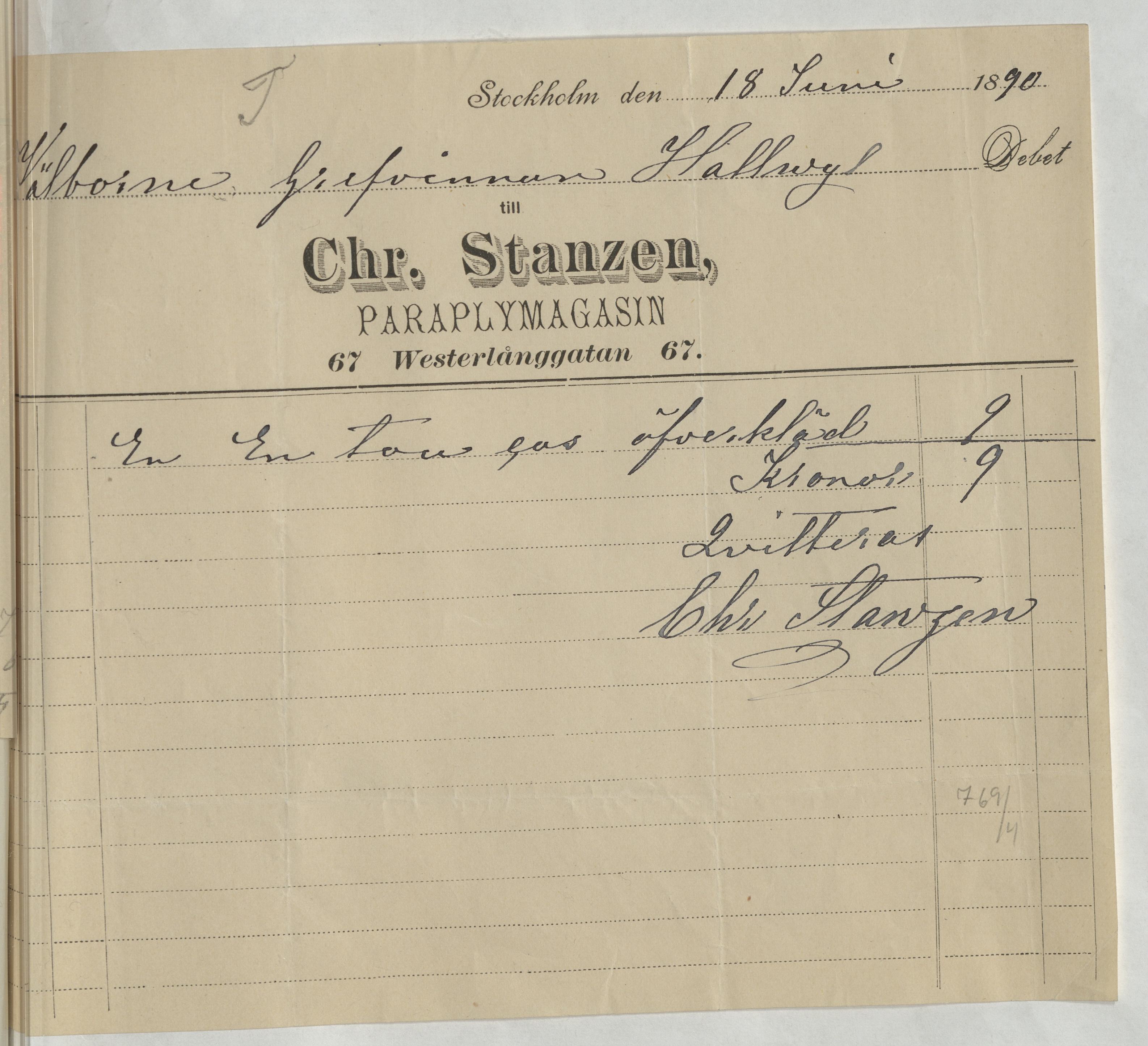 Kvitto från Chr. Stanzen Paraplyfabrik. Stockholm, 1890.