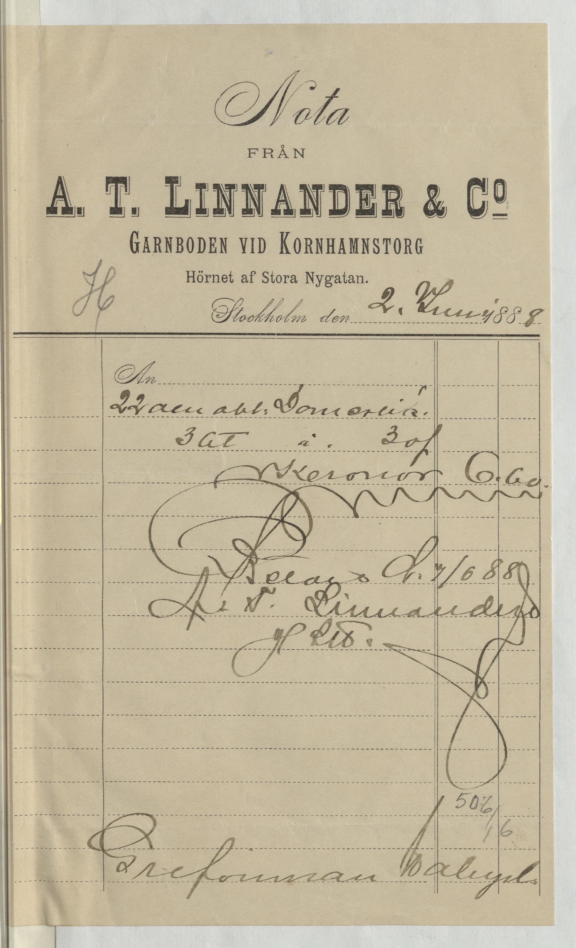 Kvitto från A. T. Linnander & Co. Garnboden vid Kornhamnstorg. Stockholm, 1888.