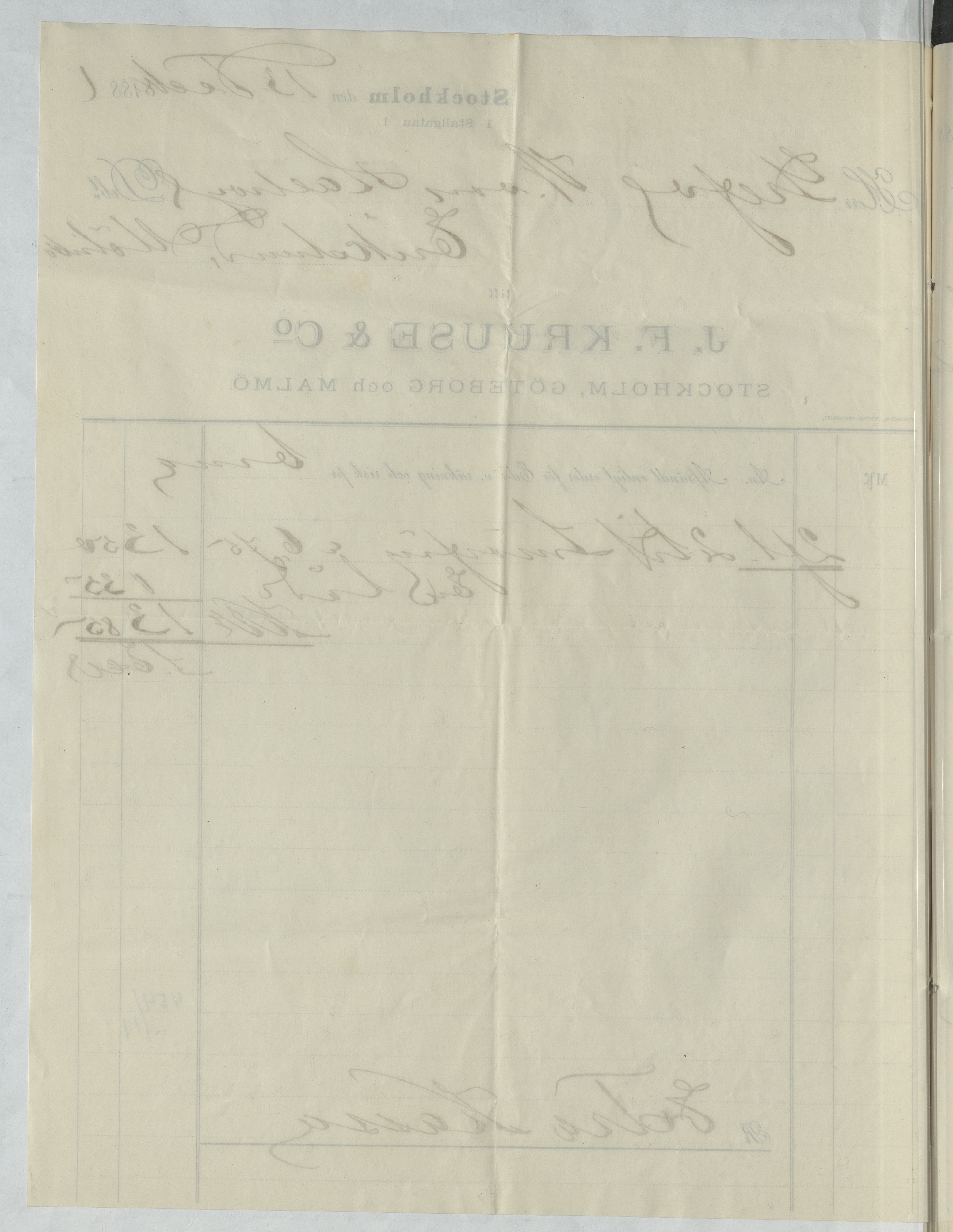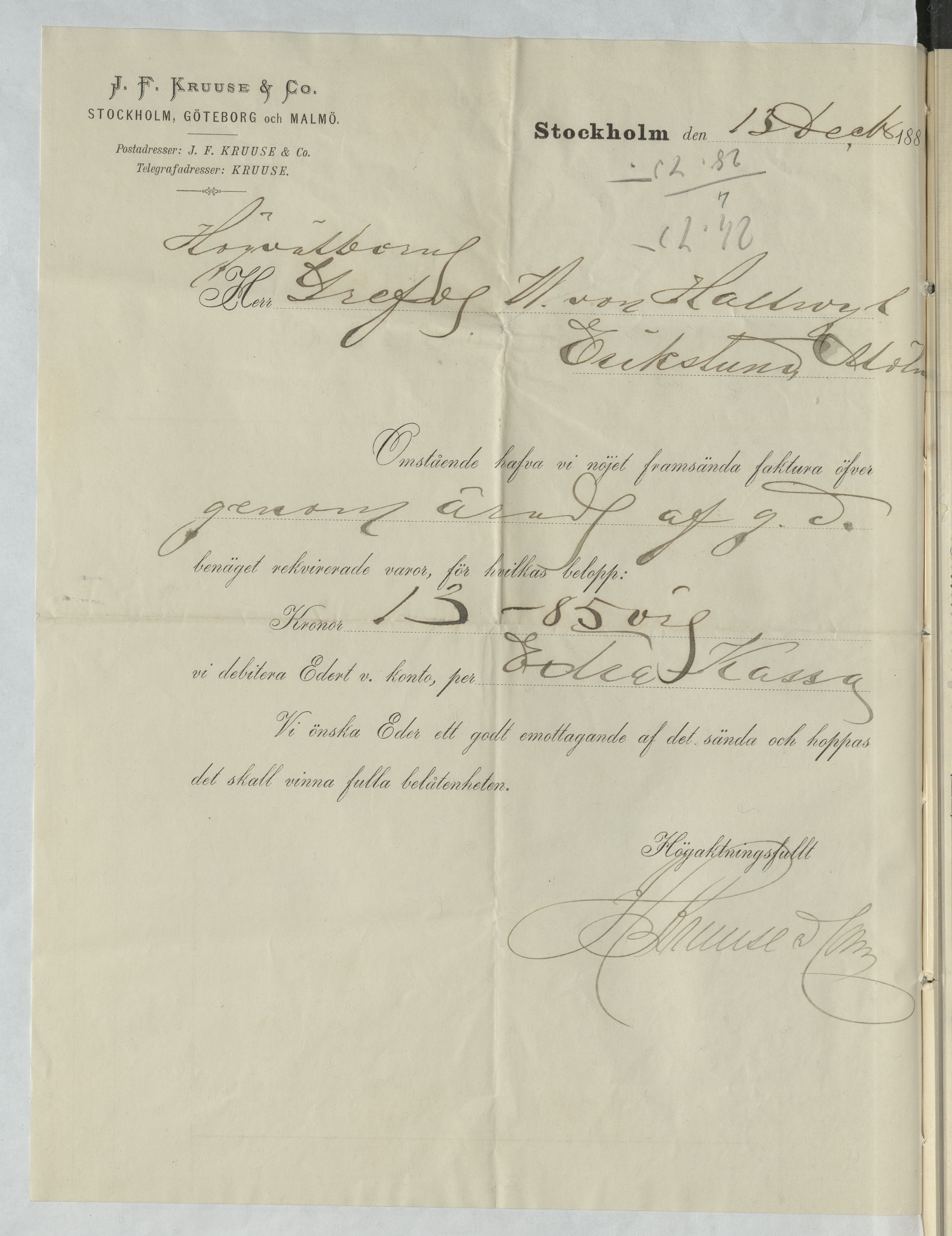 Kvitto från J. F. Kruuse & Co. Stockholm, 1881.