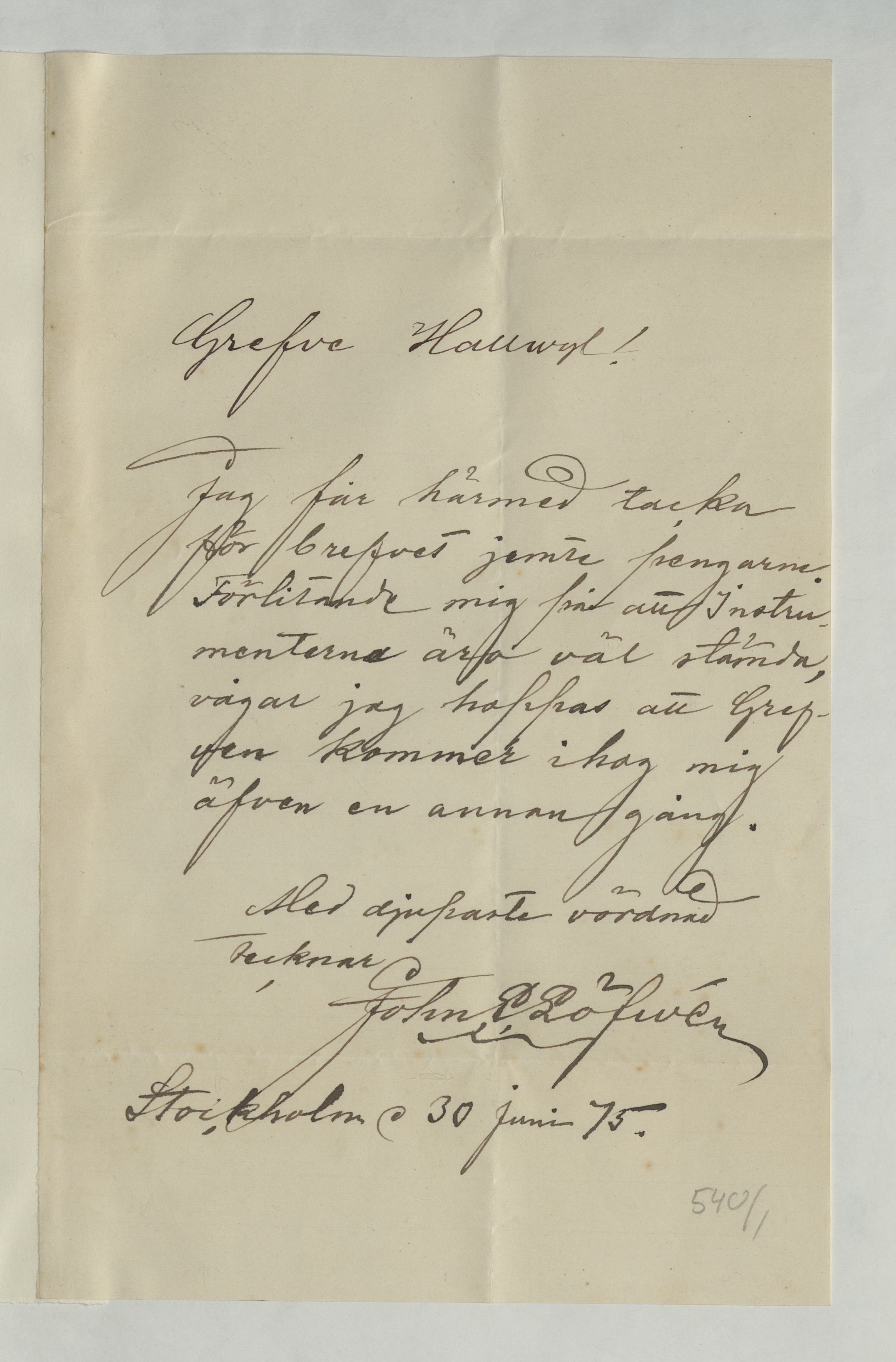 Kvitto från John E. Löfwén, Hoffmans Pianofabrik. Stockholm 30 juni 1875.