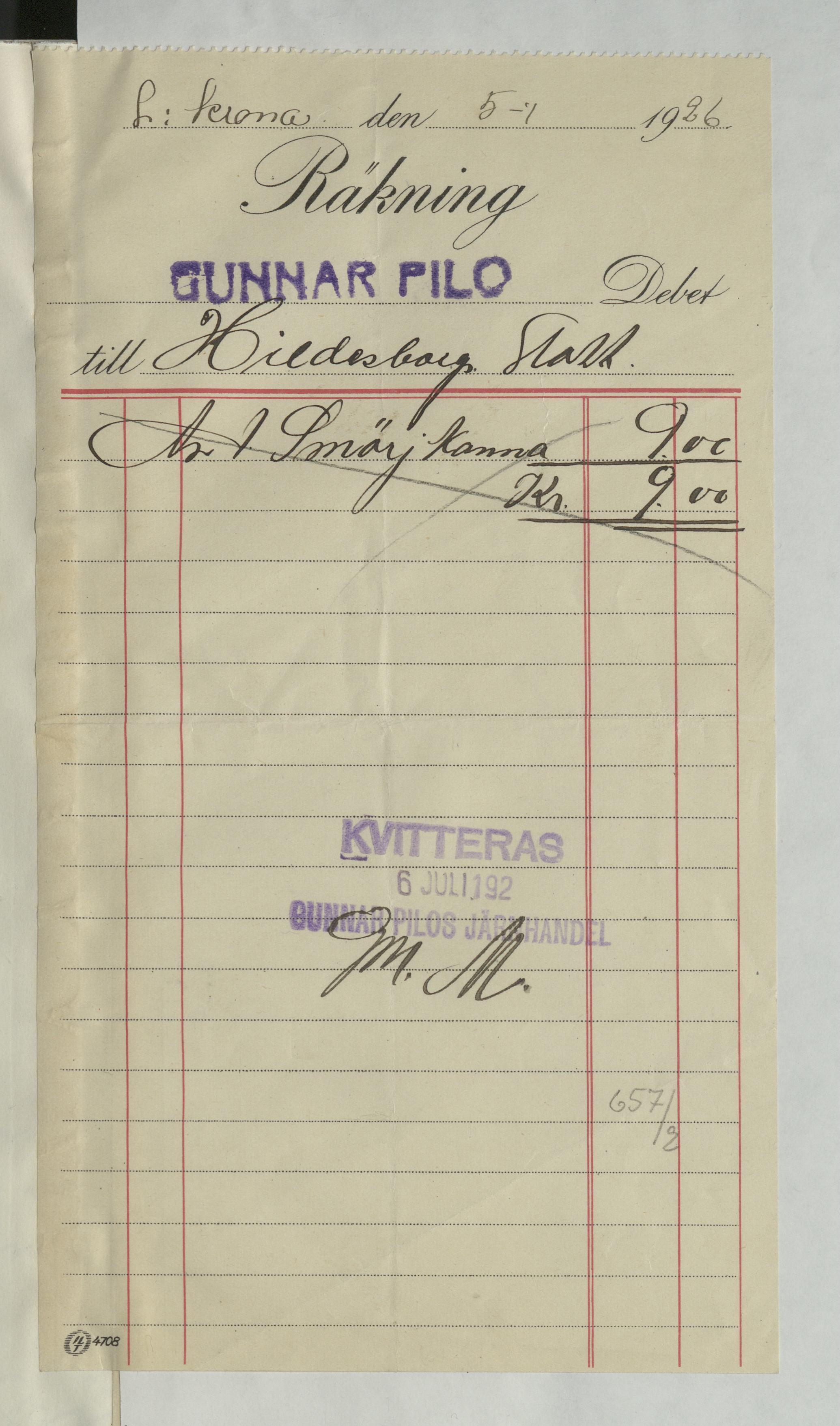 Kvitto från Gunnar Pilo, Järnhandel, 1926