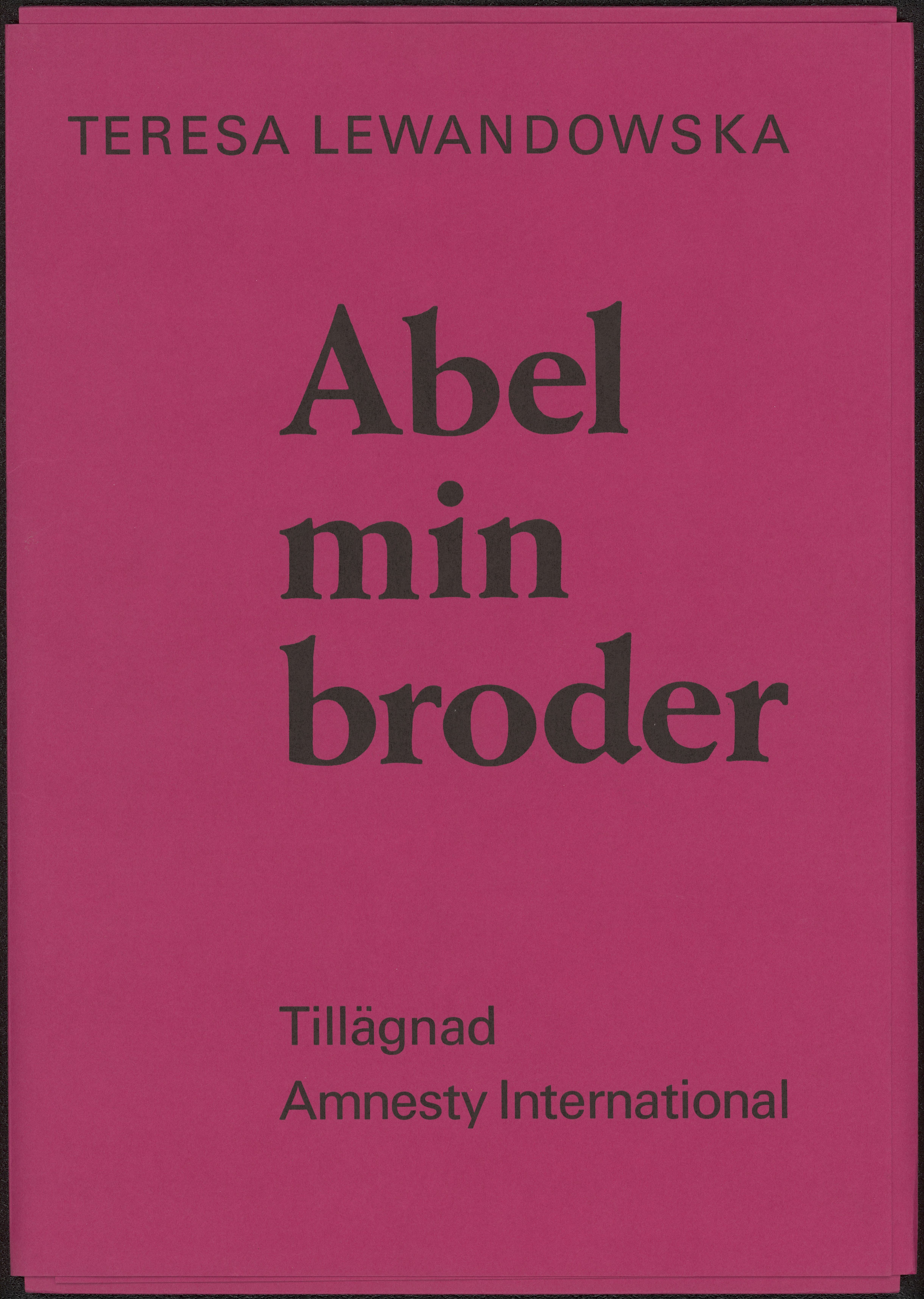 Bildsvit med grafiska blad av Teresa Lewandowska, gjort för Amnesty International 1973. Konstverken speglar hennes erfarenheter av Förintelsen i Polen. Mappen är signerad av konstnären till givaren.