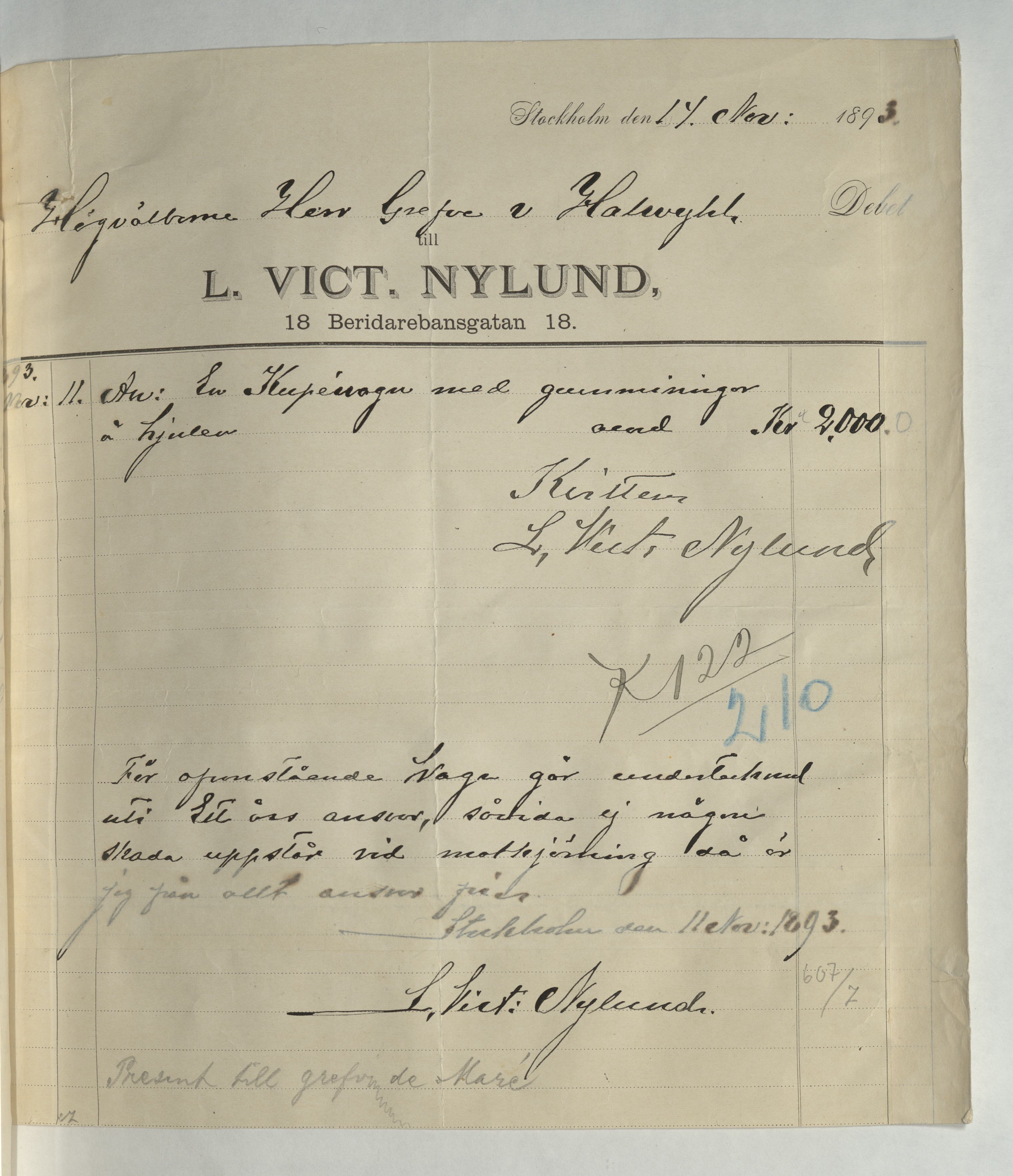 Kvitto från Victor L. Nylund, Sadelmakare, på en summa av 2000Kr. Stockholm 14 november 1893.