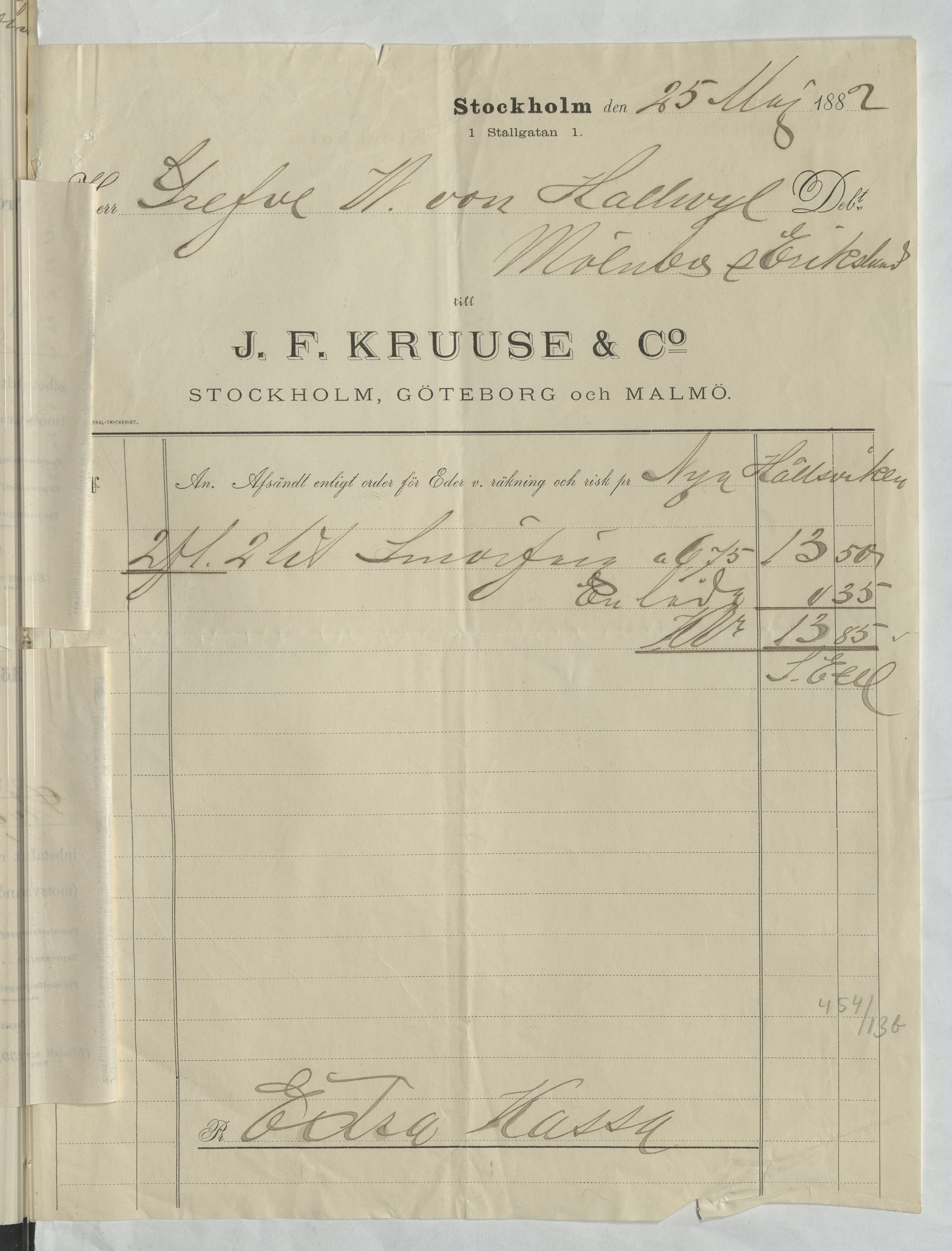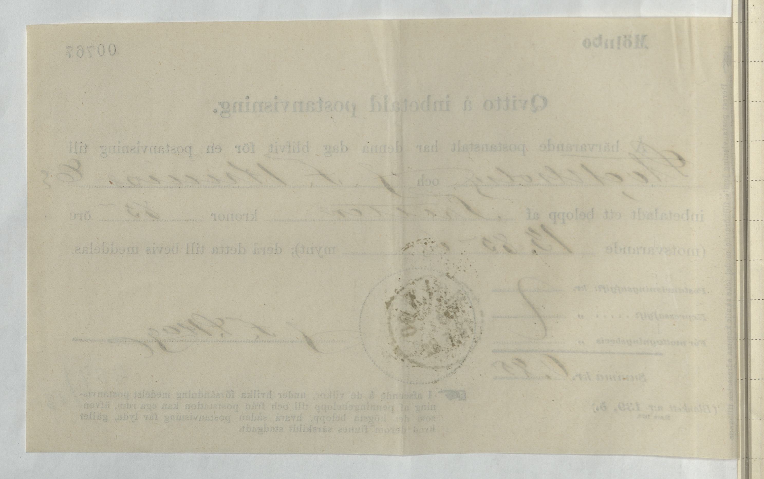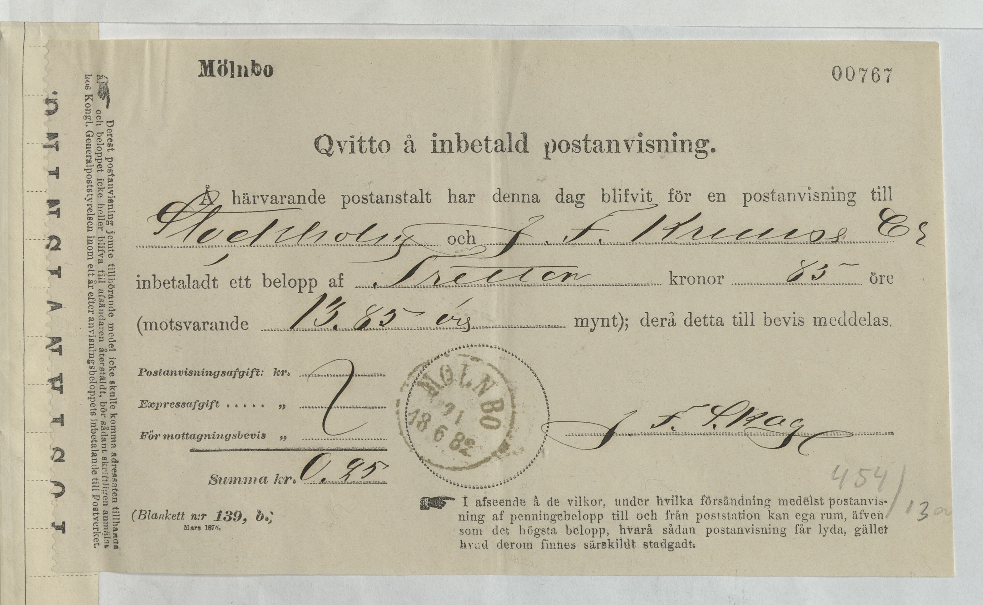 Kvitto för inbetald postanvisning gällande J. F. Kruuse & Co. Stockholm, 1882.