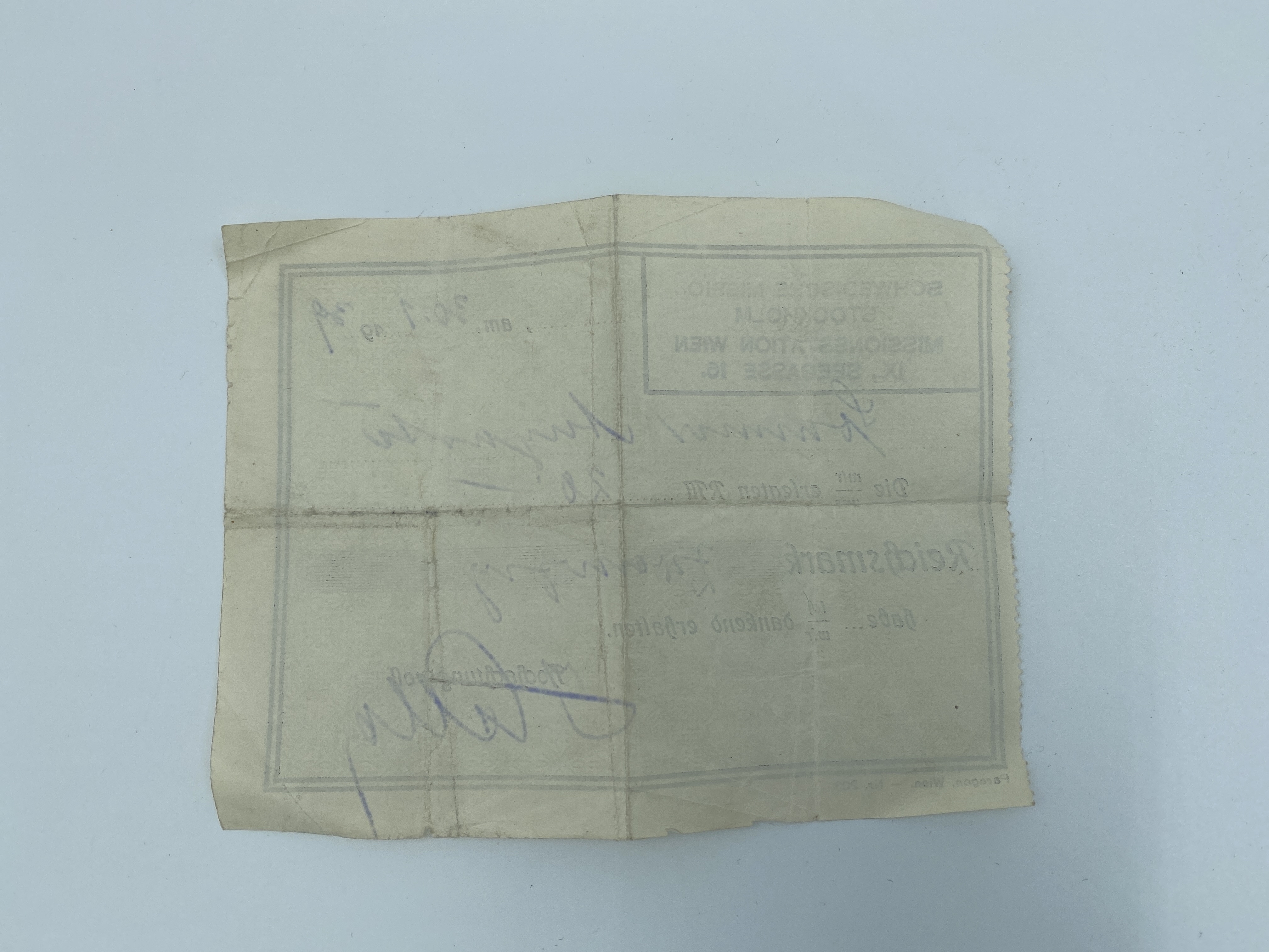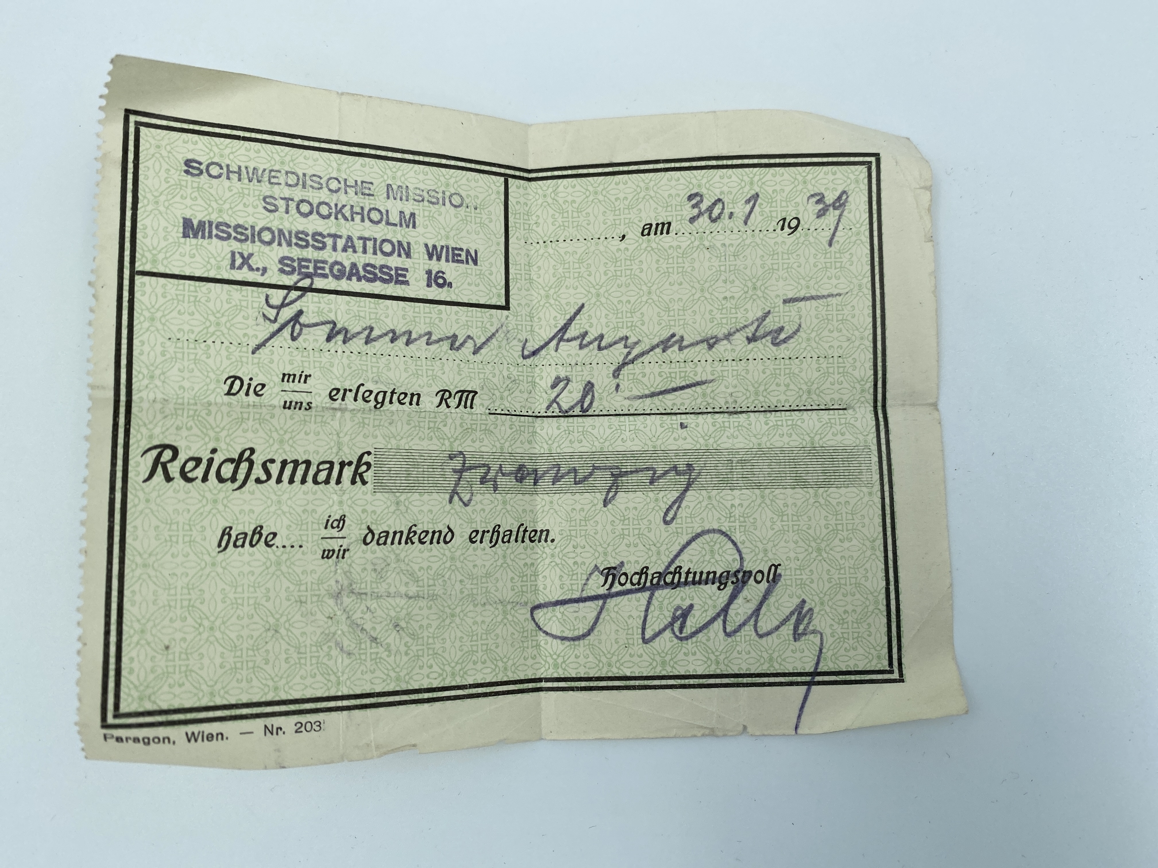 Utbetalningsavi utställd till Auguste Sommer den 30 januari 1939. Summan om 20 riksmark utbetalas från Svenska Israelsmissionen i Wien.