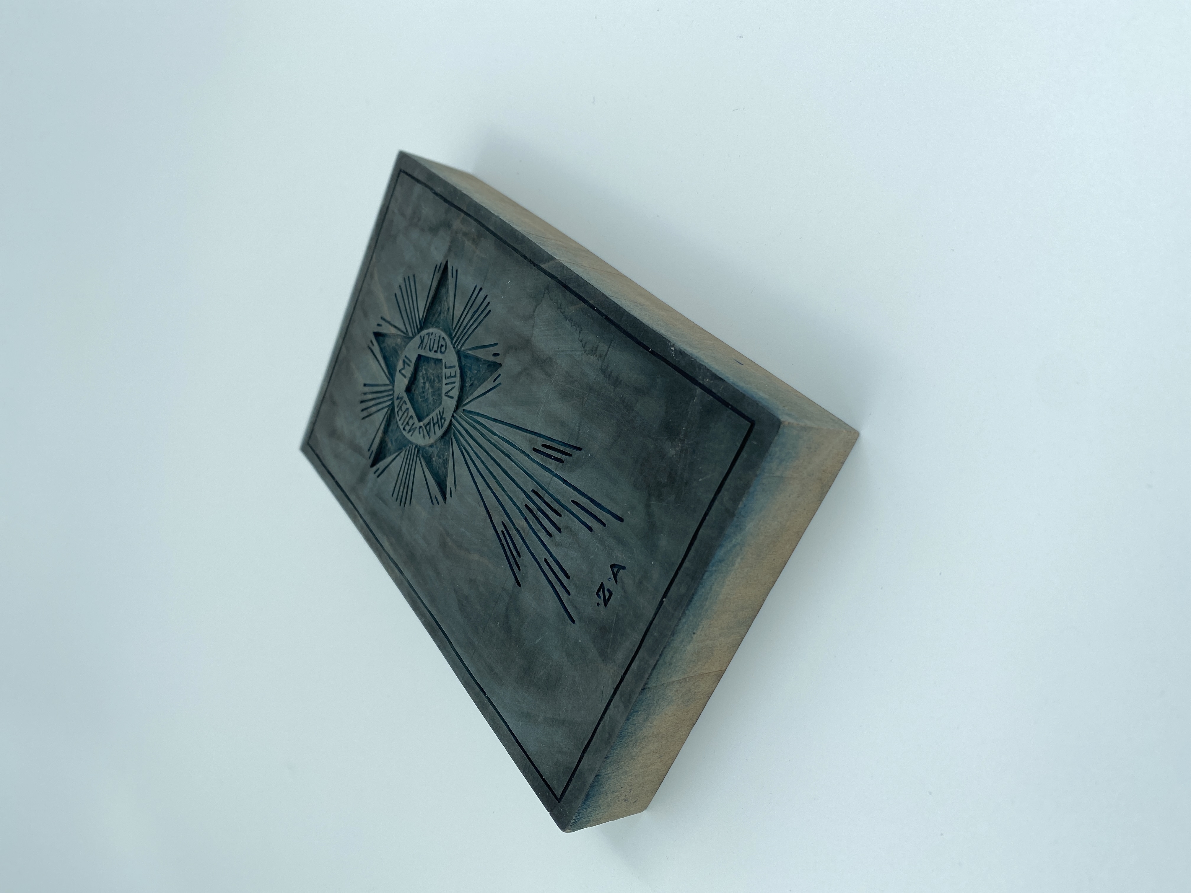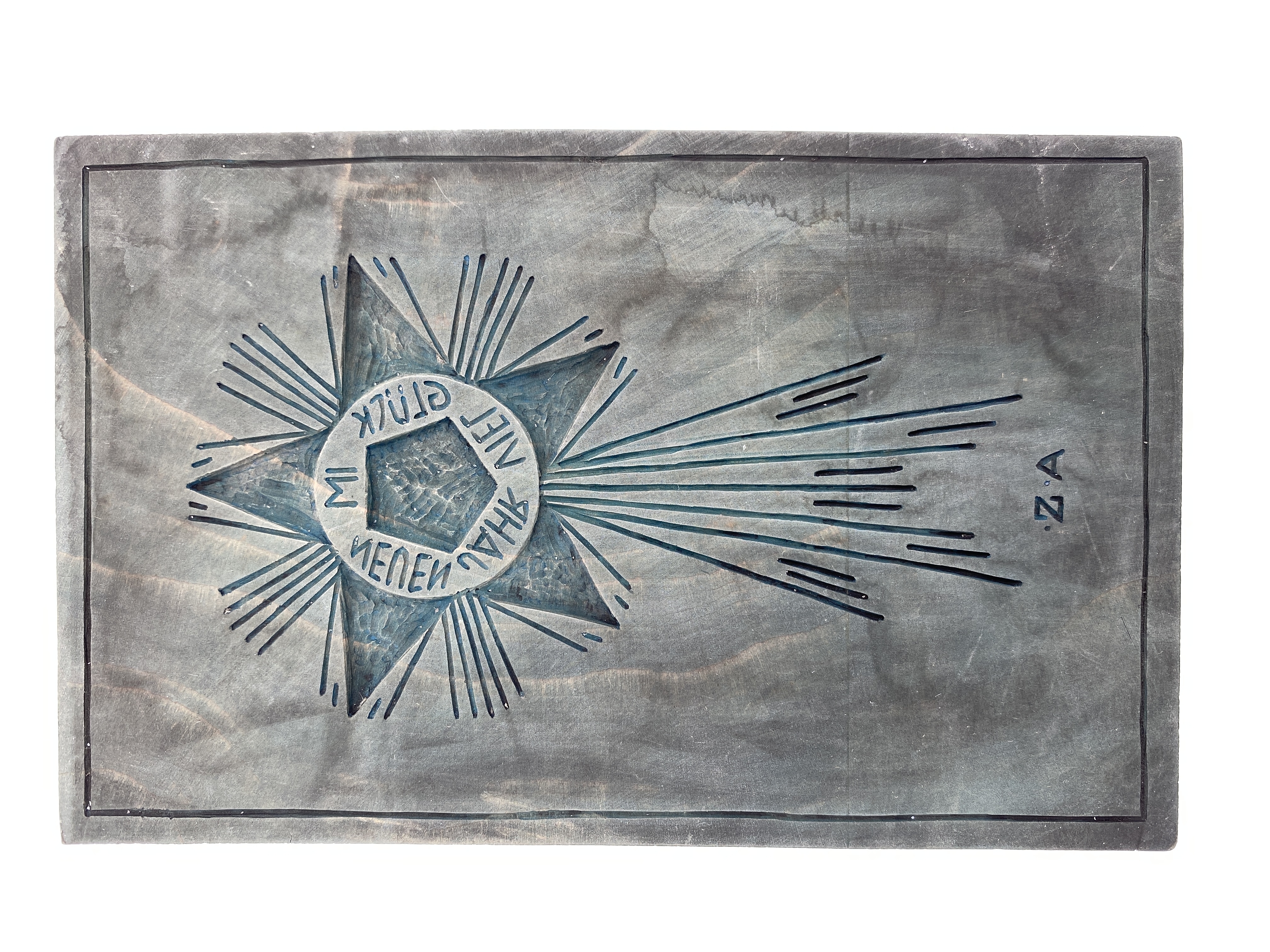 Tryckstock i trä, handskuren av Auguste Sommer. Motivet är en stjärna. Inuti stjärnan finns inskriptionen "IM NEUEN JAHR VIEL GLÜCK", ung. "Lycka för det nya året". Under stjärnans svans finns initialerna A.Z. för Auguste Sommer. Träblocket bär spår av färg och har sugit åt sig en del av pigmenten. På baksidan finns en ytlig spricka samt spår efter skärverktyg.