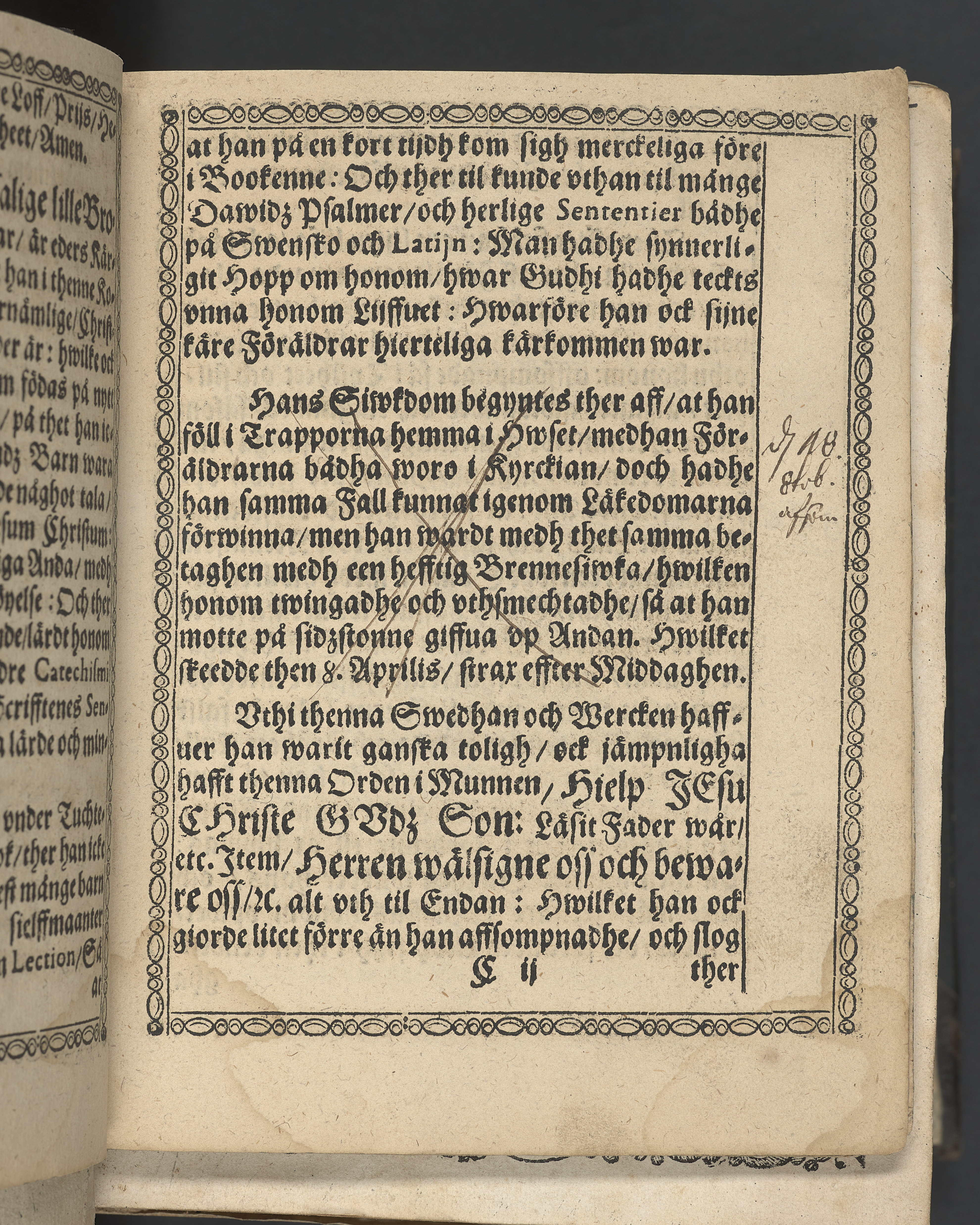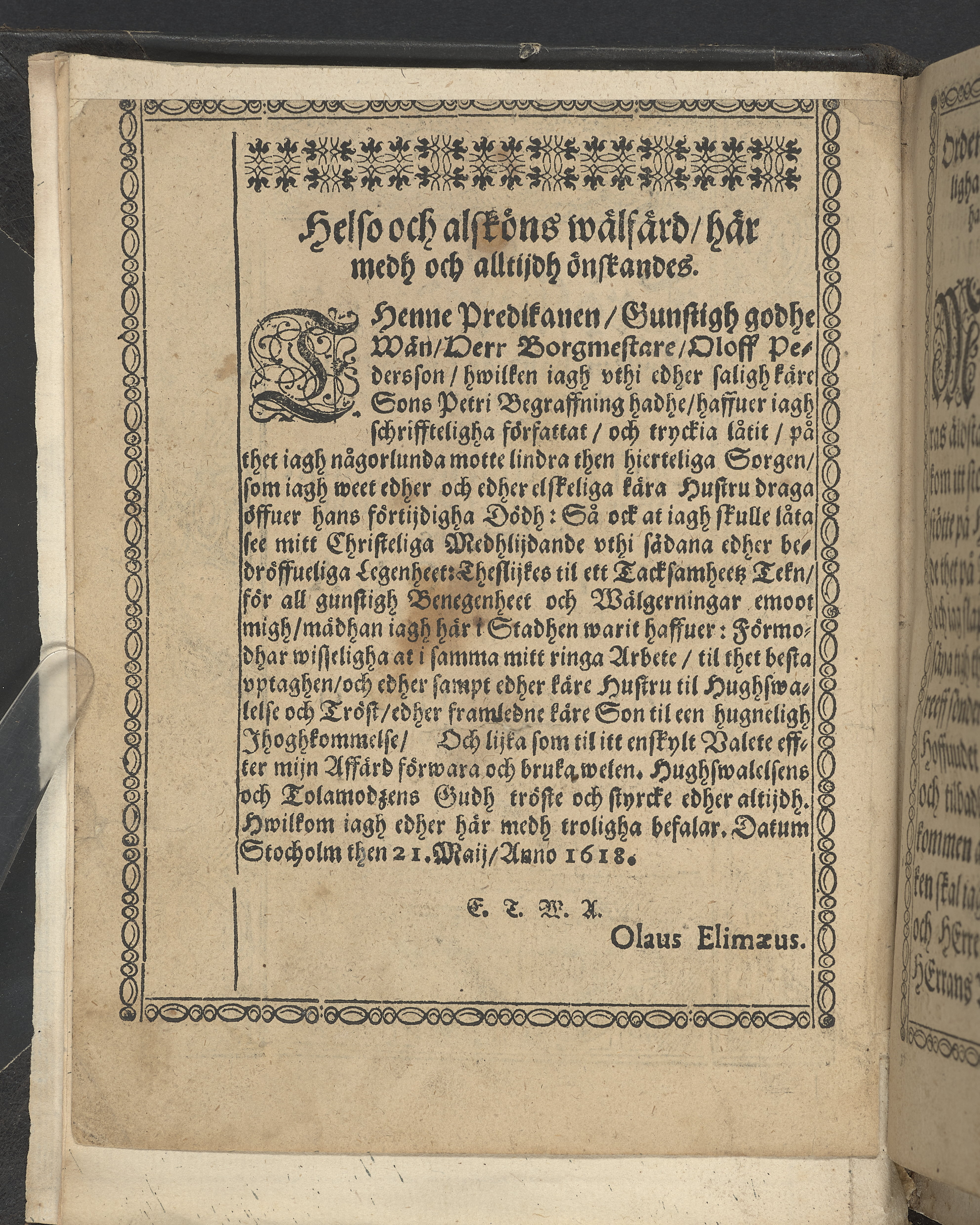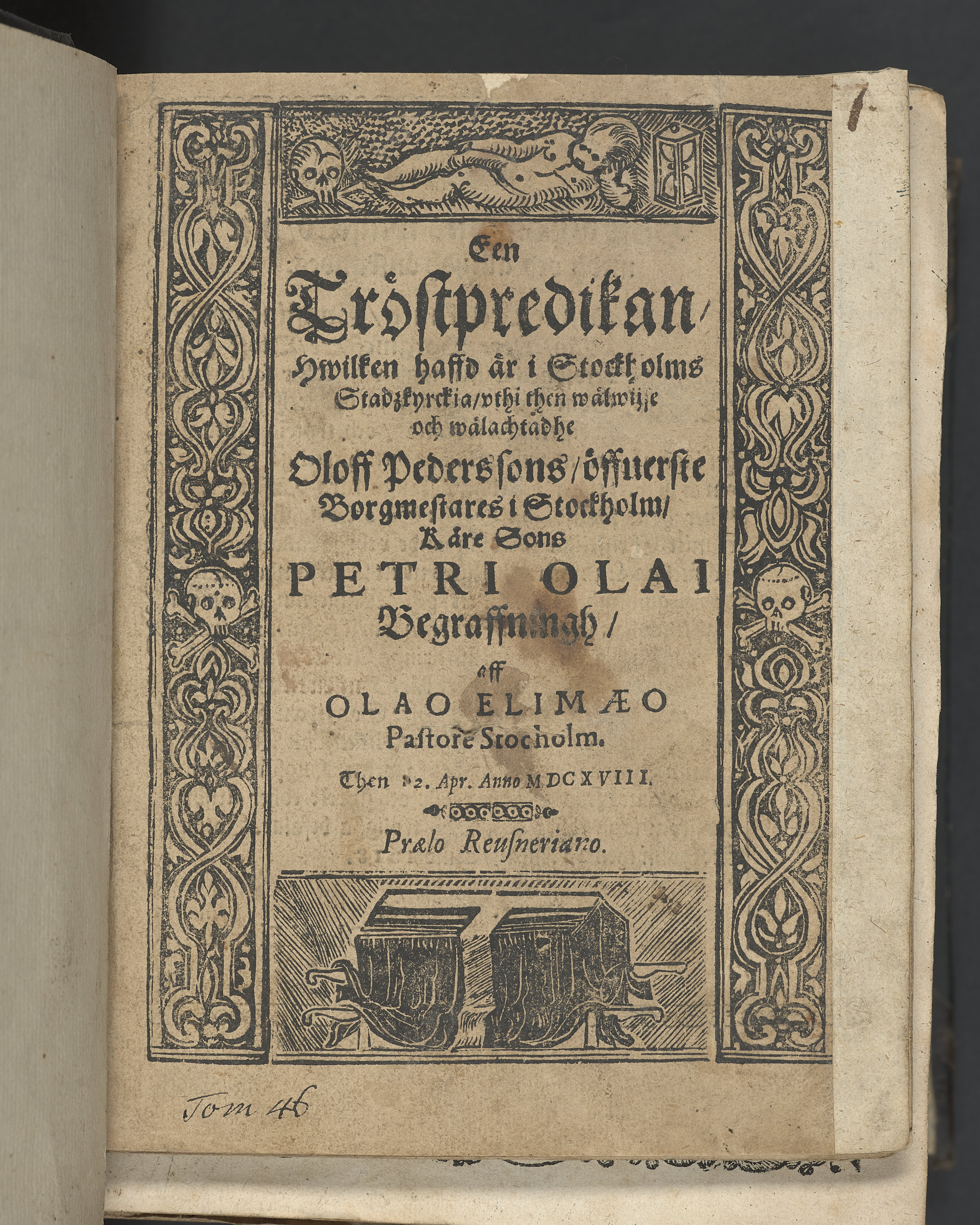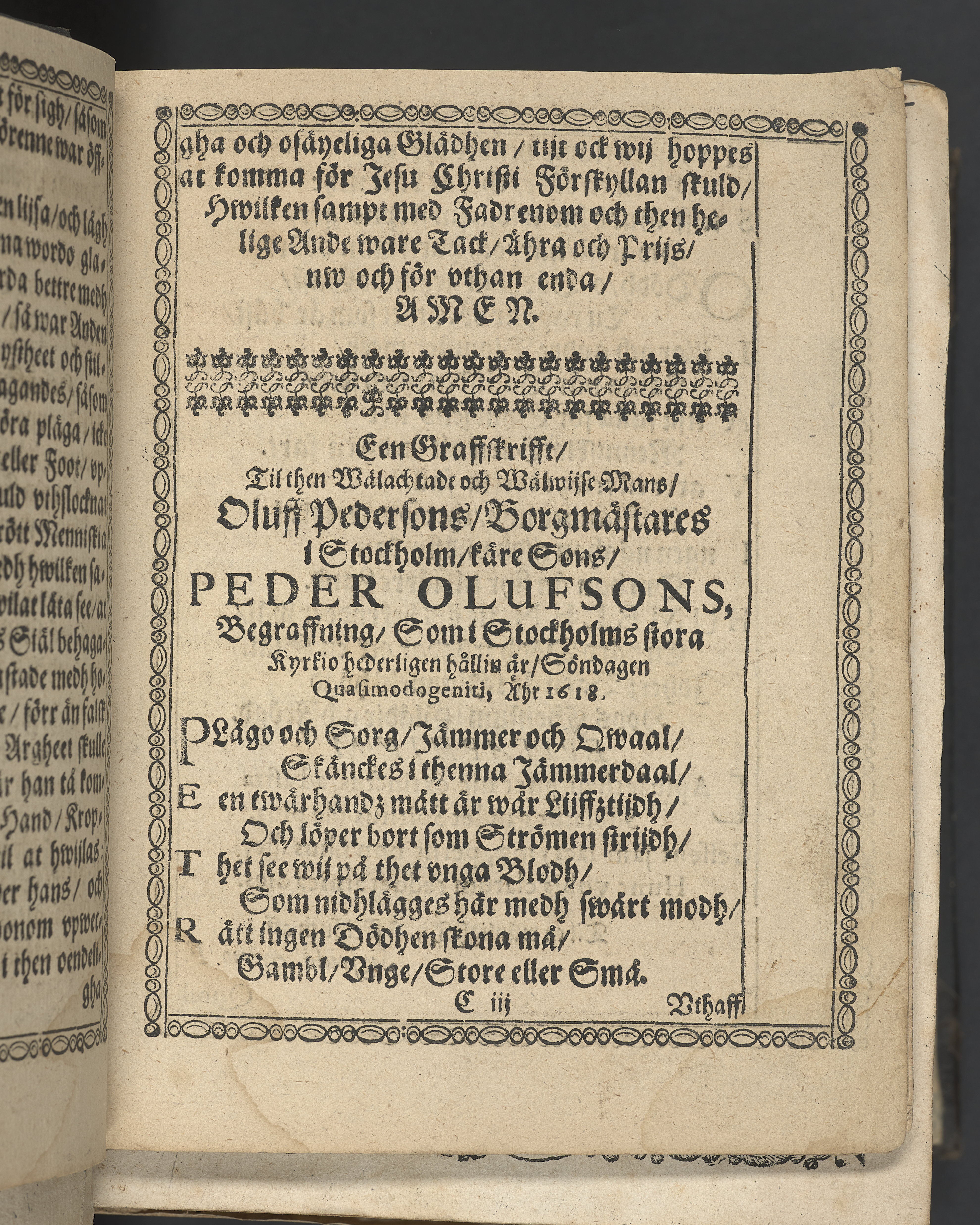 Likpredikan över Peder Olofsson, son till överste borgmästaren i Stockholm, Olof Pedersson.