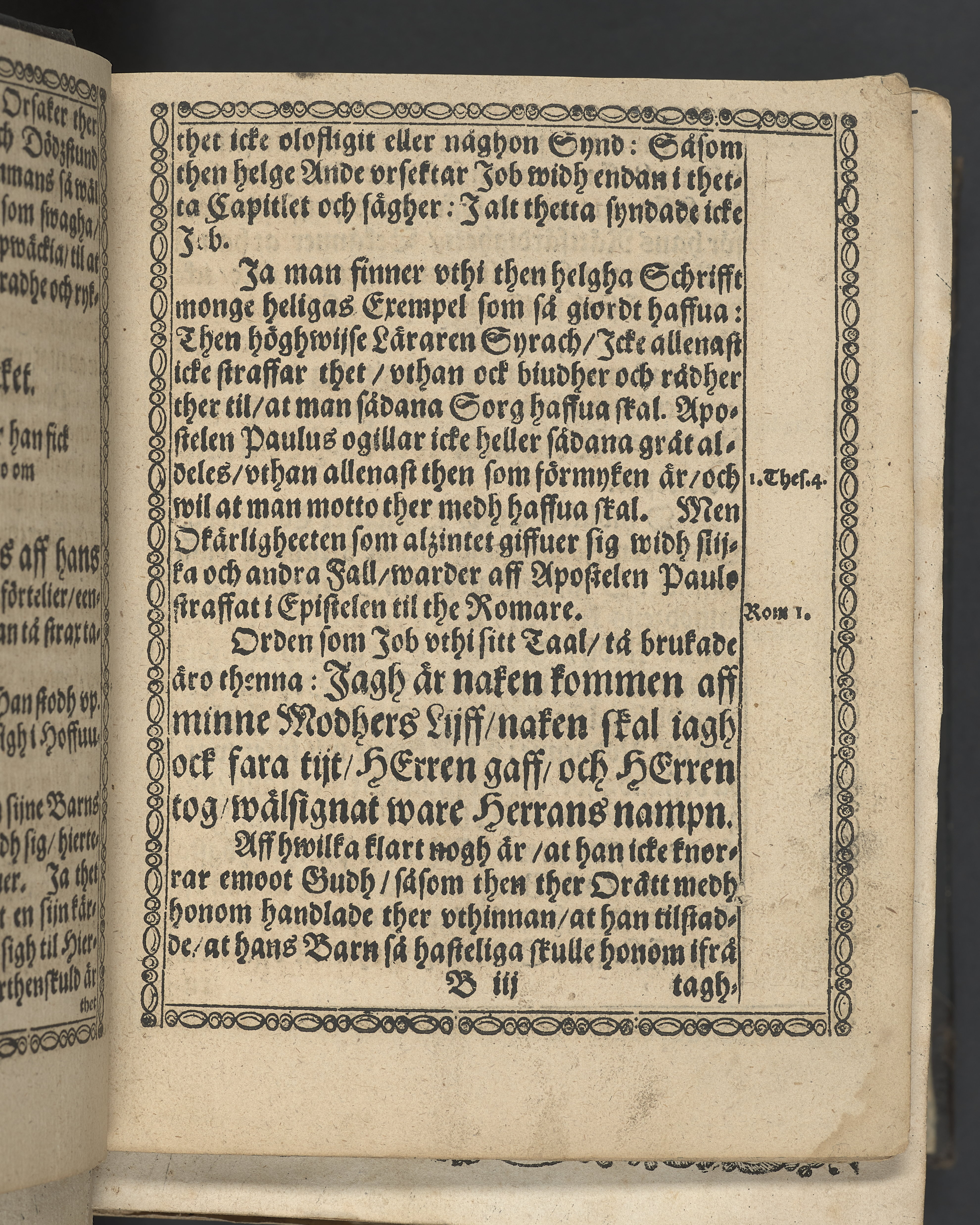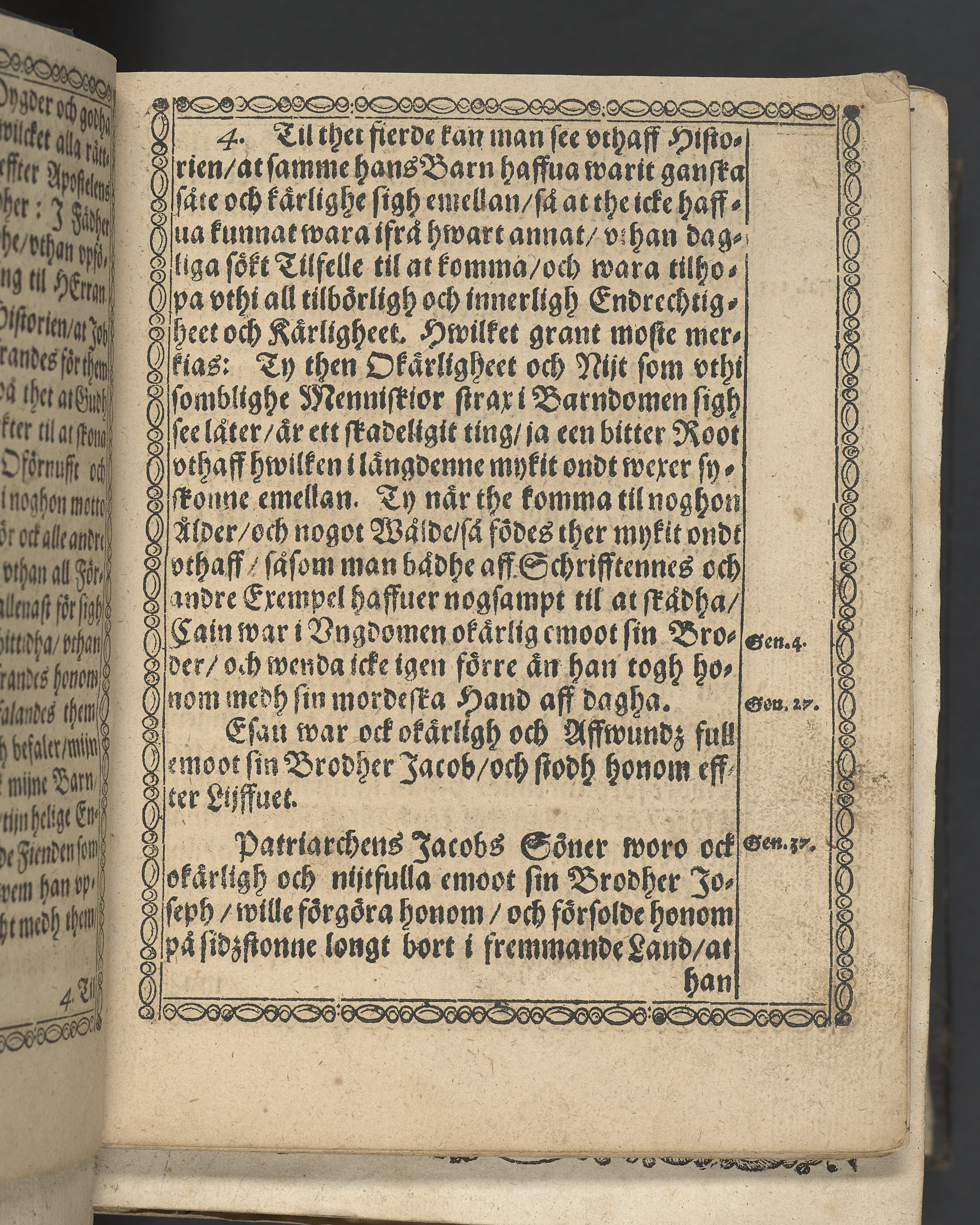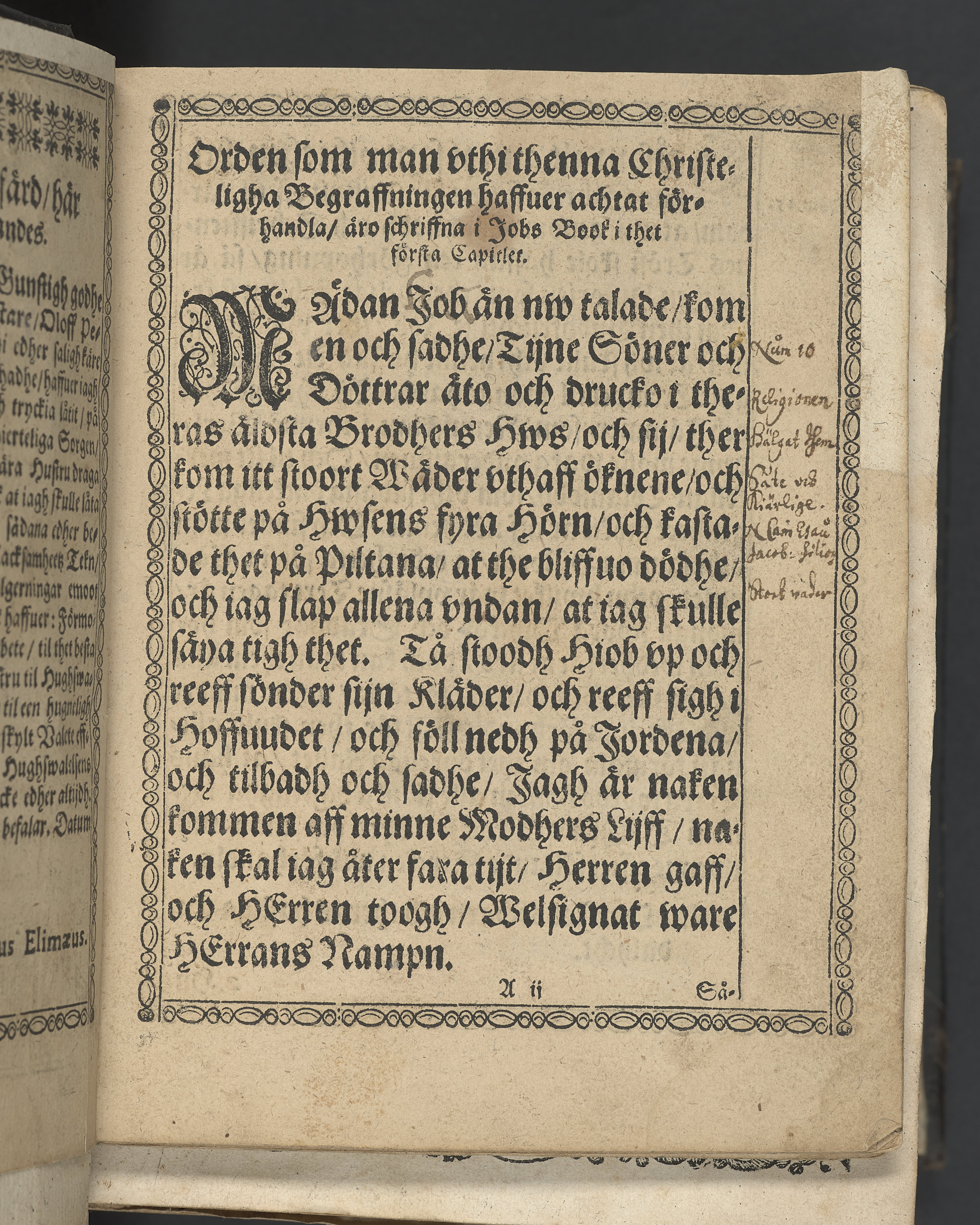 Marginalanteckningar med brunt bläck samt överkryssat stycke och understrykning (s. 3, 19, 20). I övre högra hörnet på titelsidan med bläck "1". I nederkant till vänster med svart bläck "Tom. 46". Flertalet blad har äldre lagningar i framkant i form av remsa papper klistrad längs kanten. Snitt stänkta i rött och blått.
