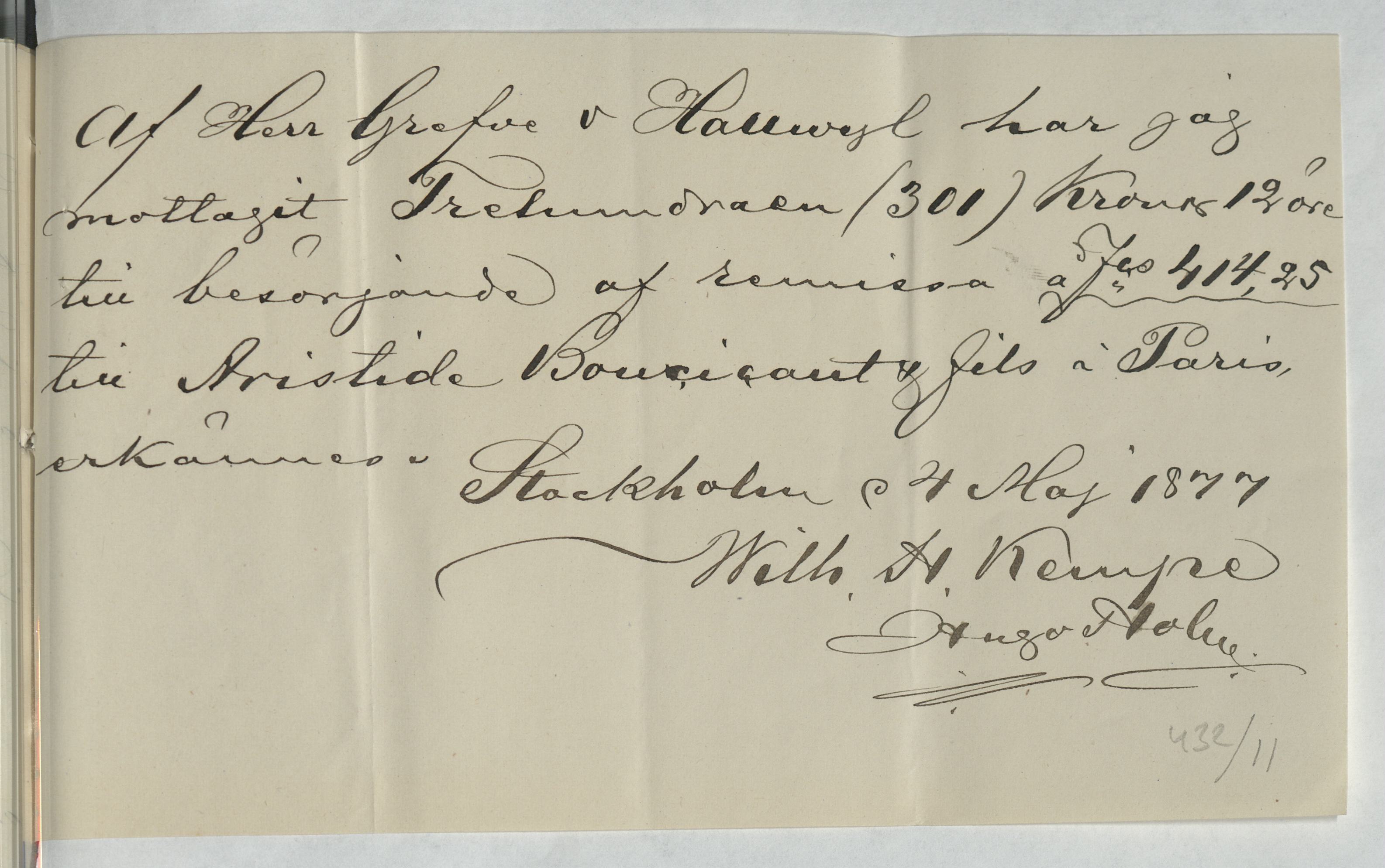 Kvitto från Firma Wilh. H. Kempe rörande emottagna kontanter.