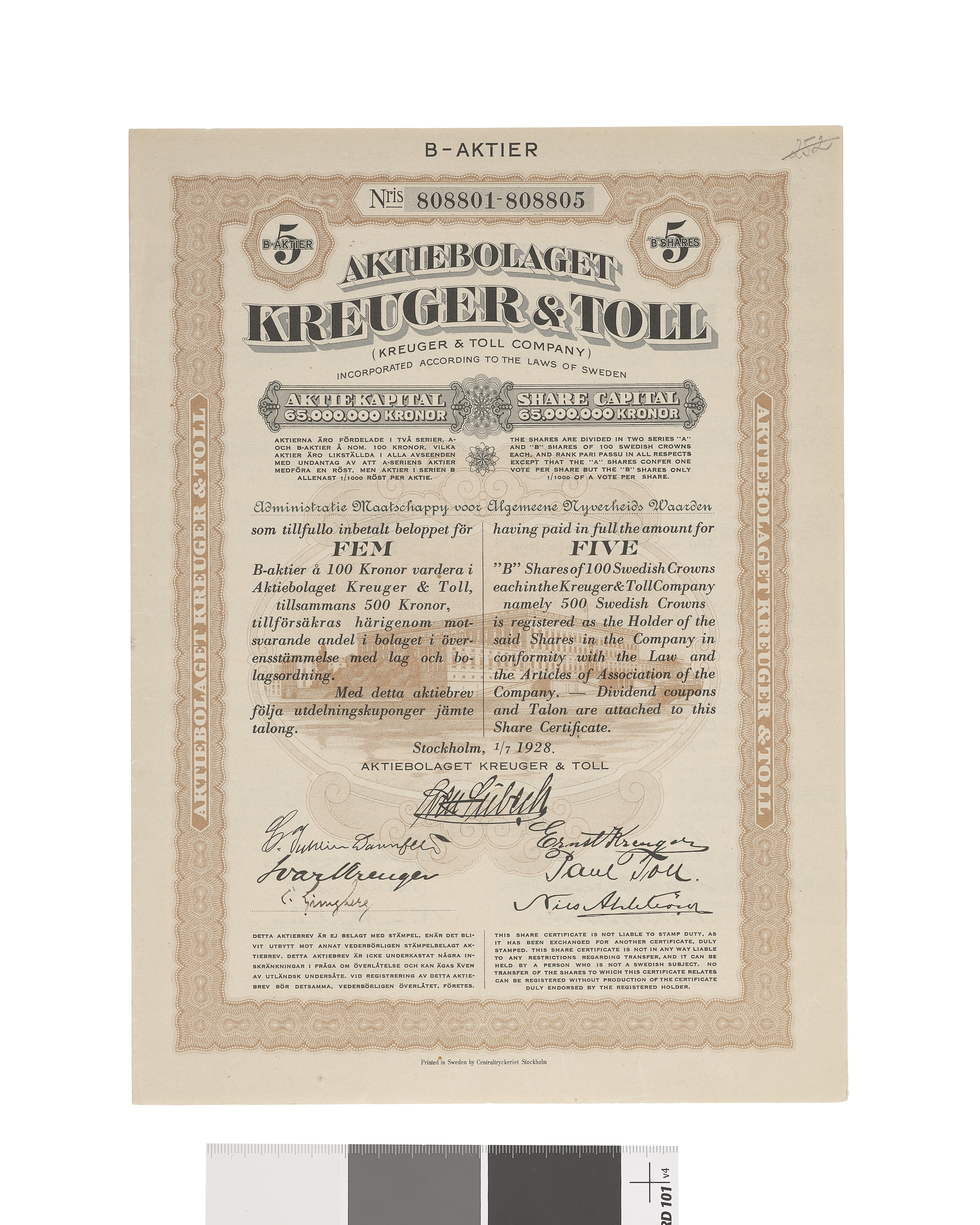 Aktiebolaget Kreuger & Toll - 5 aktier a´ 100 kronor