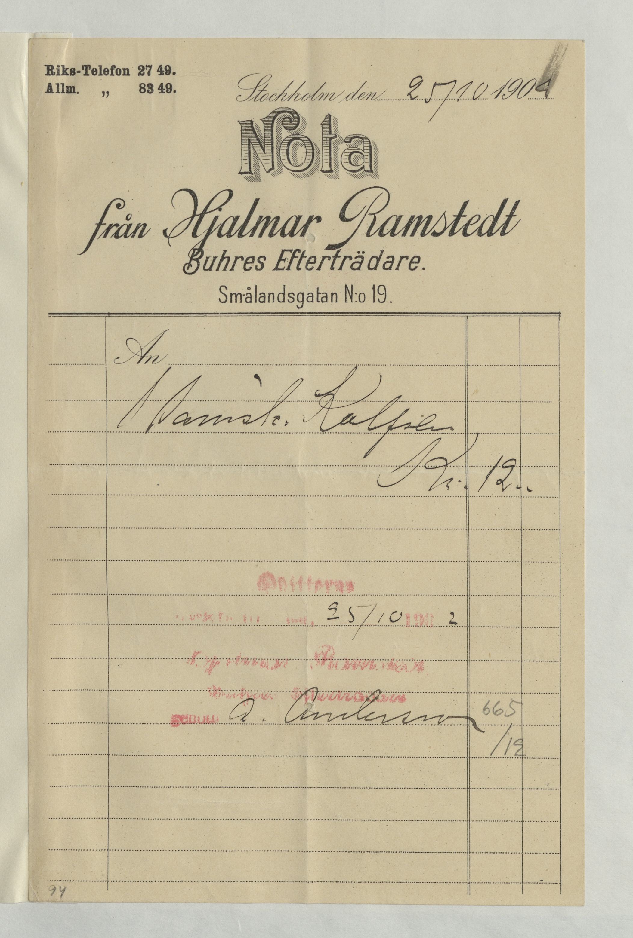 Kvitto från Hjalmar Ramstedt, lädervaror, på 12Kr. Betalt Stockholm, 25 oktober 1904.
