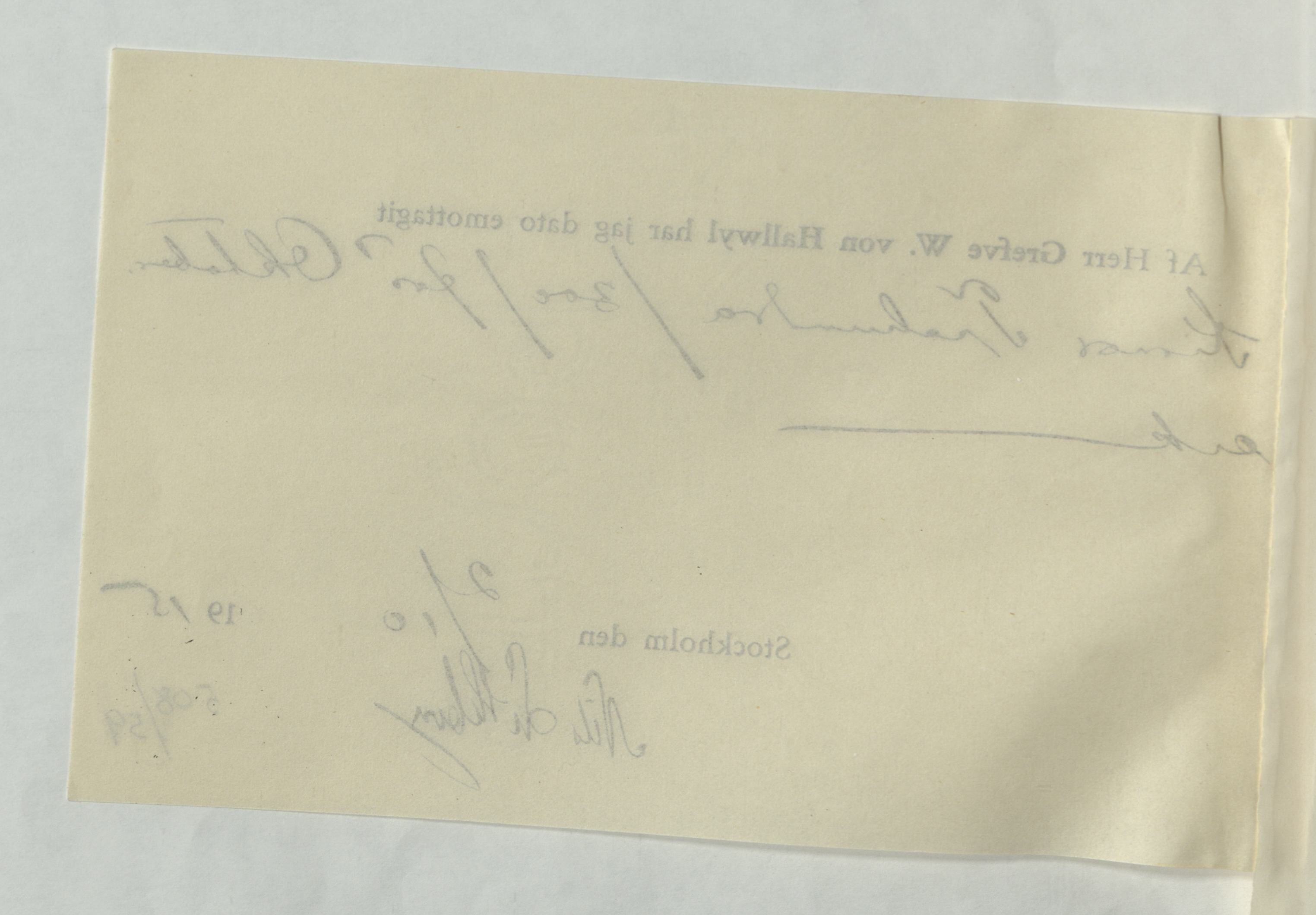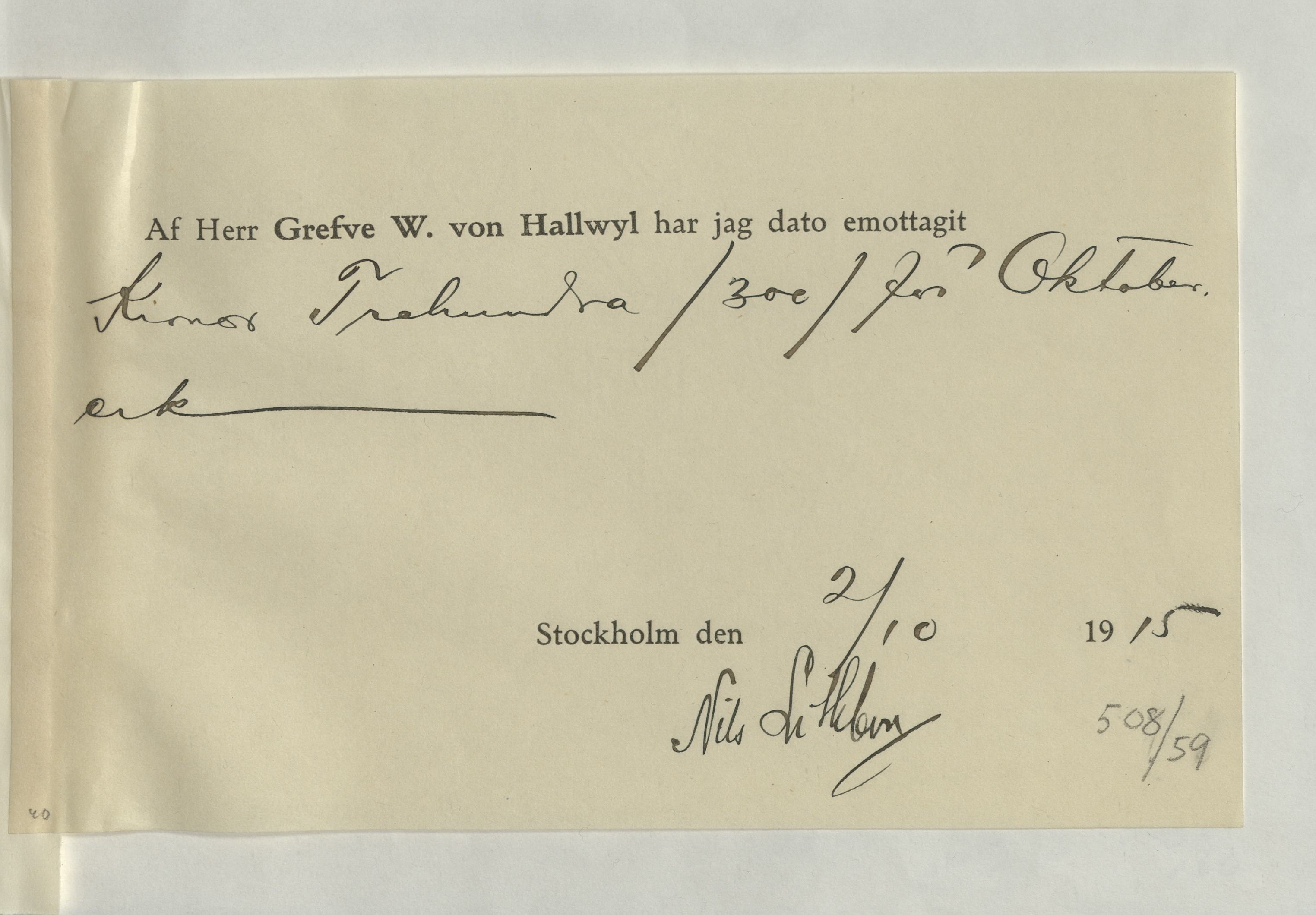 Emottagande av arvode från greven Walther von Hallwyl till Nils Lithberg, 2 oktober 1915.