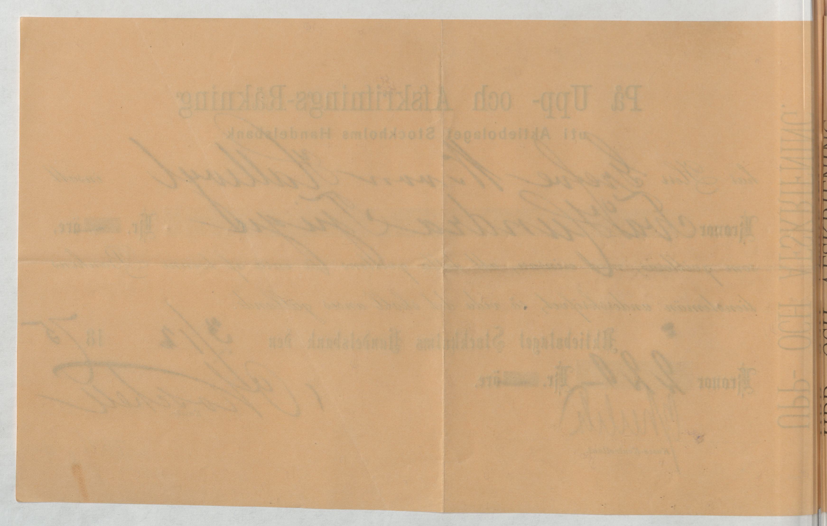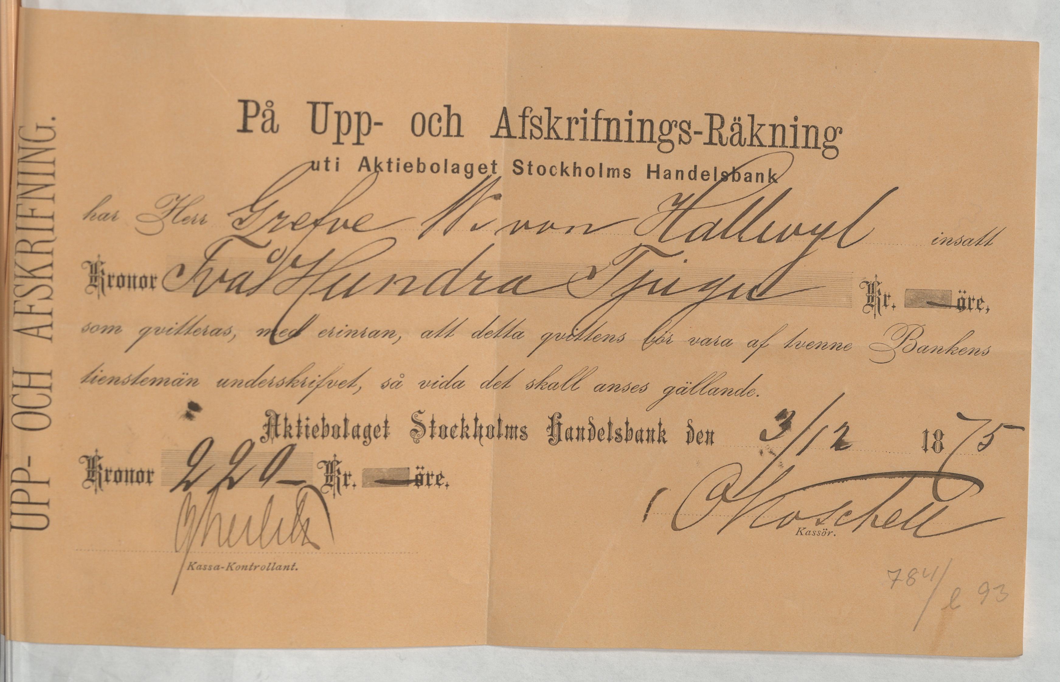 Kvitto från Aktiebolaget Stockholms Handelsbank rörande Upp- och Afskrifnings-Räkning