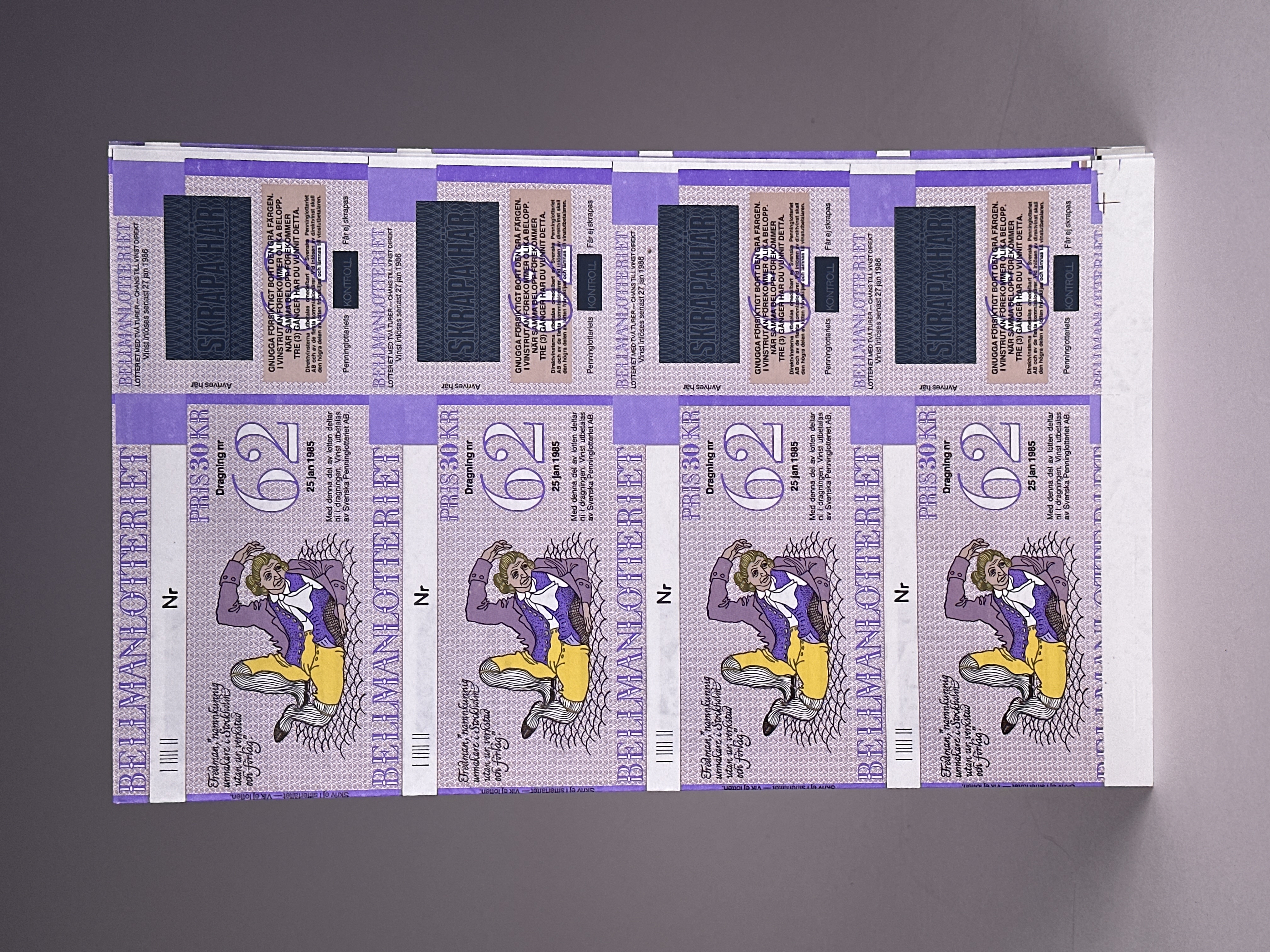 Provark med plats för 28 lotter, vikt. Pris 30 kronor. 62:a dragning, 25:e januari 1985. Lottens vinstplan presenteras på baksidan av lotten. Motiv: Fredman, "namnkunnig urmakare i Stockholm utan ur, verkstad och förlag". Färger: lila, brun, gul Märkning: området i det övre högra hörnet är överstruket och markerat med ordet "specimen", även märkt "Z3".