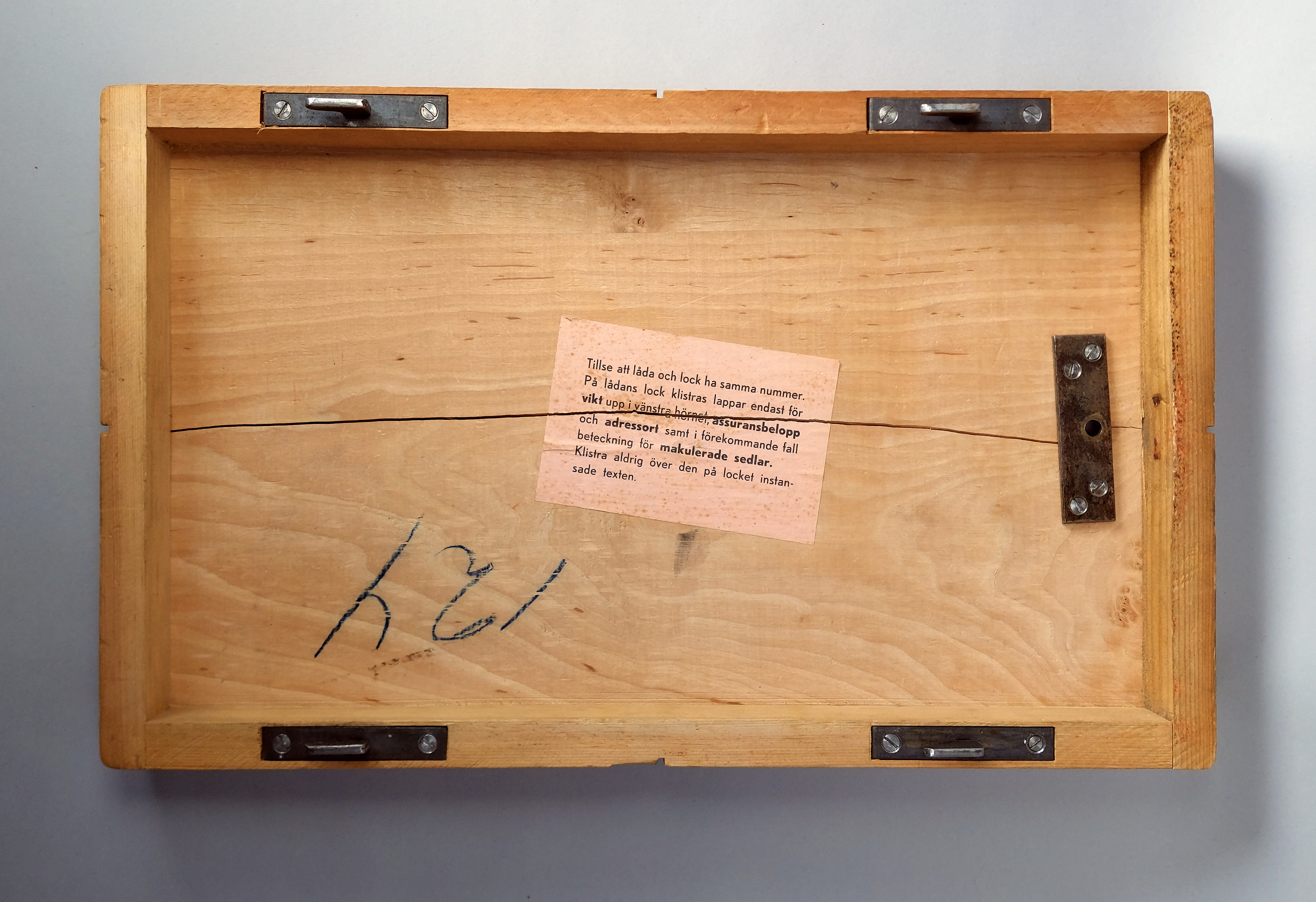 Trälock till låda för tjänstepost bestående av assurerat innehåll med Sveriges Riksbank som avsändare. Undre delen av lådan saknas.