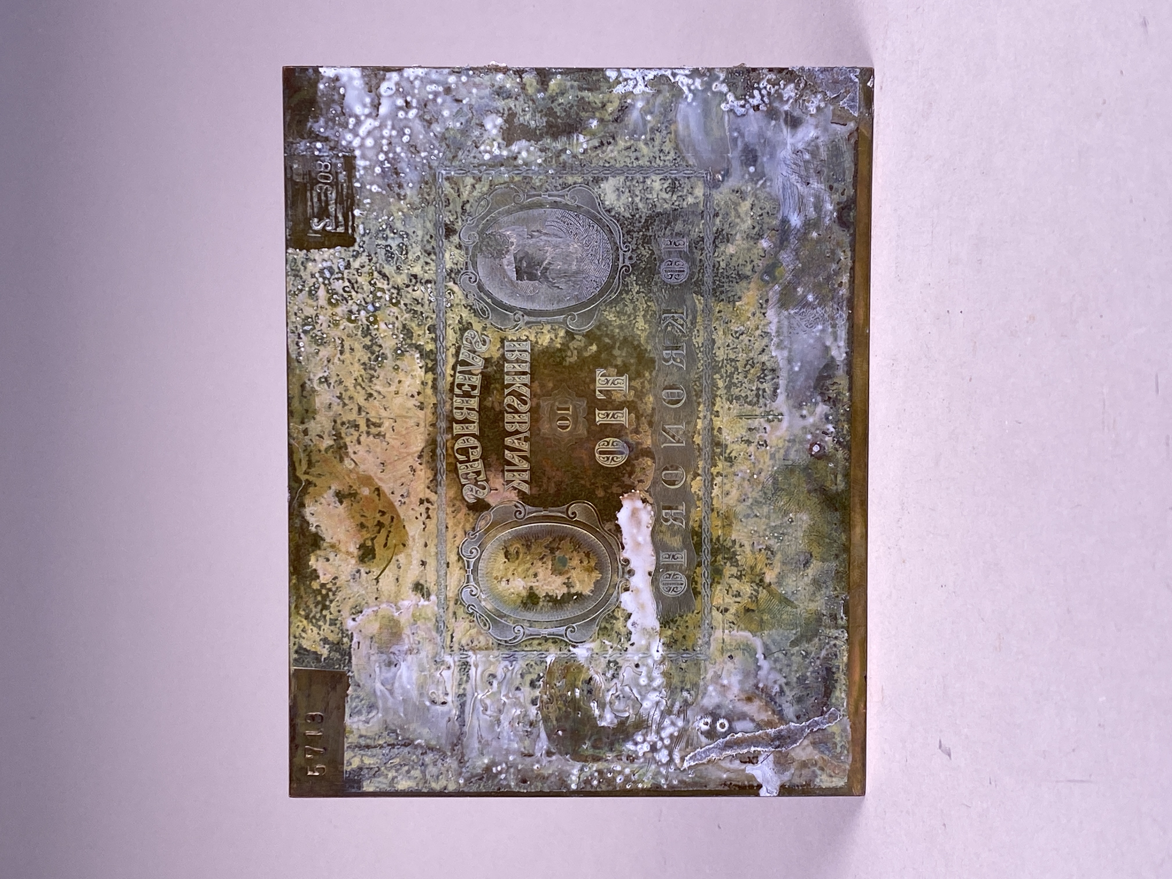 Tryckplåt för tiokronorssedel. Med tillhörande kuvert. Rektangulär plåt möjligtvis tillverkad i koppar, baksidan med okänd legering. Framsidan med gravyr föreställande Gustav Vasa innanför medaljong. Plåten även stämplad nummer: "5713".