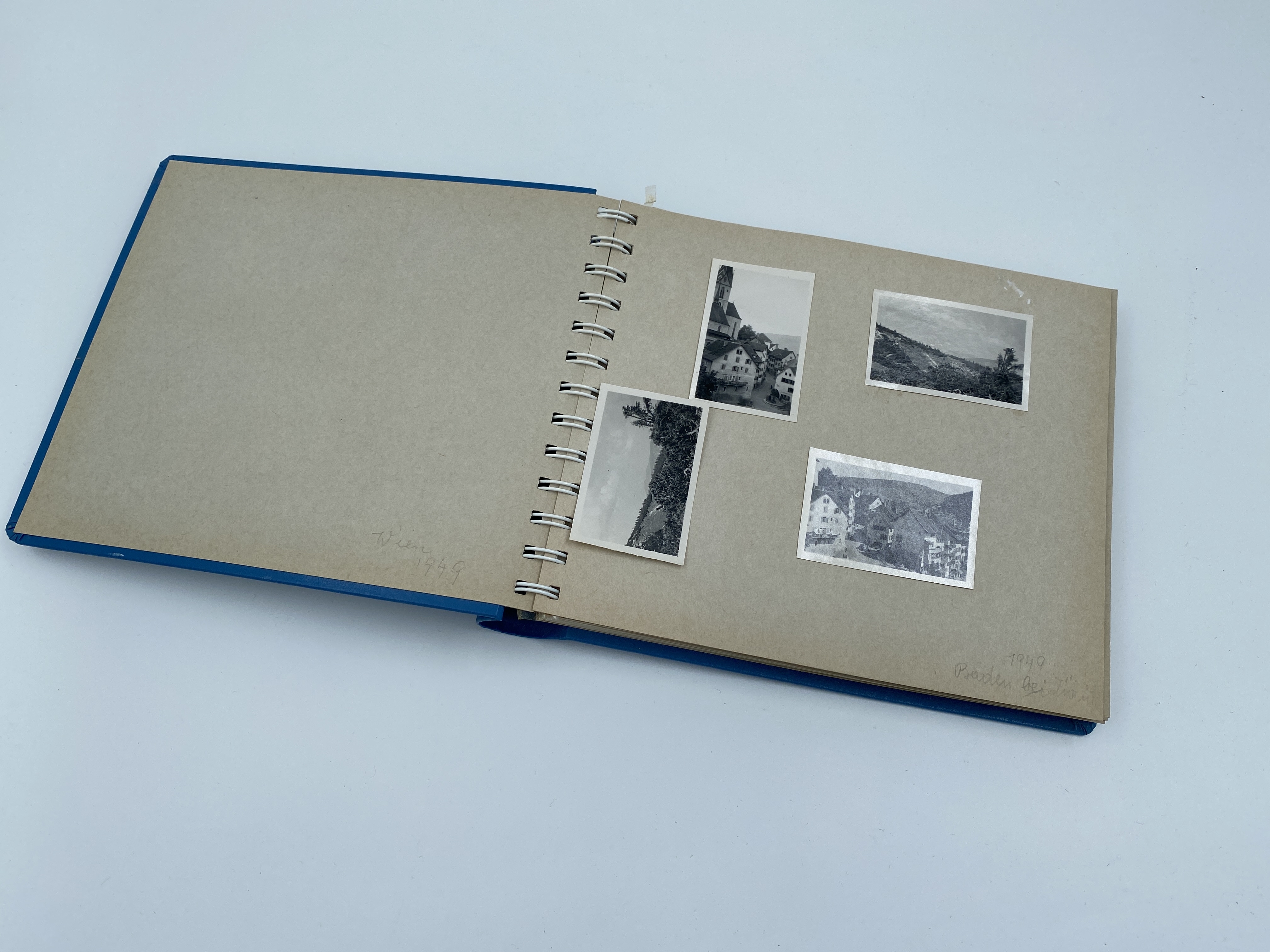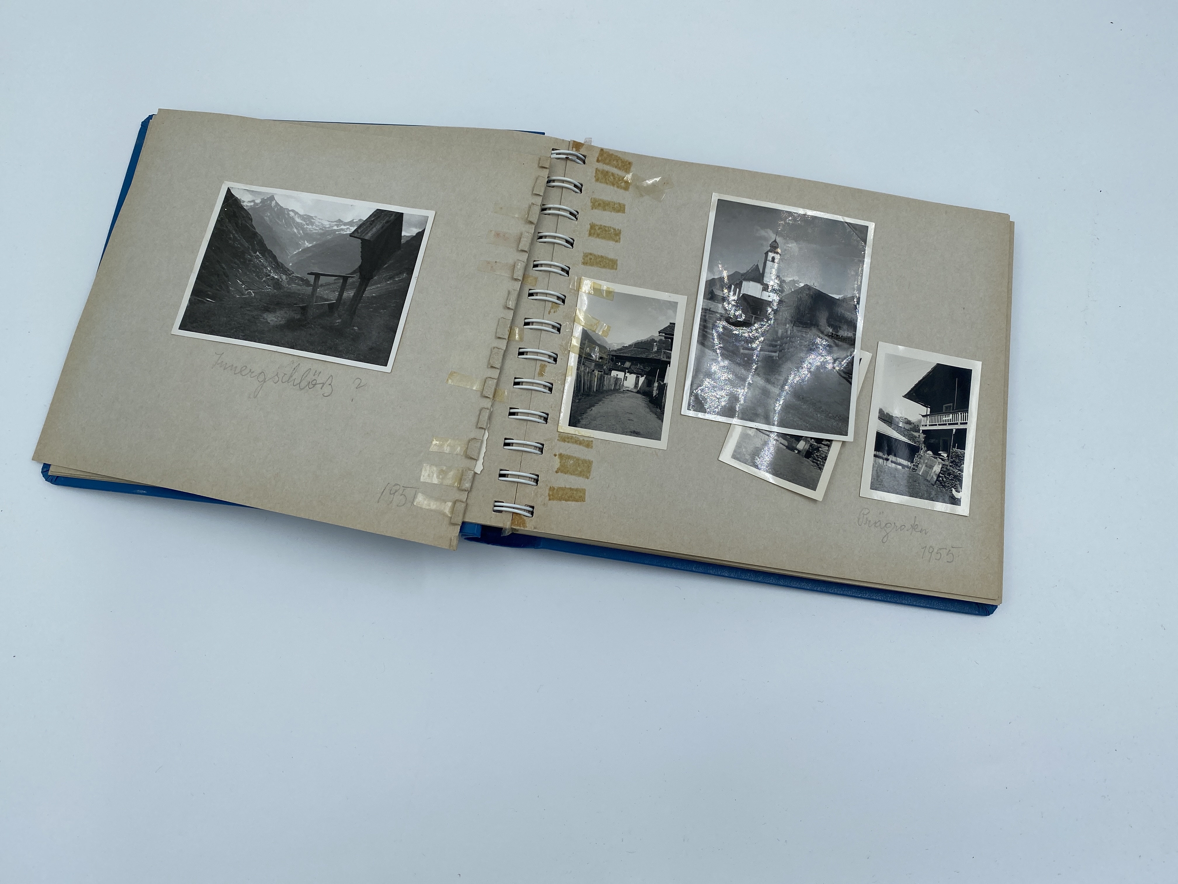 Fotoalbum som tillhört Auguste Sommer. Innehåller efterkrigstida fotografier från Schweiz, Österrike och Italien. Blå pärm som innehåller kartongsidor hopfästa med ringrygg.