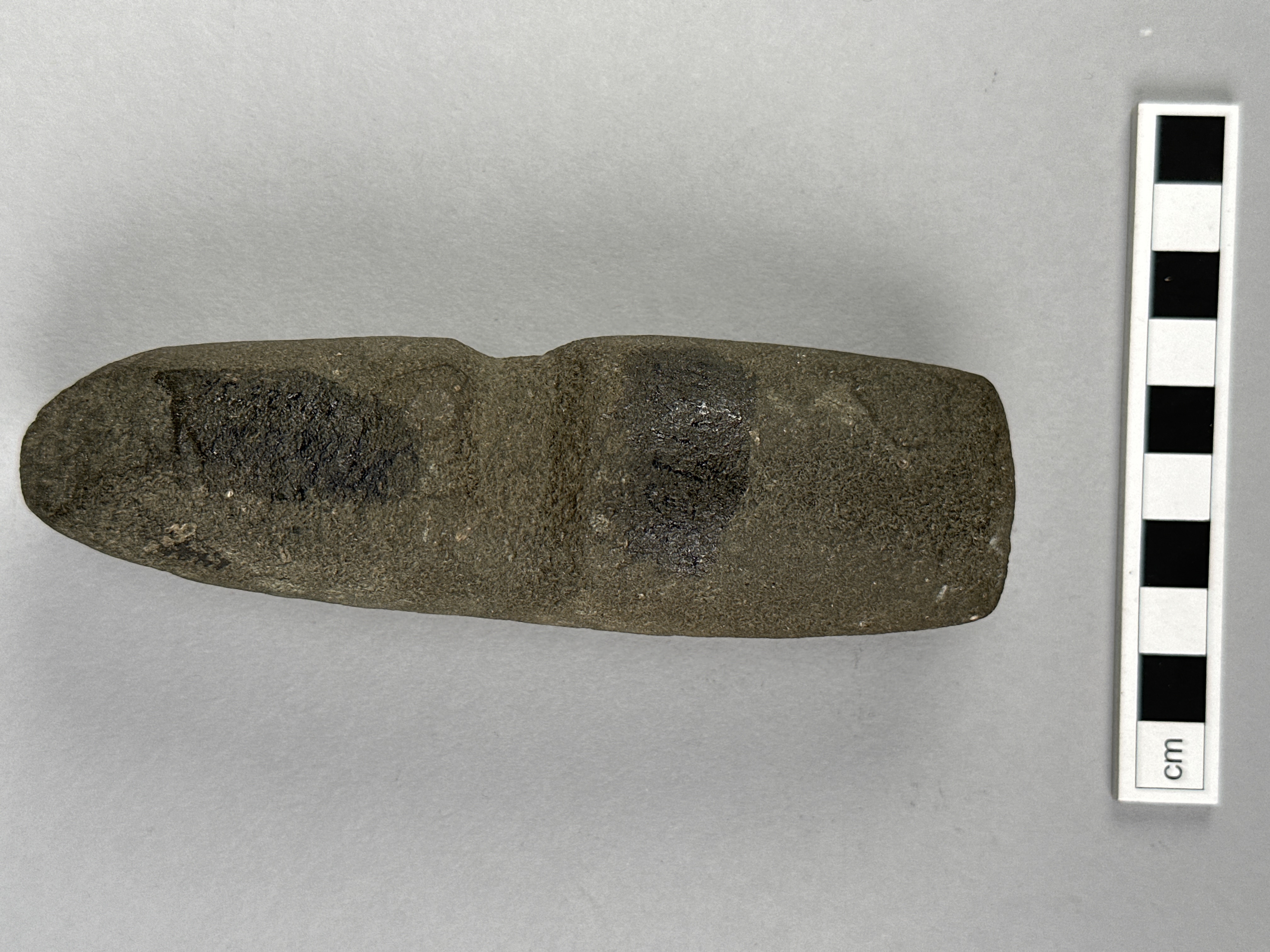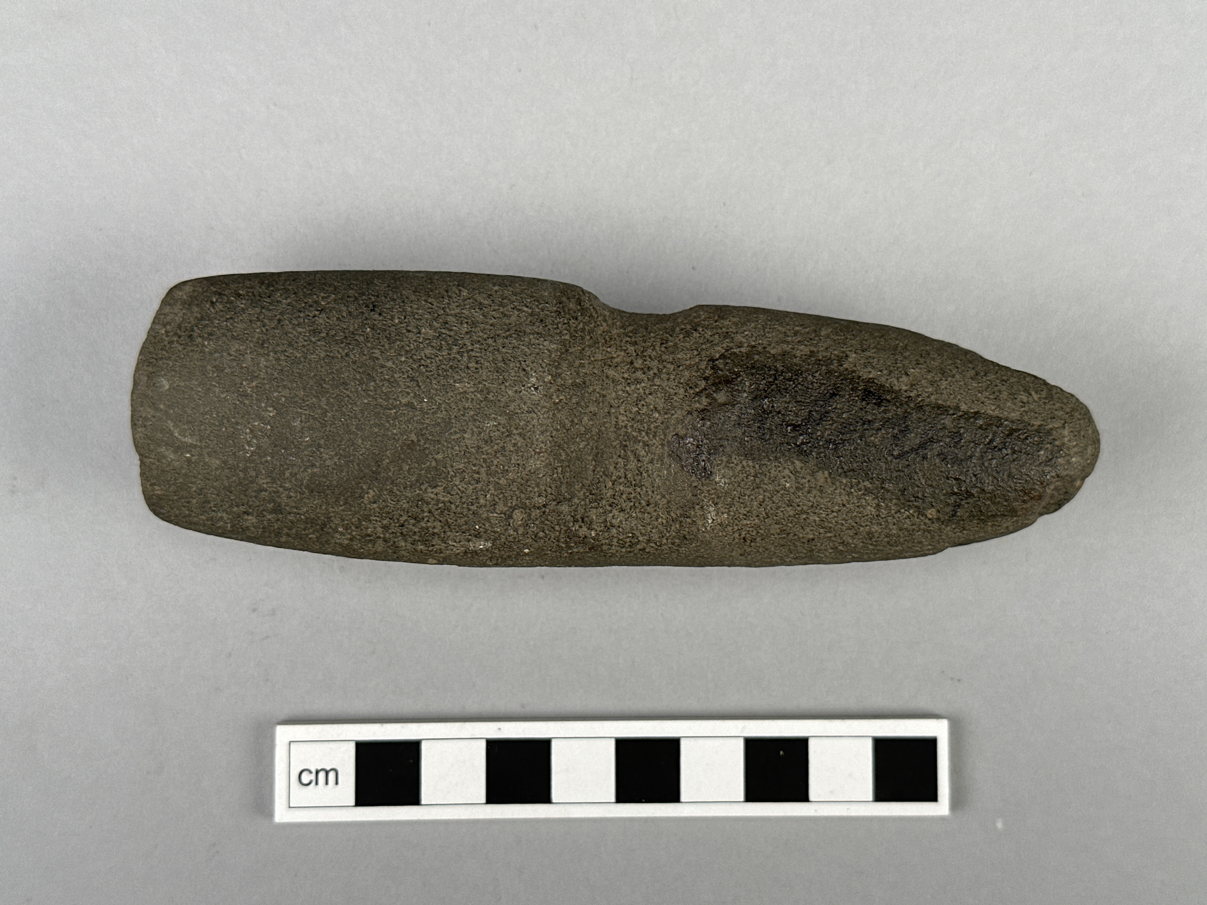 Yxa av bergart med skaftränna som ej går hela vägen runt. Rund nackknopp. Rundad egg.