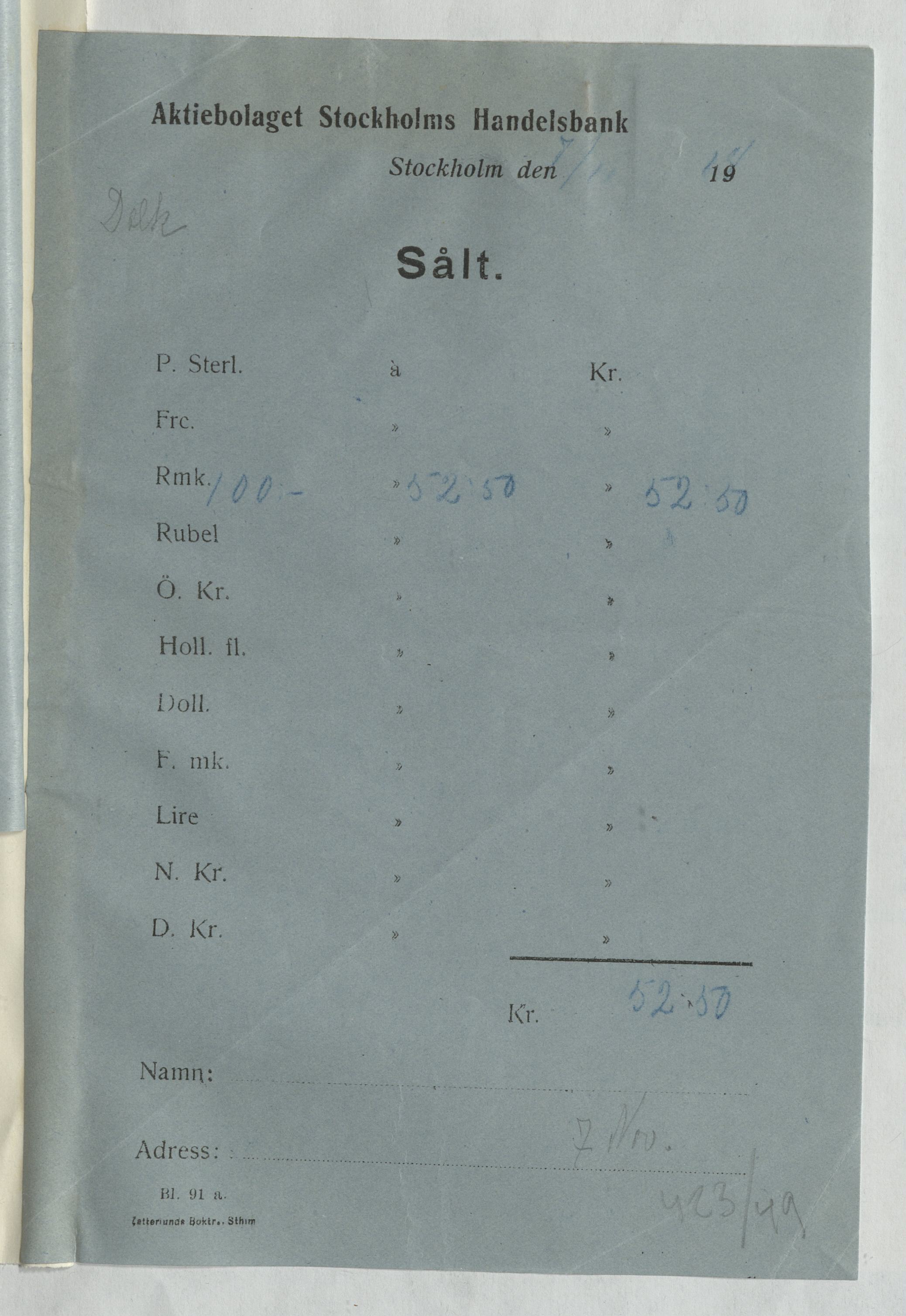 Verifikation från Stockholms Handelsbank AB, rörande växling av valuta.