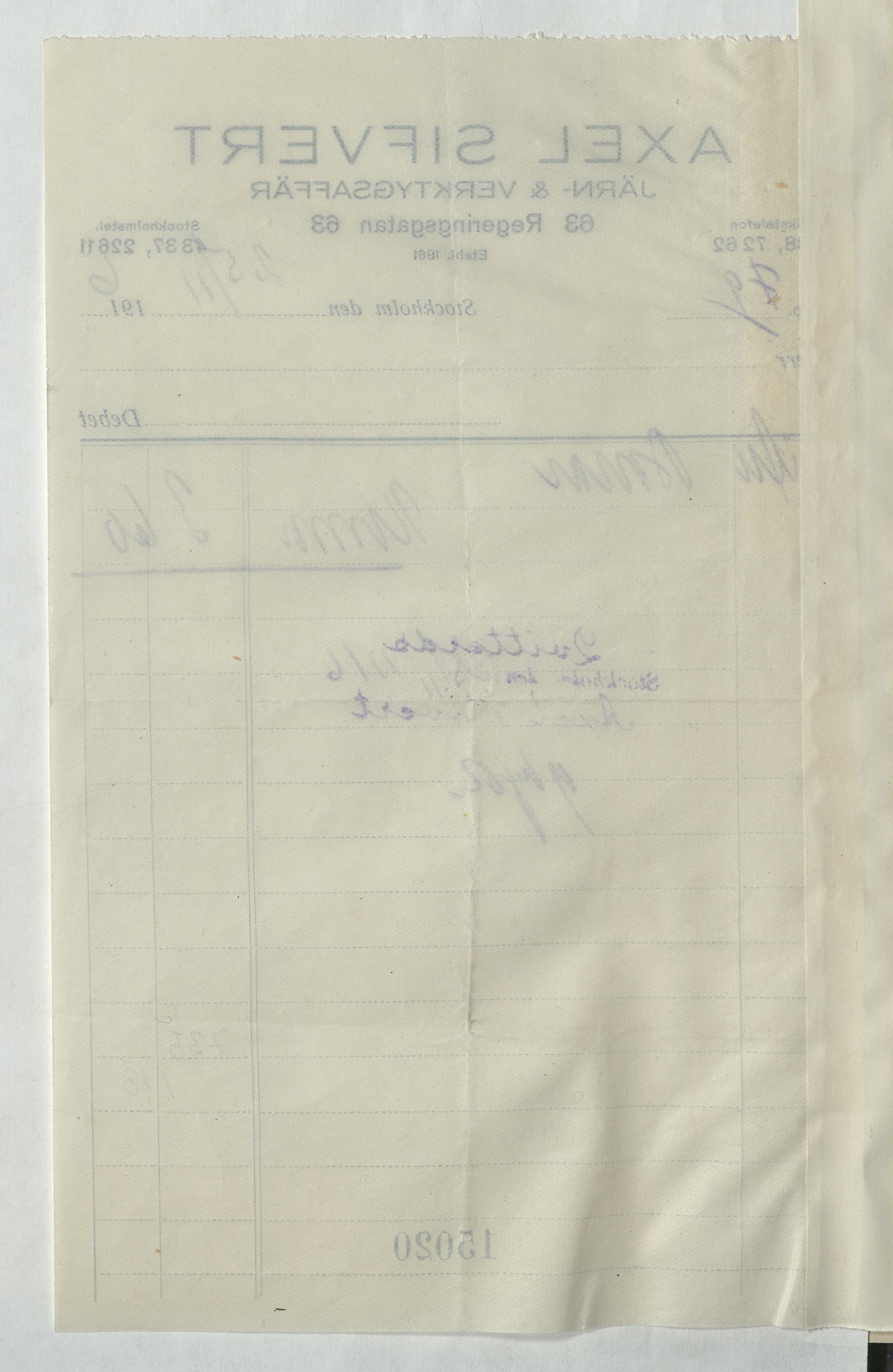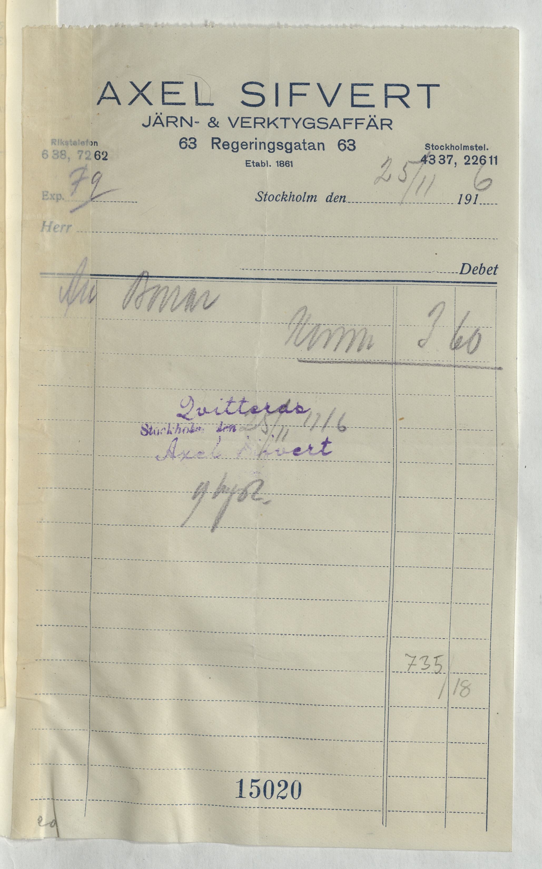 Kvitto från Axel Sifvert, Järn- och Verktygsaffär. Stockholm, 1916.