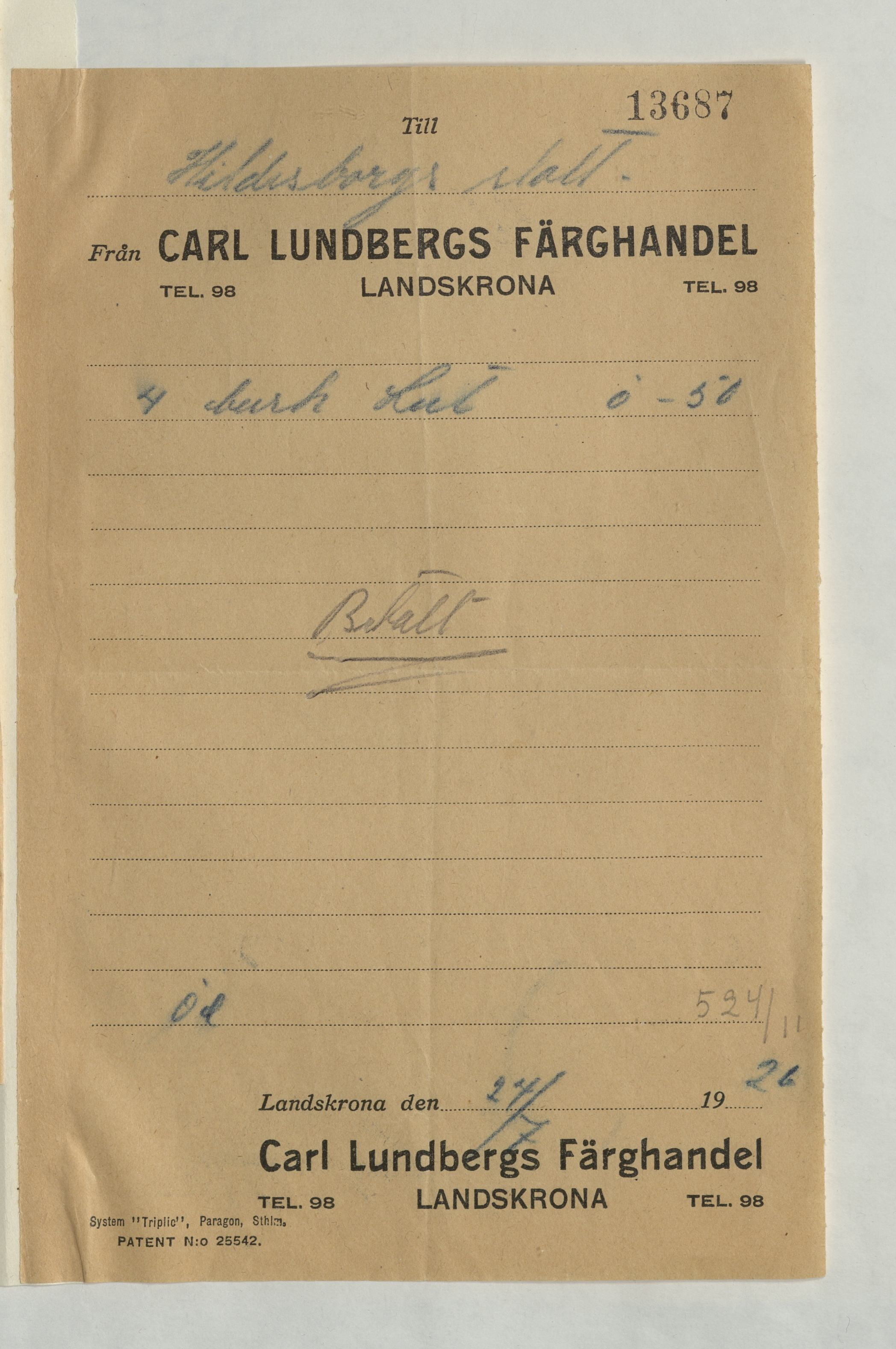 Kvitto från Carl Lundbergs Färghandel, Landskrona. Betald 24 juli 1926.