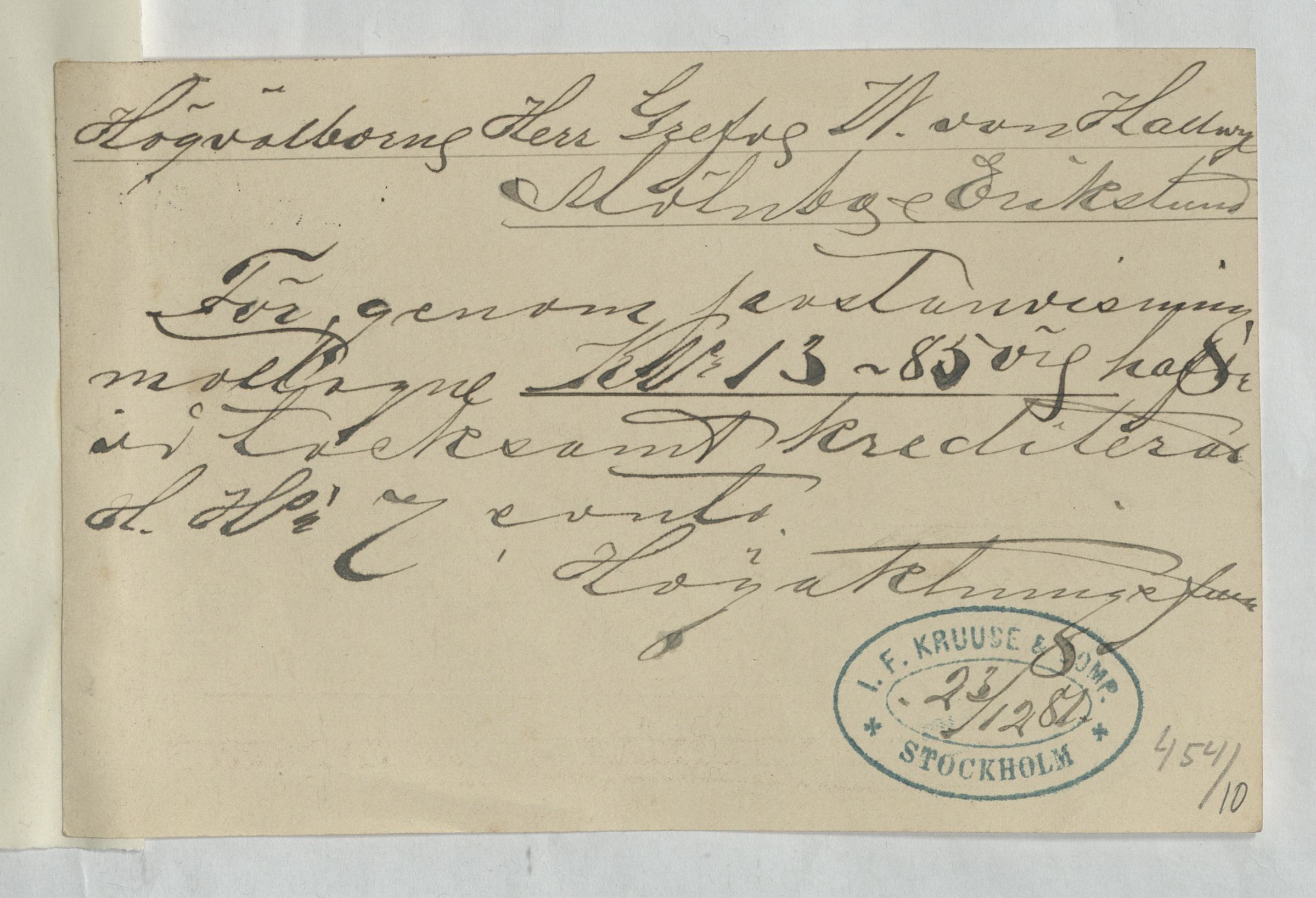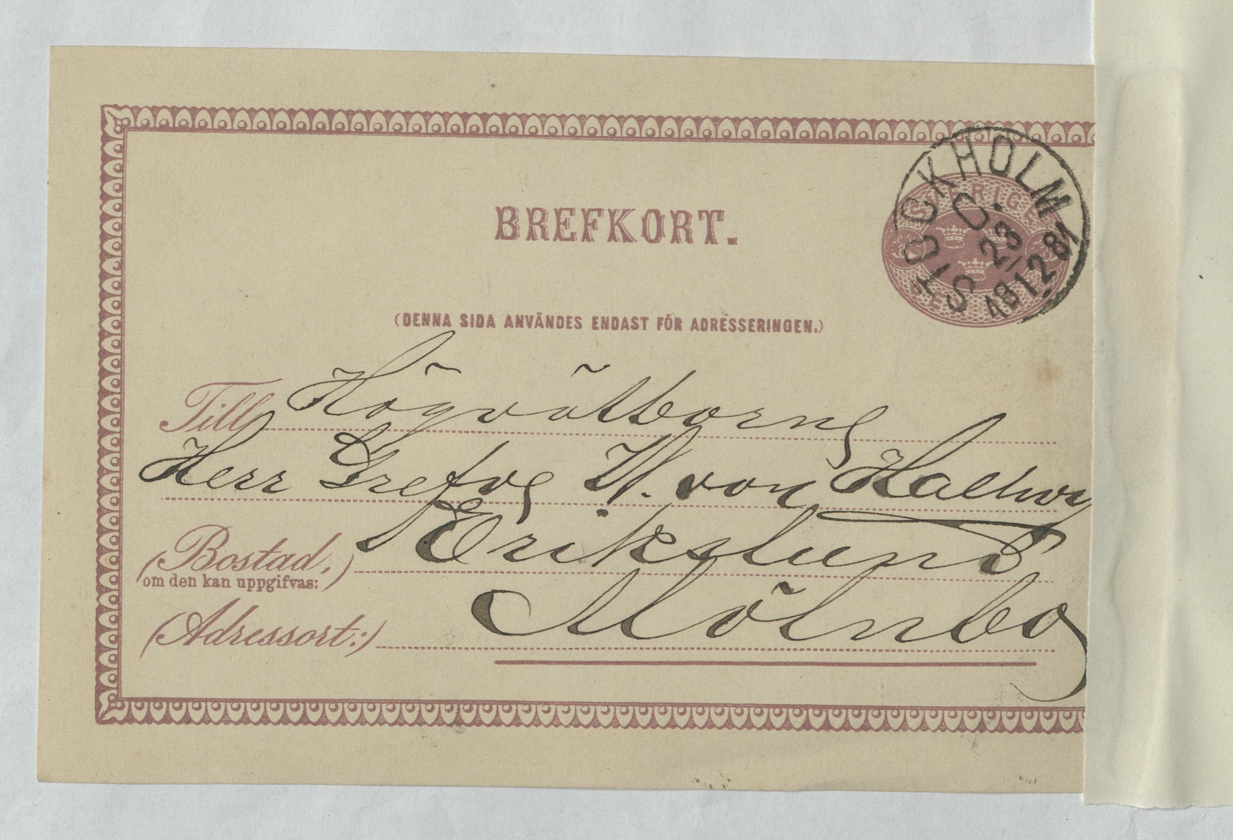 Brevkort från J. F. Kruuse & Co gällande inbetalning. Stockholm, 1881.