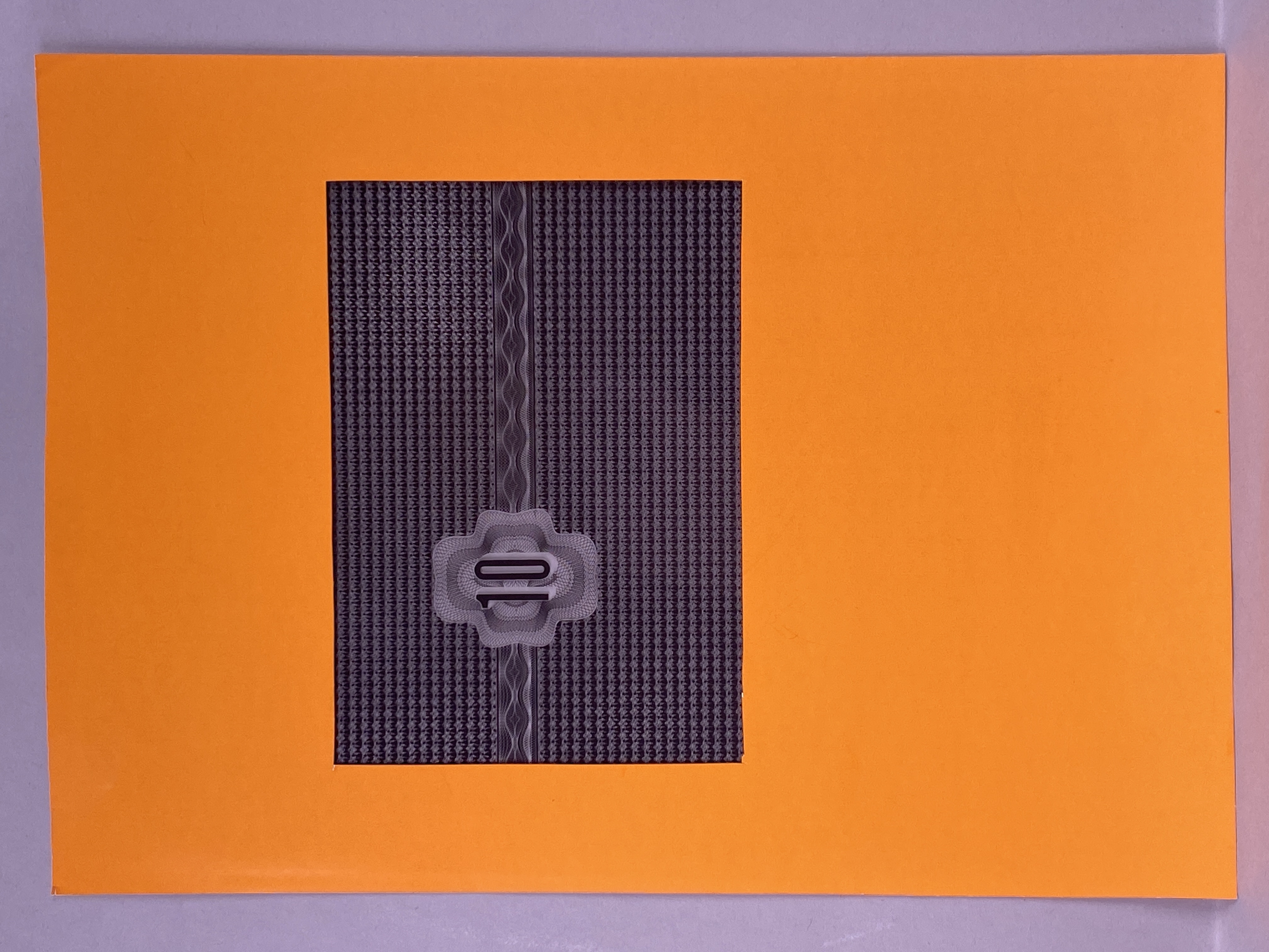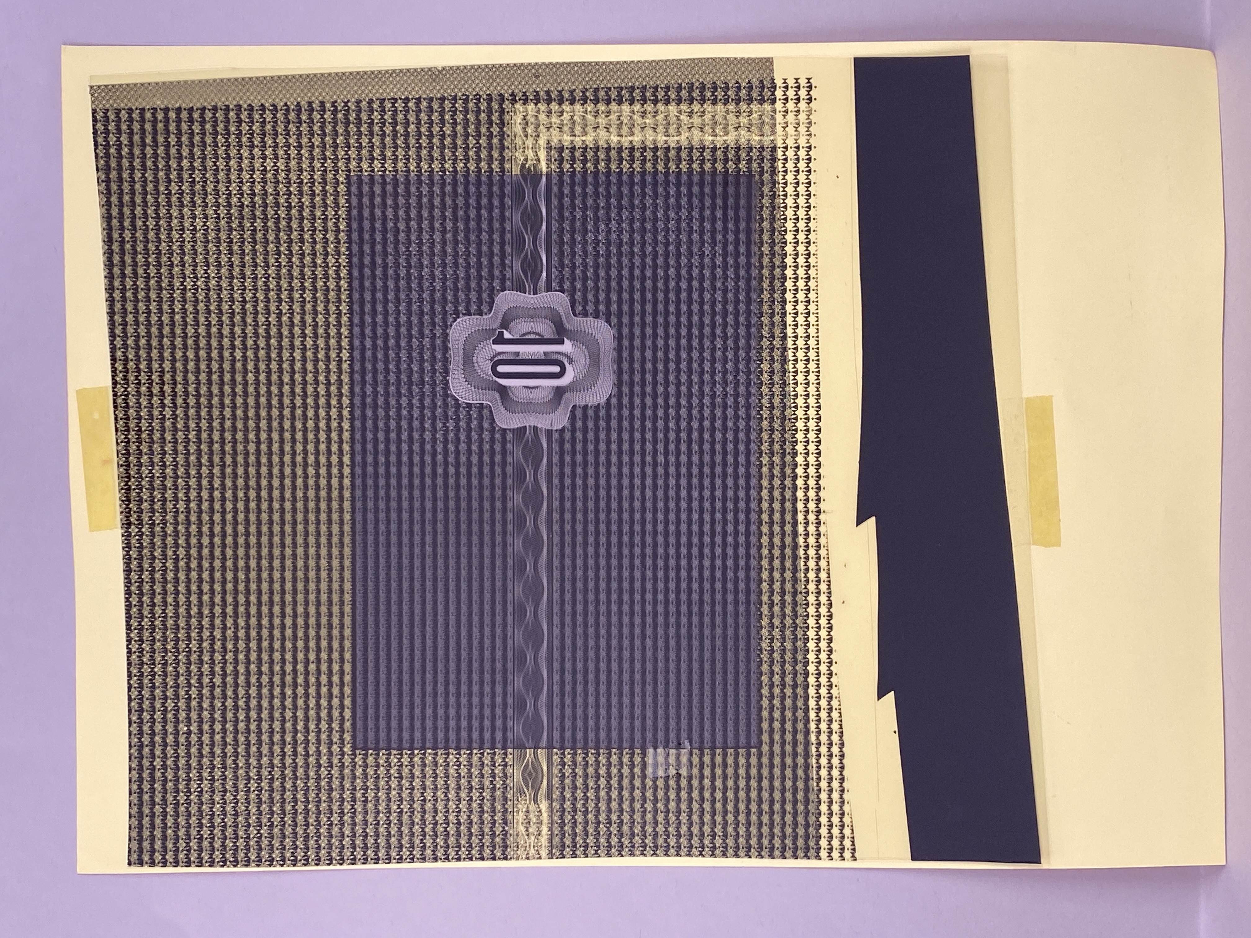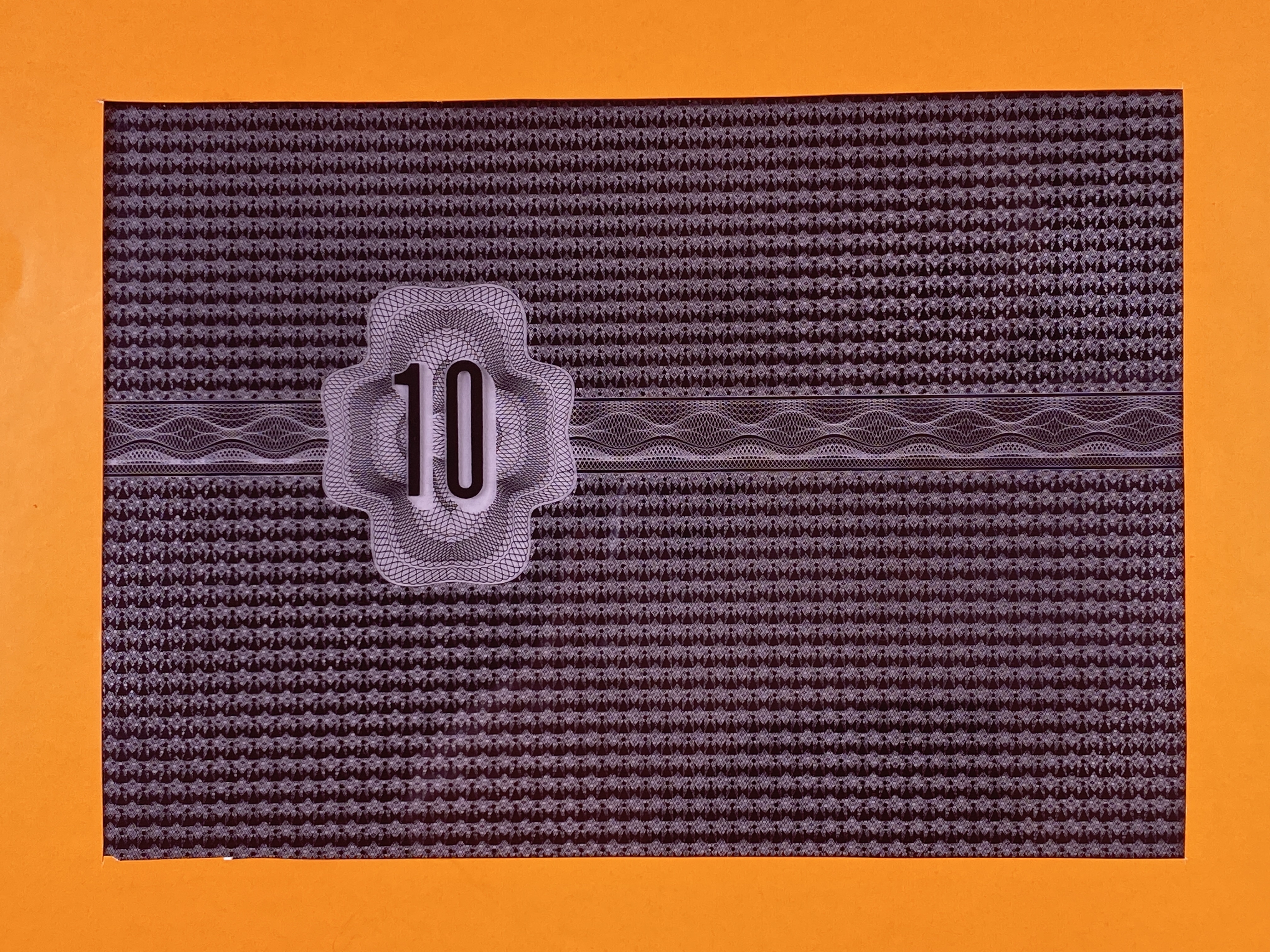 OH-film med ram. Ett designförslag på presentkort (bakgrund) som gäller för inköp på Åhléns mm, 10 kronor. Svart motiv tryckt på overheadfilm/skrivfilm. Jfr. med slutprodukt 3145701.