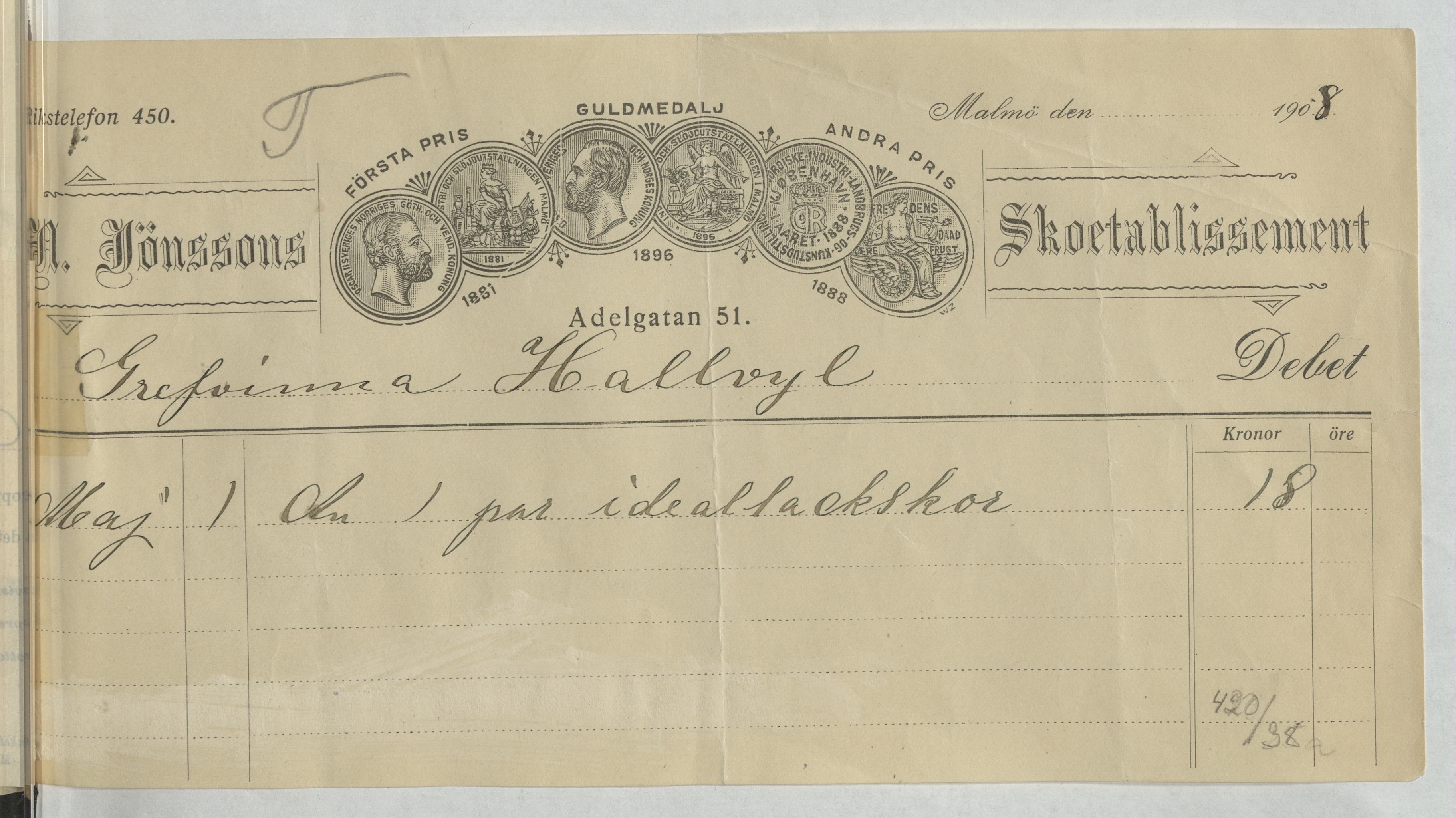 Kvitto från N. Jönssons Skoetablissement. Gällande inköp av ett par ideallackskor. Malmö, 1908.