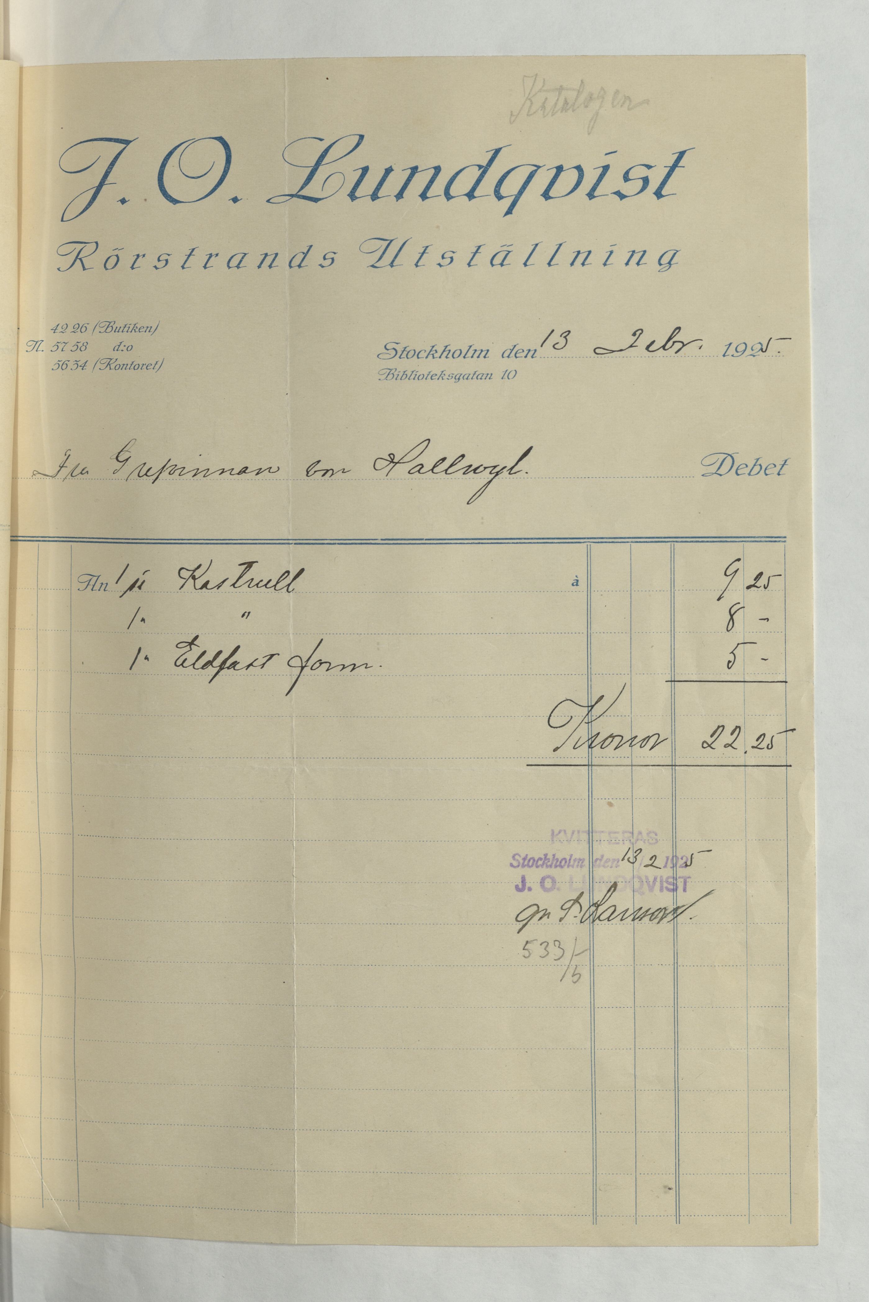 Kvitto till Fru Grevinnan Hallwyl för inköp av 1 st Kastrull och 1 st Eldfast form, hos J. O. Lundqvist, Rörstrands Porslins-Magasin, för en summa av 22:25Kr. Stockholm 13 februari 1925.