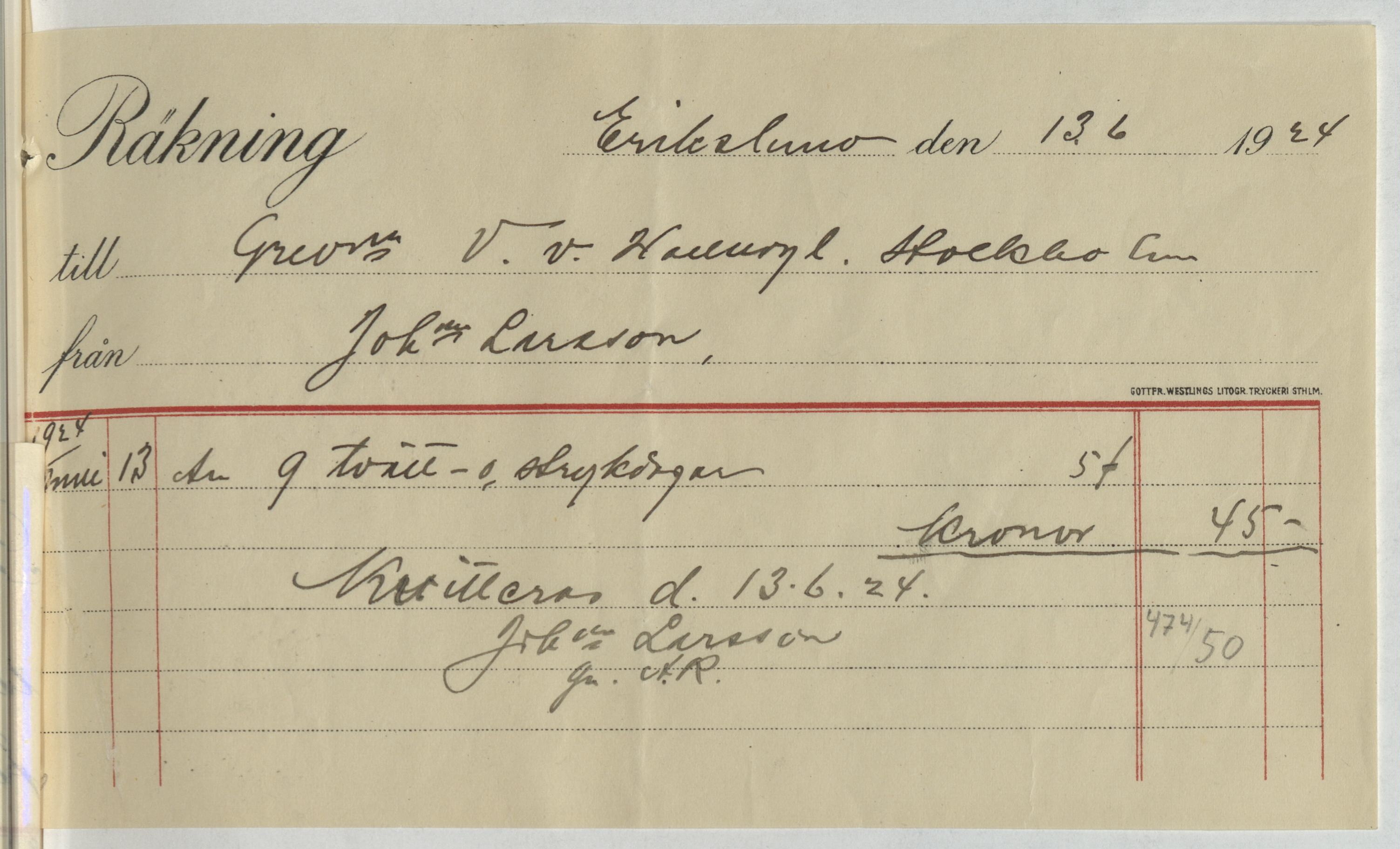 Kvitto från Johanna Larsson i Erikslund. Gällande 9 tvätt- och strykdagar. Erikslund, 1924.