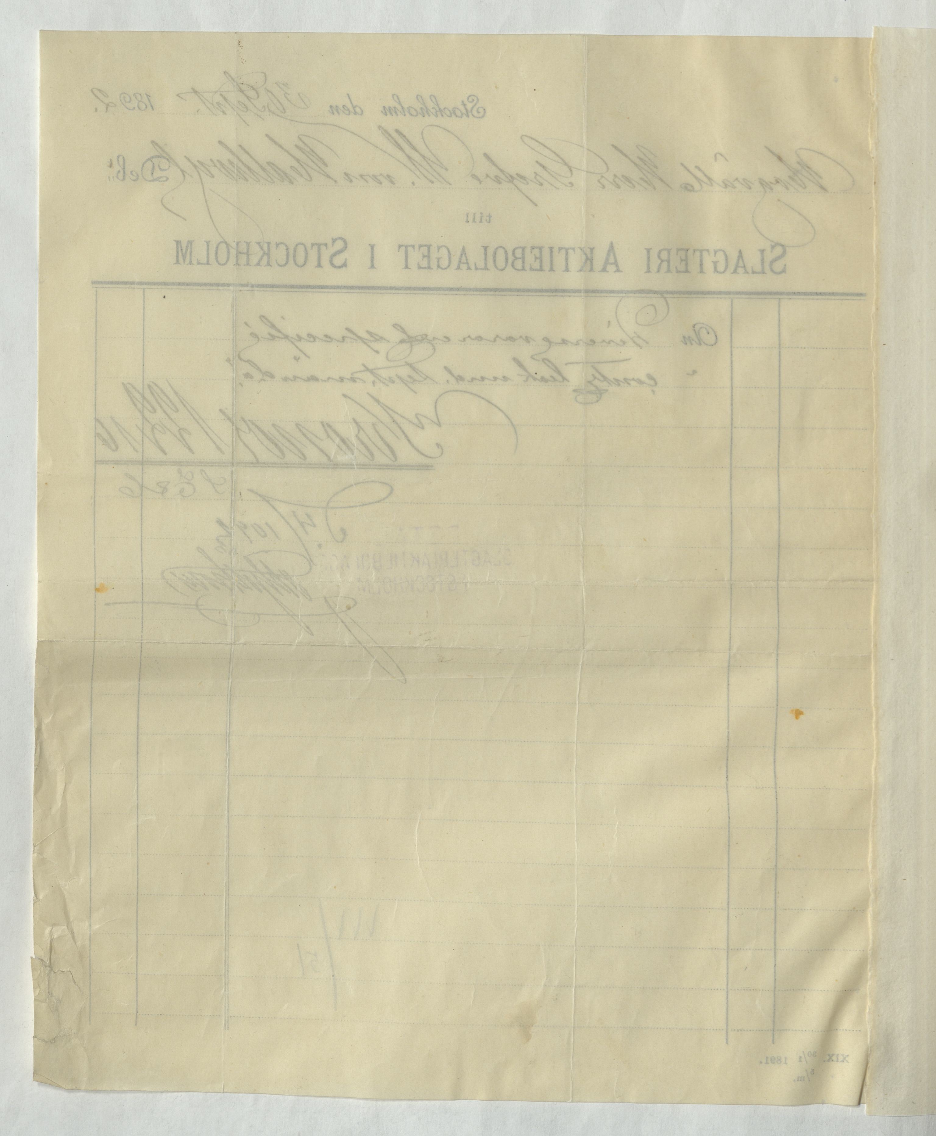 Kvitto från Slagteri Aktiebolaget i Stockholm