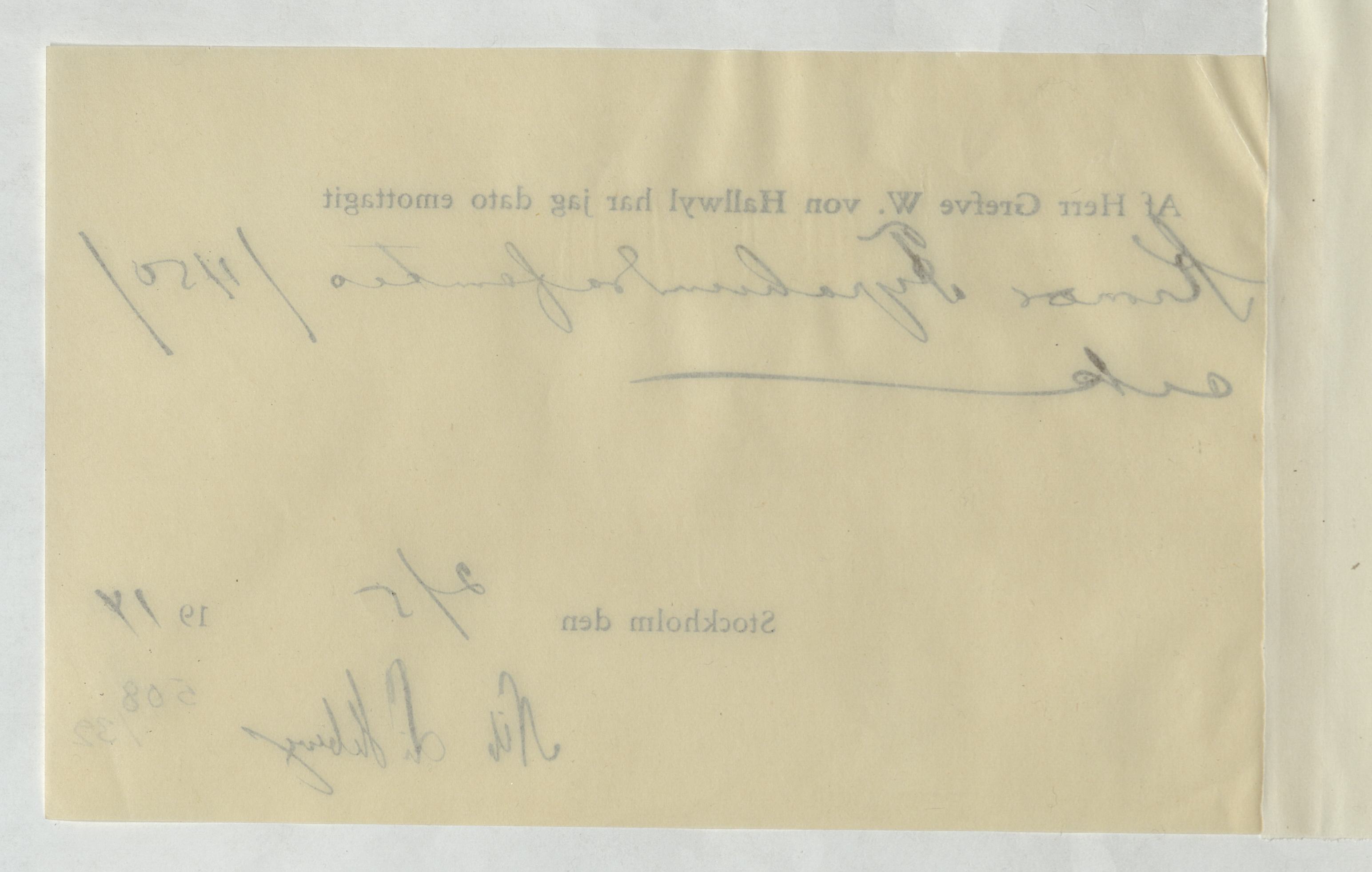 Kvitto gällande pengatransaktion mellan Walther von Hallwyl och Nils Lithberg. Stockholm, 1914.