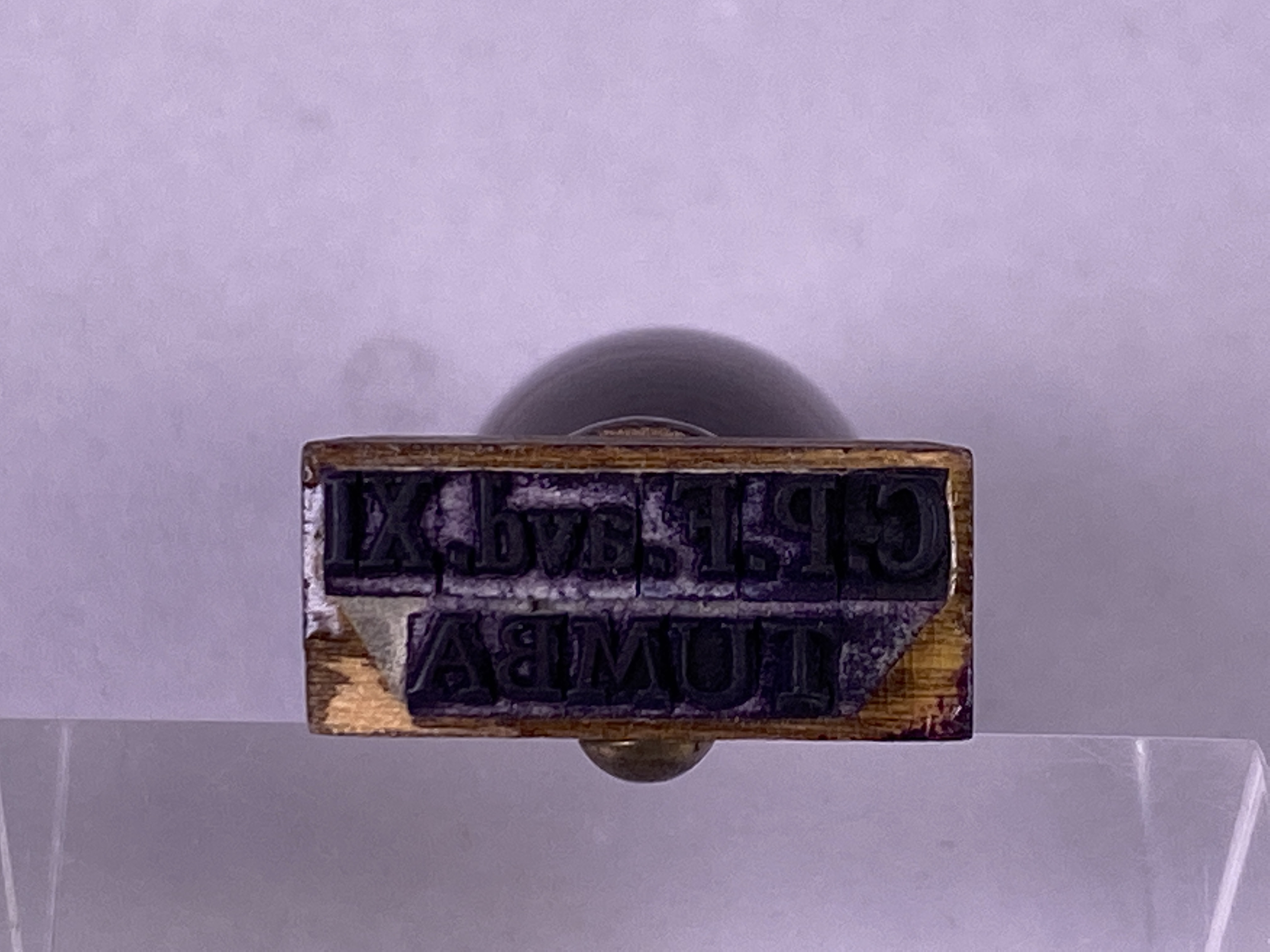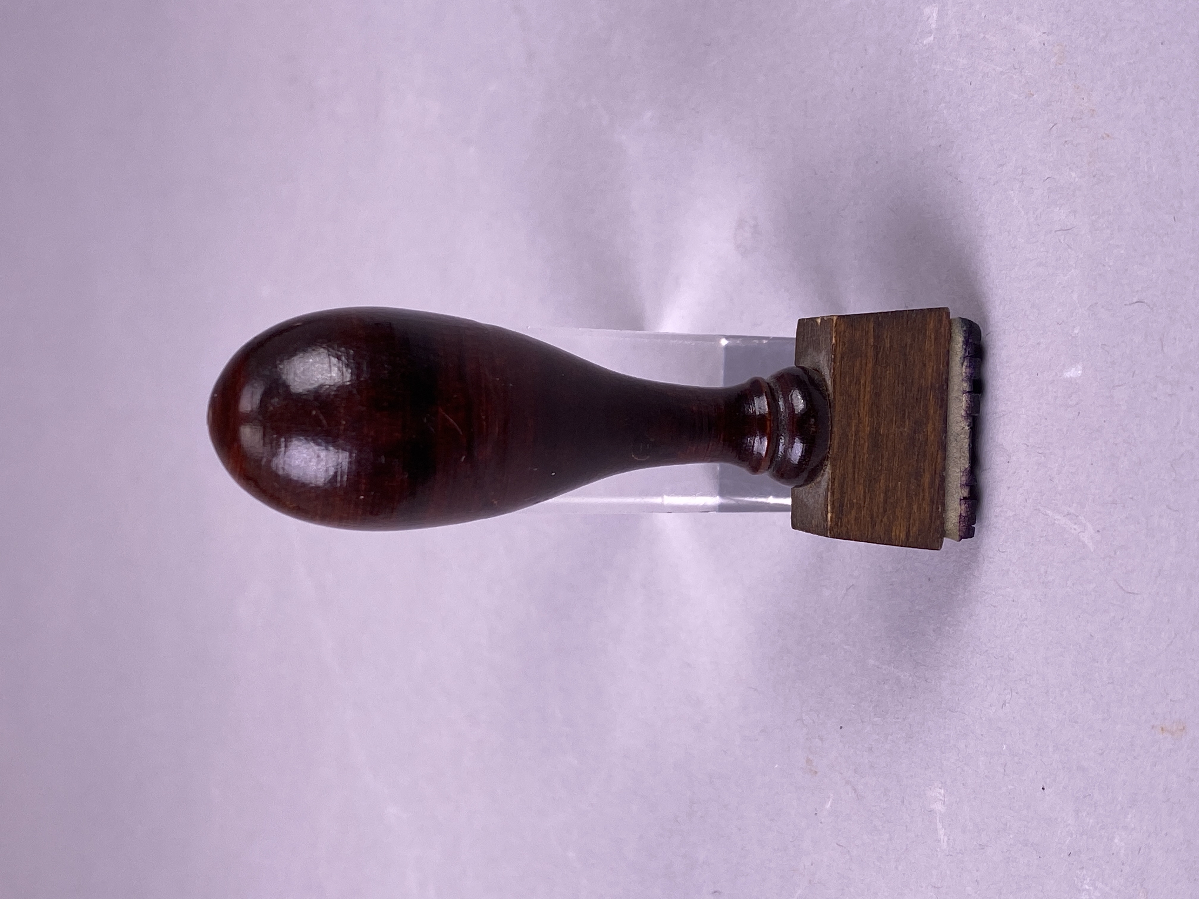 Stämpel med stämpeltext: "C. P. F. avd. XI TUMBA". Gummistämpel med droppformat handtag i trä.