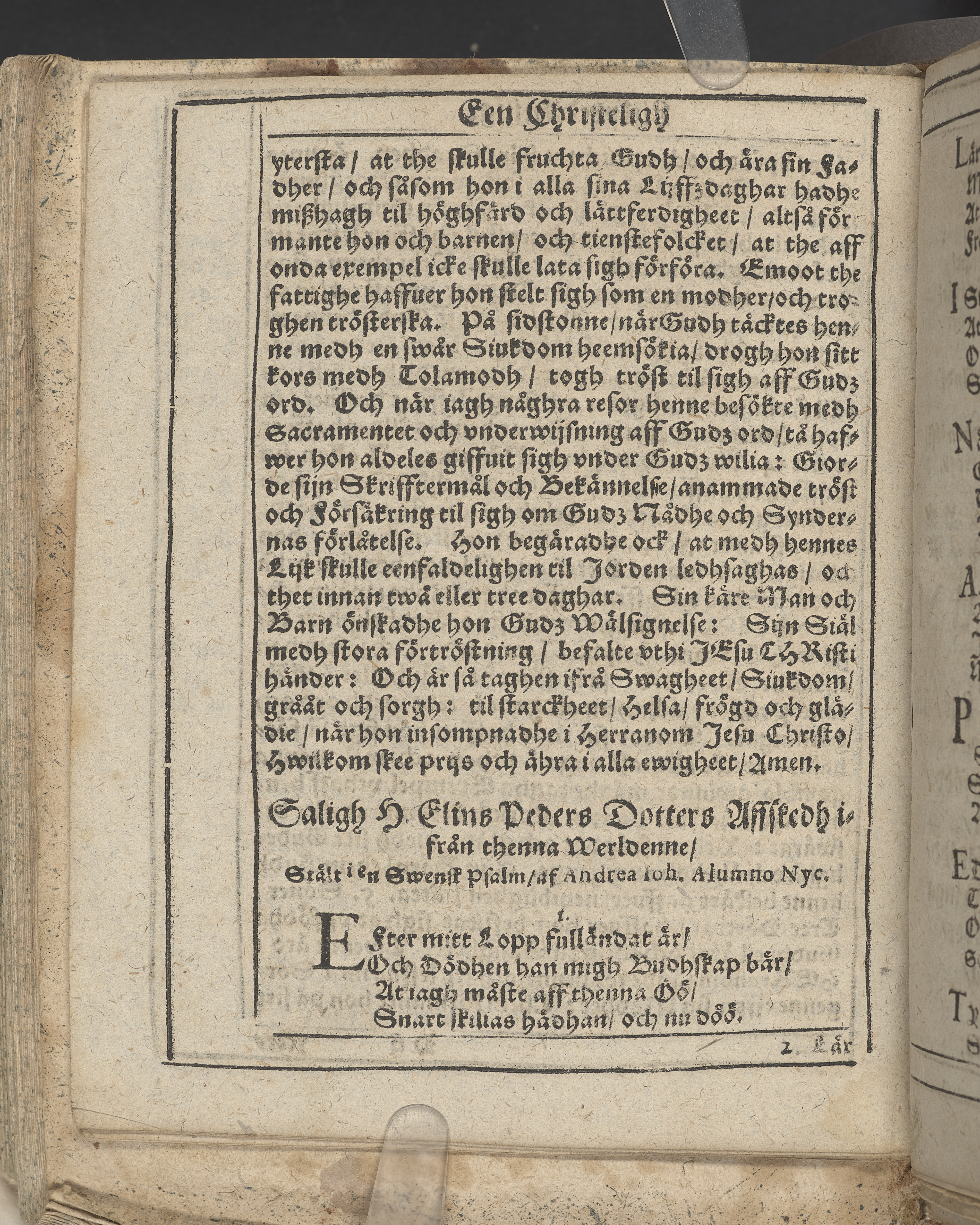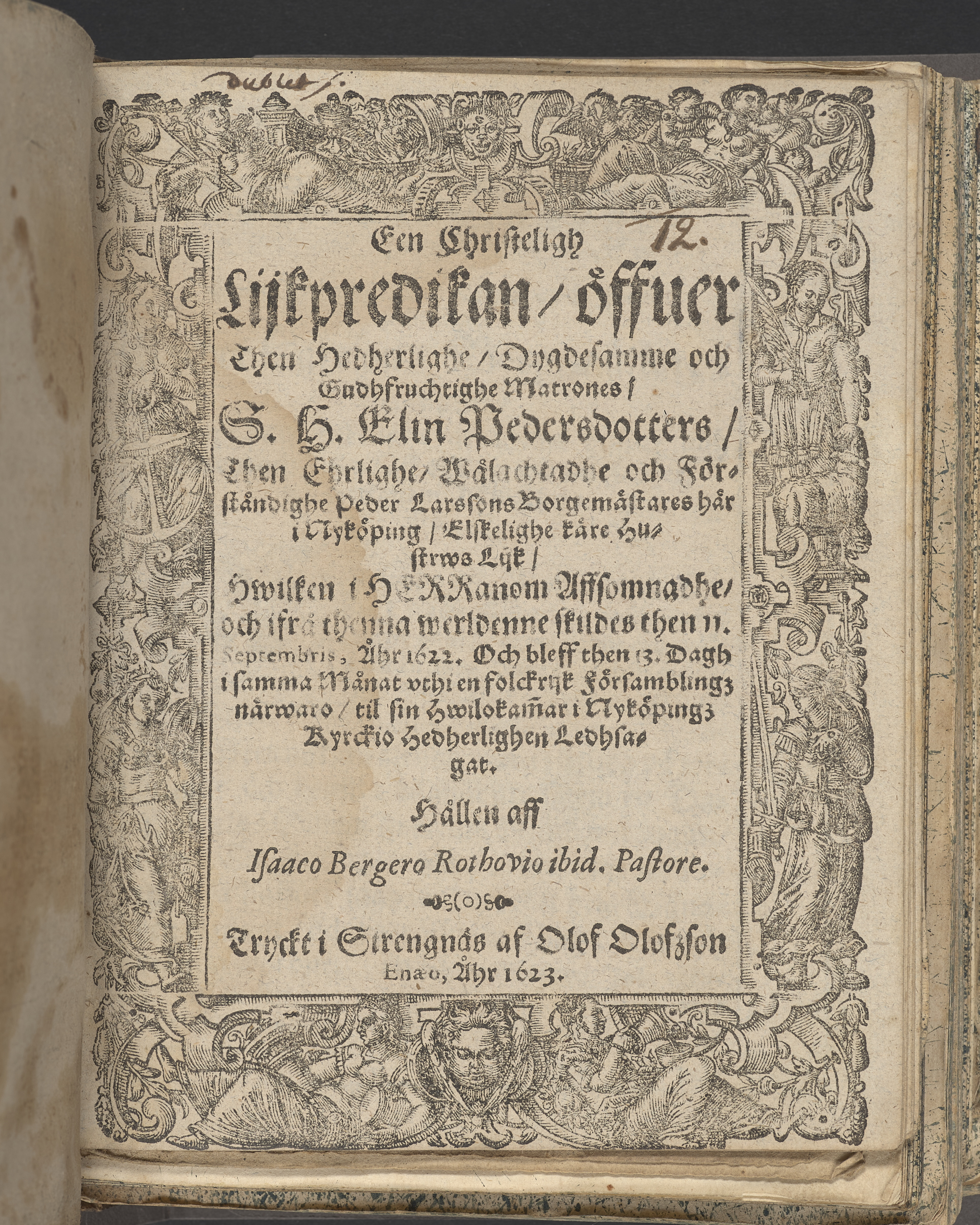 Een christeligh lijkpredikan, öffuer Elin Pedersdotters ... Peder Larssons borgemästares här i Nyköping, elskelighe käre hustrws lijk, hwilken i herranom affsomnadhe, och ifrå thenna werldenne skildes then 11. Septembris, åhr 1622. Och bleff then 13. dagh i samma månat vthi en folckrijk församblingz närwaro, til sin hwilokam[m]ar i Nyköpingz kyrckio hedherlighen ledhsagat. Hållen aff Isaaco Bergero Rothovio ibid. pastore.