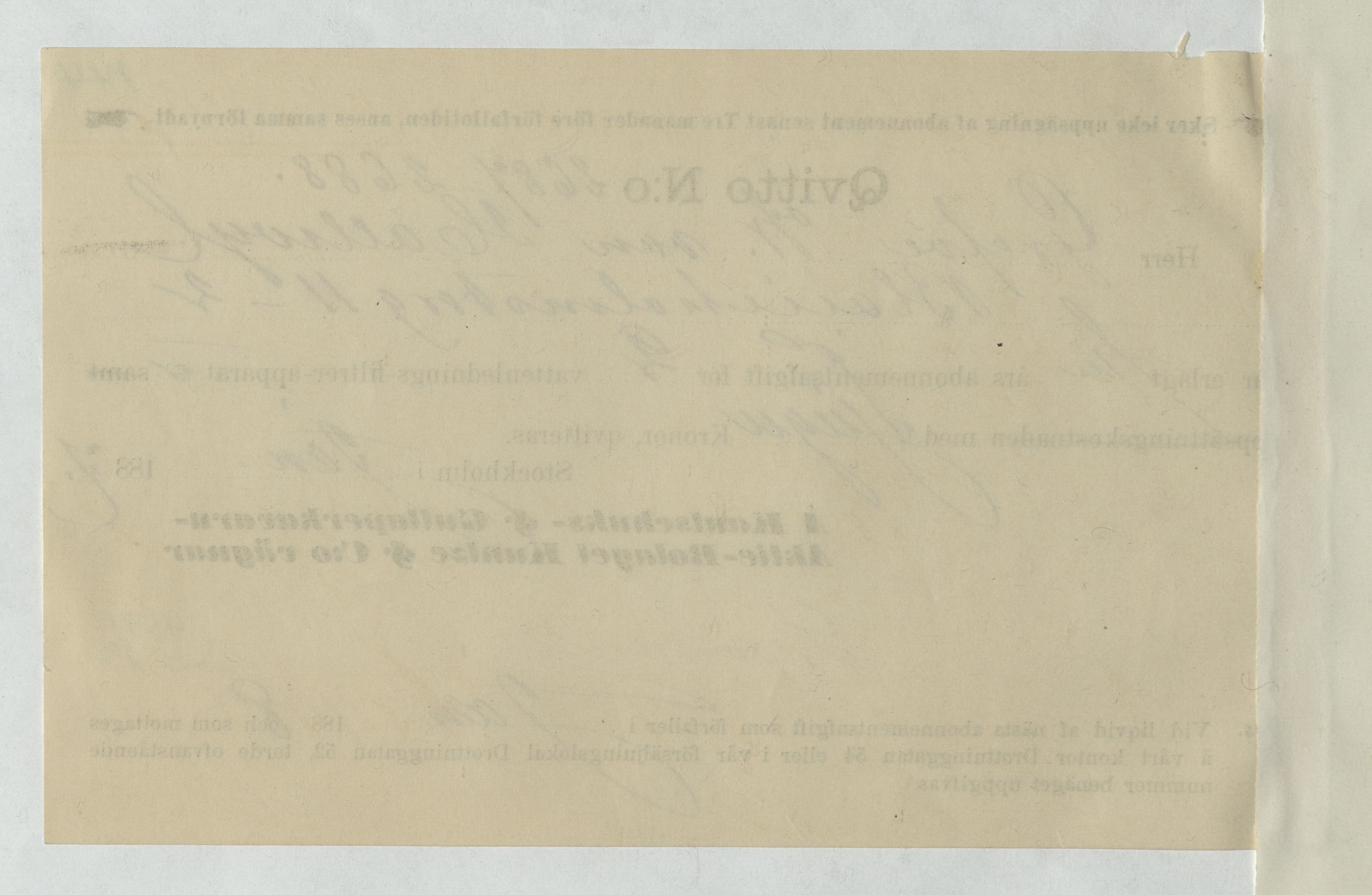 Kvitto från Kautschuks- & Guttaperkavaru-Aktiebolaget Kuntze & Co. Gällande betalning av abonemangsavgift för vattenlednings-filter-apparat.