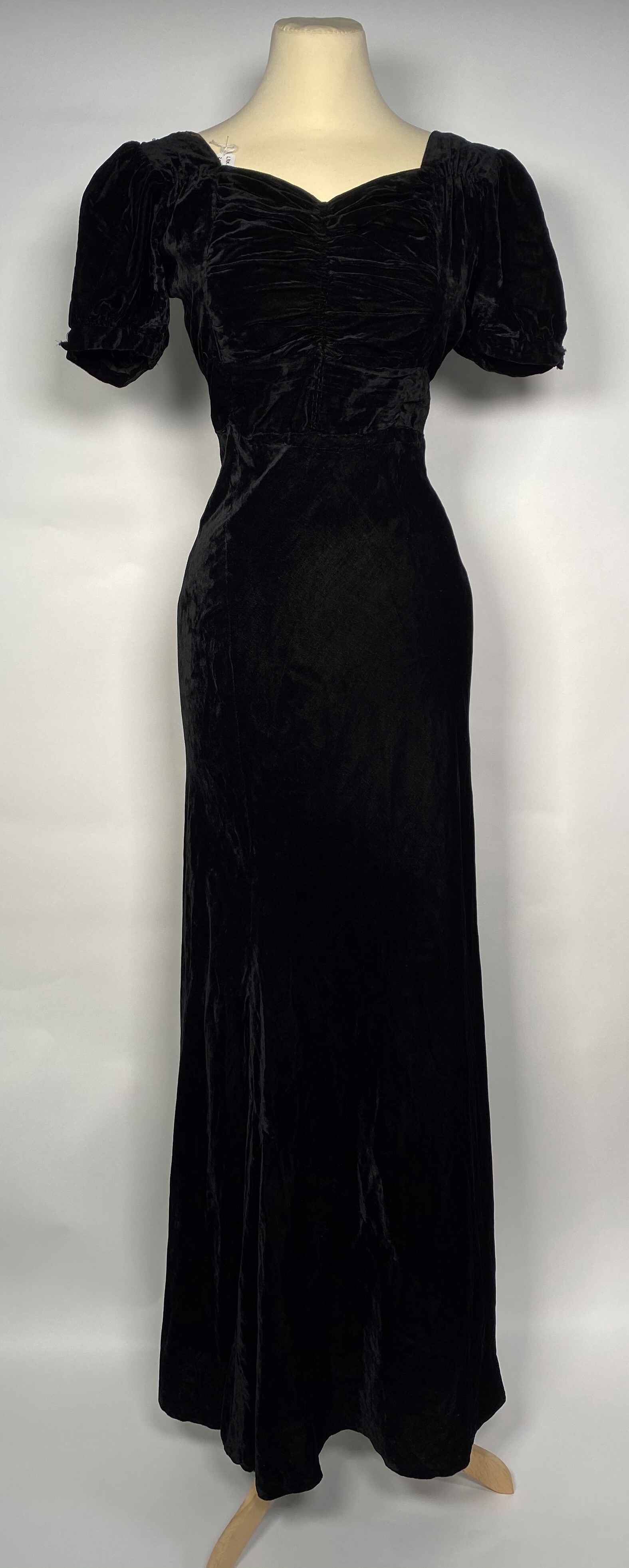 Hovdräkt i svart silkessammet buren av Britta Mannerfelt (1916-2004), gift Starnert, vid couren på Stockholms slott den 23 januari 1937. Består av ett livstycke, en kjol och två ärmar. Klänningen är figursydd och syddes av Britta själv på en sykurs i Mariestad hösten 1936. Omsydd. Livet består av ett mittstycke, två främre sidostycken och två bakstycken. Mittstycket är rynkad mitt fram och veckad mot sidstyckena. Mittstyckets rynkning skapar en hjärtformad urringning. På båda sidstyckena är tyget rynkad mellan axelpartiet och ärmhålen. De två bakstyckena möts mitt bak. I ryggen är urringningen lätt v-formad. Urringningens fåll är enkelvikt med 0,5 cm med svart silkestråd och krejsöm. Livet är förlängt med ett infällt parti, 4-7 cm brett, mellan livet och kjolen. Det infällda partiet matchar livet i sin utformning. Korta puffärmar fastsydda i livet. Ärmarna är tvåsömsärmar. Båda vid ärmöppningen och vid axeln är ärmarna rynkade. Ärmöppningen är avslutad med ett 2,5 cm brett sammetsband av samma tyg. Ärmarna är ett senare tillägg; till couren på Stockholms slott den 23 januari 1937 bars två gallerärmar till klänningen (se inv.nr. 35528-29) Livet och kjolen är sammanfogade med en maskinsöm. Kjolen är sydd på skrådden och består av ett fram- och bakstycke. Fram- och bakstycket har i nederkant blivit skarvade. Sömsmånen i skarvningen är stadkanter. Framstyckets skarvning består av två hopsydda bitar. Kjolen är sydd ihop med maskin och sömsmånen har lämnats råa. Kjolens trädda fåll är enkelvikt, 0,5- 1 cm, och sydd för hand. Det finns spår av omsömnad i överkant av kjolens framstycke. I vänster sidsöm sitter en 35 cm lång dragkedja. Dragkedjan följer livet och kjolens vänstra sidsöm.