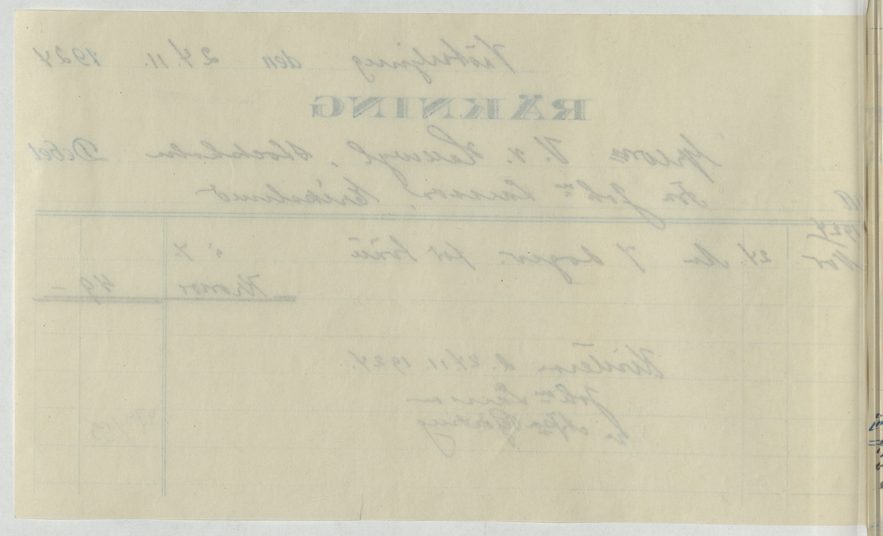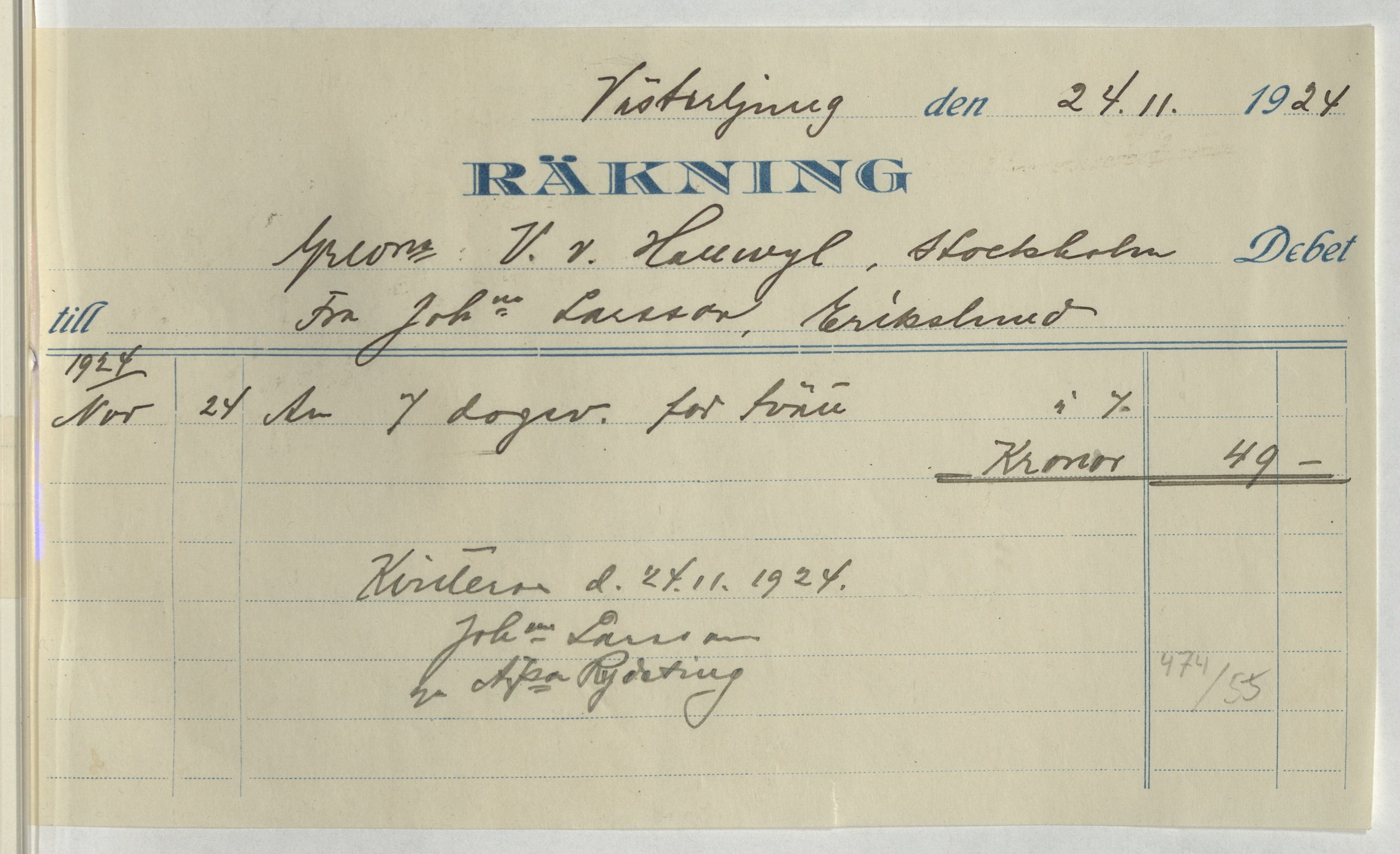 Kvitto från Johanna Larsson vid Erikslund. Gällande 7 dagar för tvätt. Västerljung, 1924.